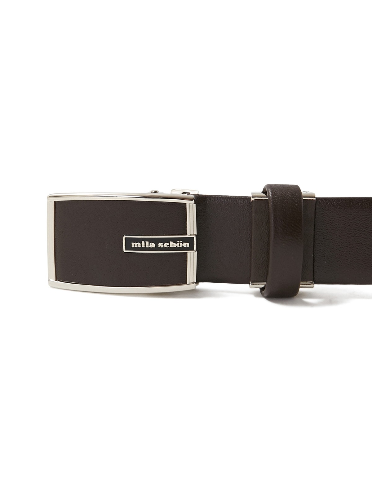 滑らかで自然な艶感が特徴のレザーを使用しています。ボックス型のバックルには、ミラ・ショーンのロゴを配置。ステッチを掛けずに仕上げているので、シャープかつエレガントな雰囲気となっています。スタンダードで使いやすく、実用性が高いので、プレゼントとしてもおすすめの1本です。