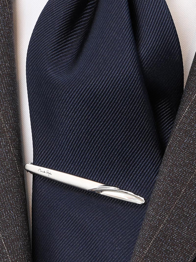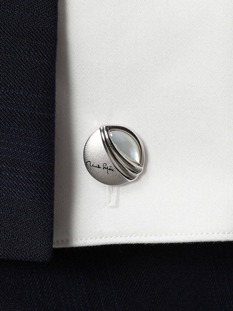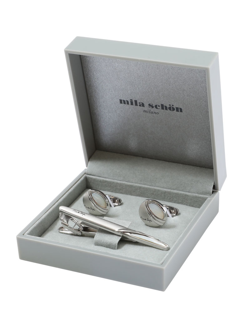 羽根のようなデザインと白蝶貝が印象的なタイバー&カフス。