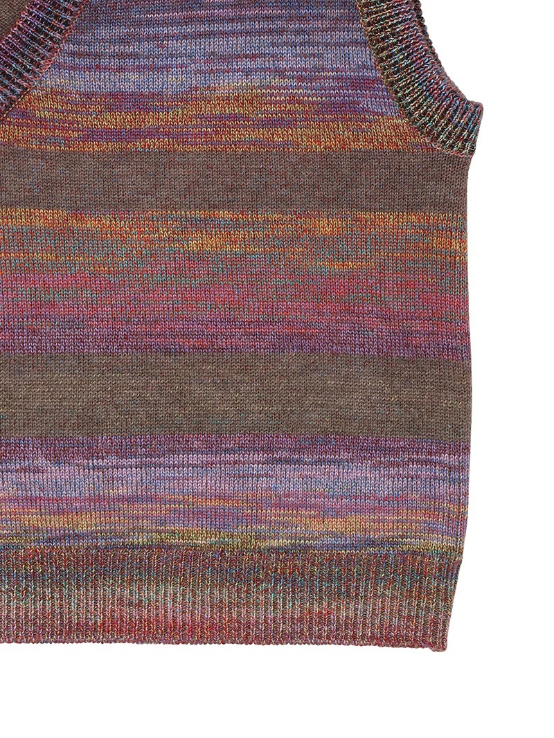 マルチカラーのカスリヤーンをミックスしてジャガード織で仕上げたベスト。アクセサリー感覚のミニ丈にしており、シャツと重ねたり、ジャケットのインナーにするなどレイヤードを楽しめるニットになっています。