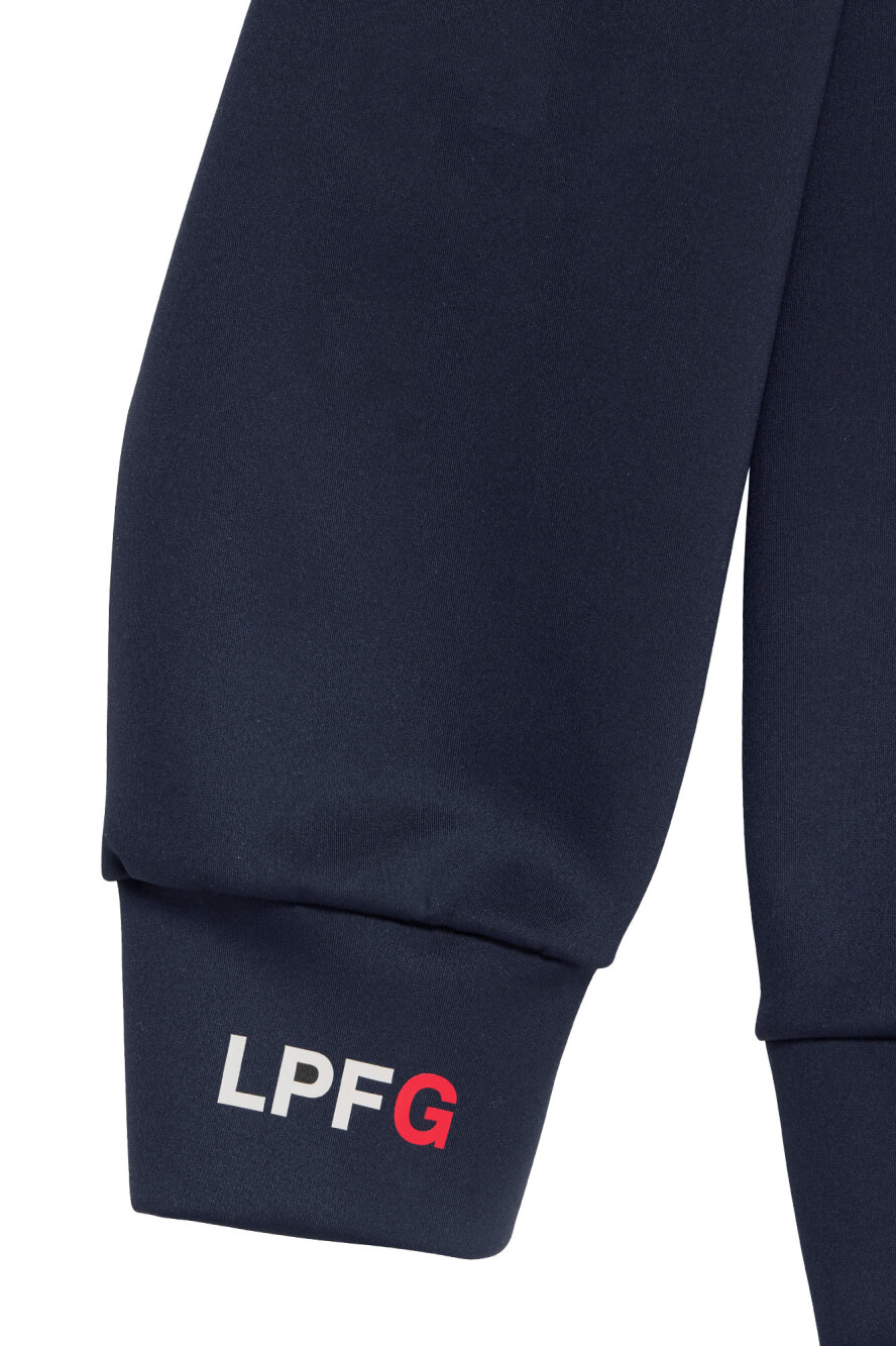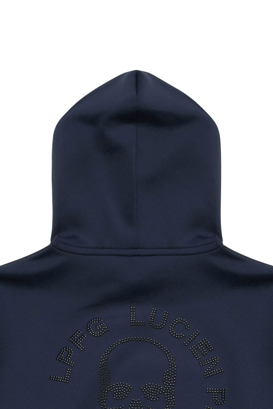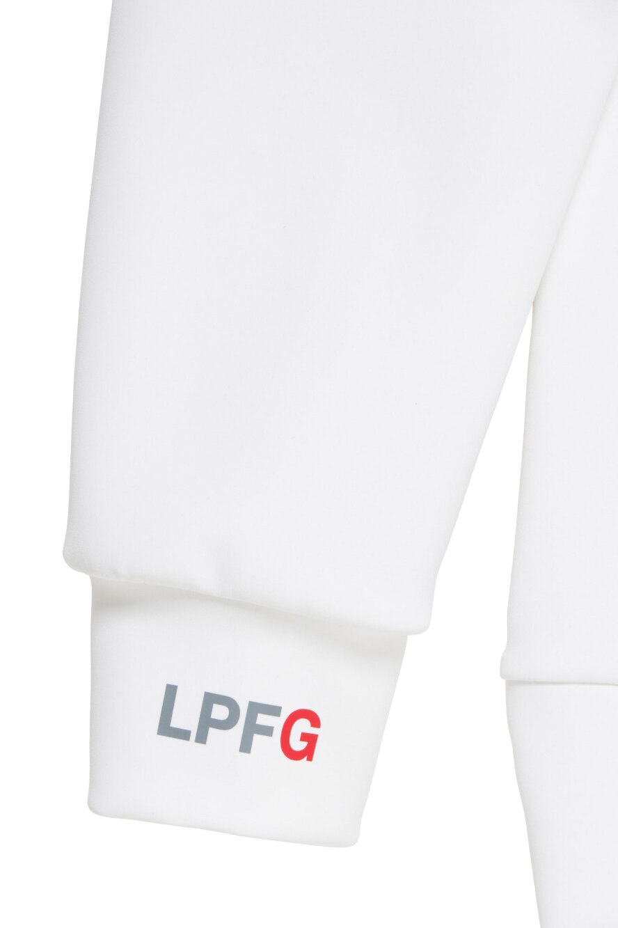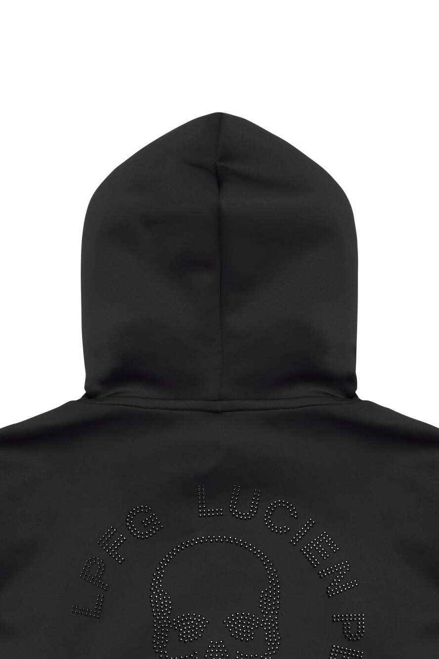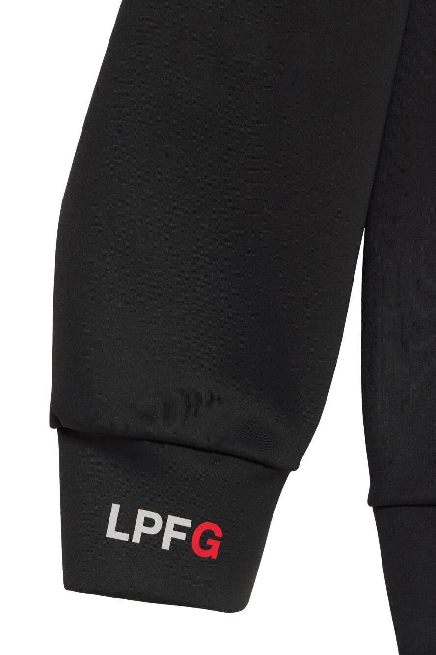LPFGのメンズプルオーバーフーディー。全方位へのストレッチ性を持つ超ハイゲージ(40G)のテック素材。エレガントかつ快適な着心地。LPFGロゴ、サークルロゴxスカル等、LPFGのアイコンとなるモチーフがワッペンやプリントで随所に表現されている。