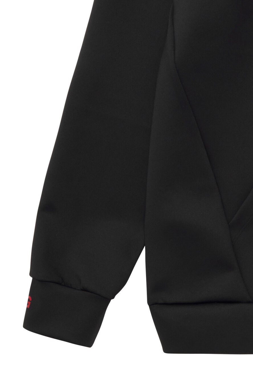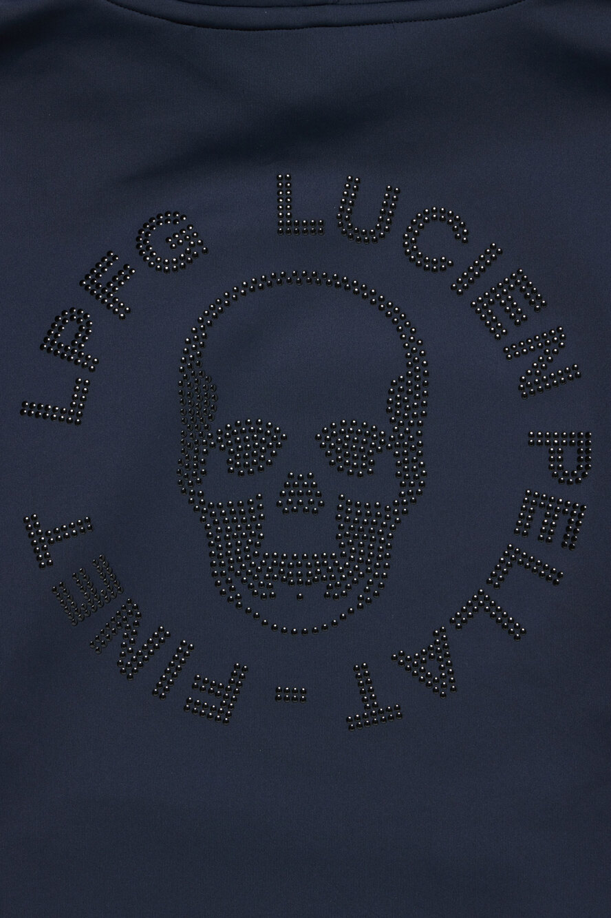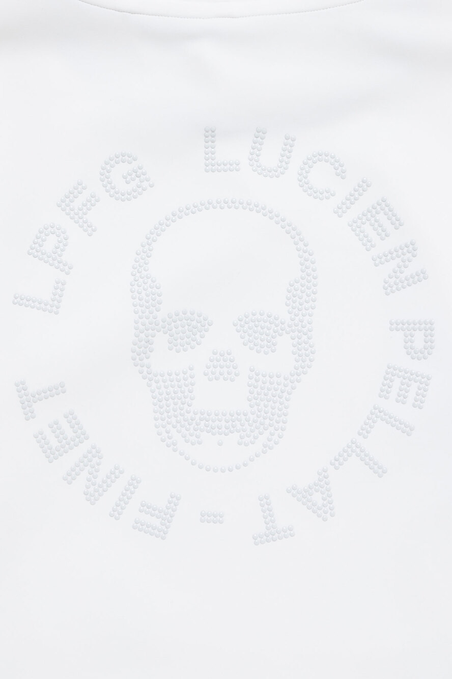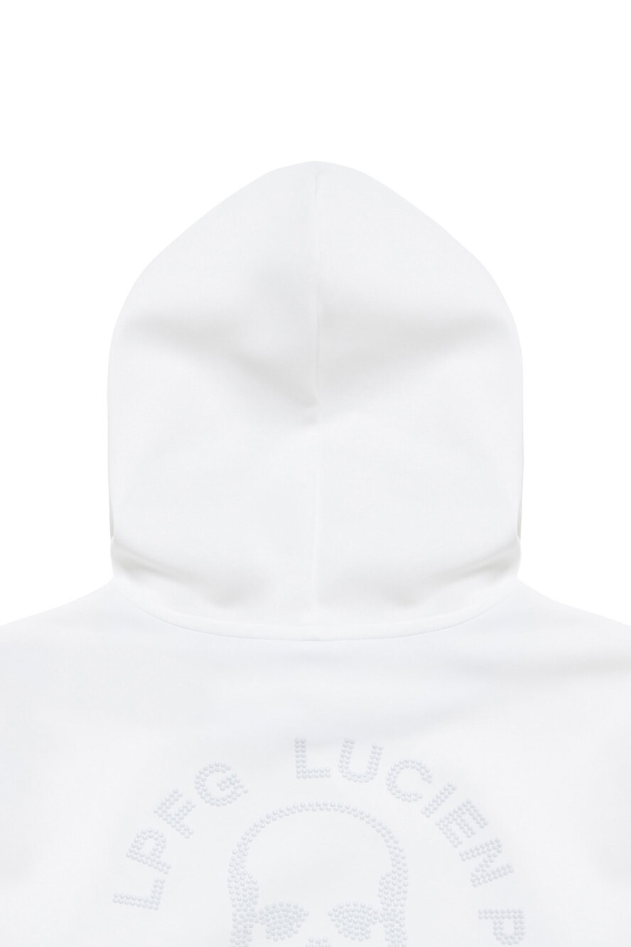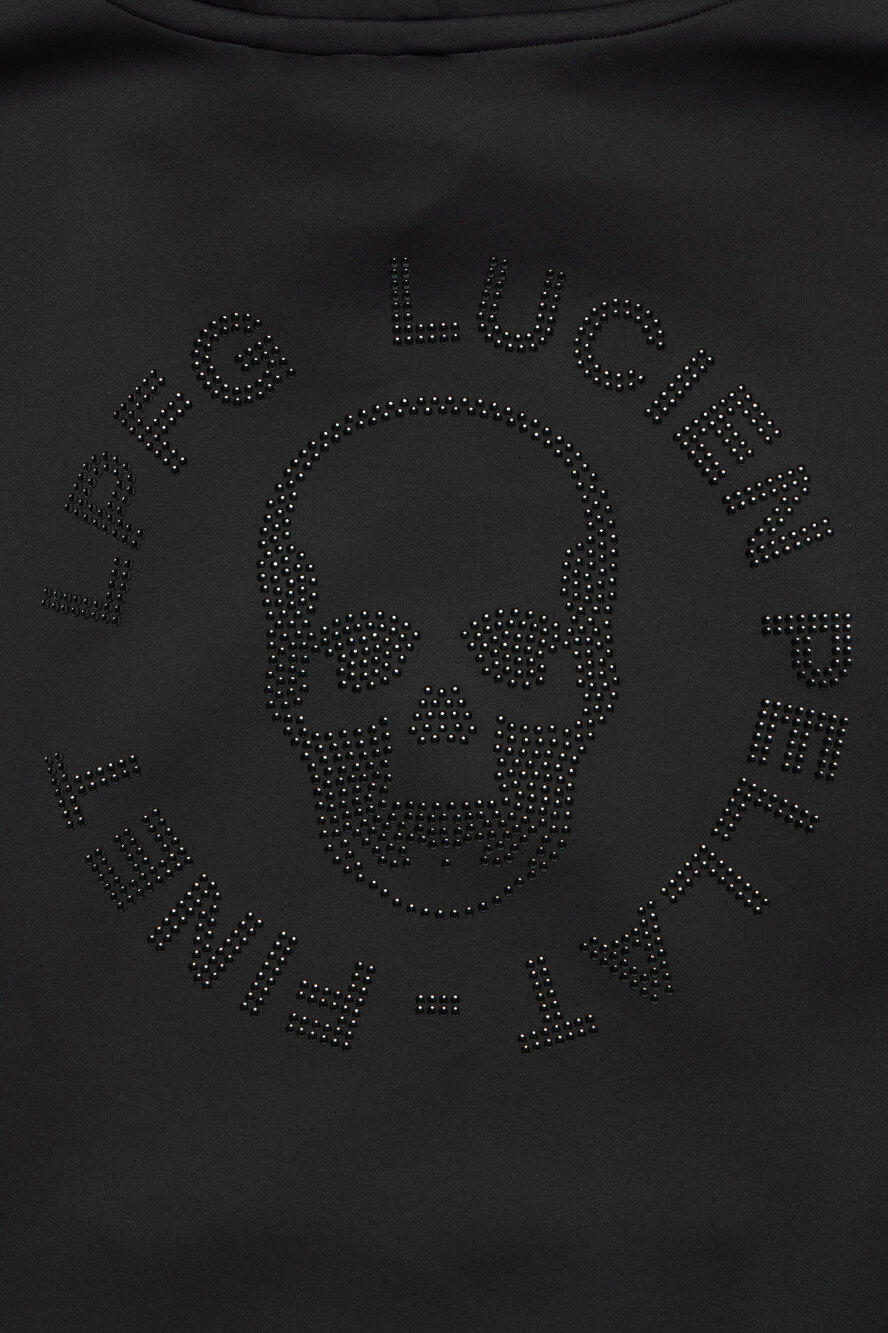 LPFGのメンズプルオーバーフーディー。全方位へのストレッチ性を持つ超ハイゲージ(40G)のテック素材。エレガントかつ快適な着心地。LPFGロゴ、サークルロゴxスカル等、LPFGのアイコンとなるモチーフがワッペンやプリントで随所に表現されている。