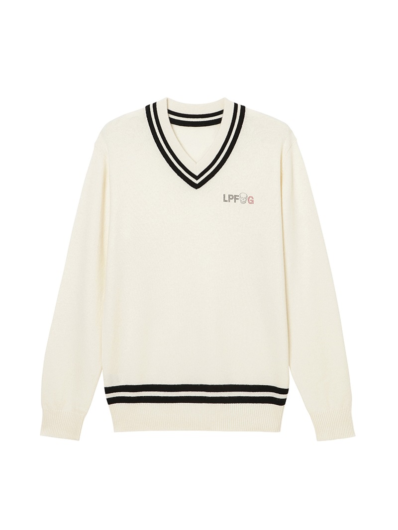 LPFGのメンズVネックセーター。上質なウールとカシミヤをブレンドしたもの。程よい肉厚感で保温性も抜群。ネック部分と、裾部分のバイカラーでの配色がポイント。