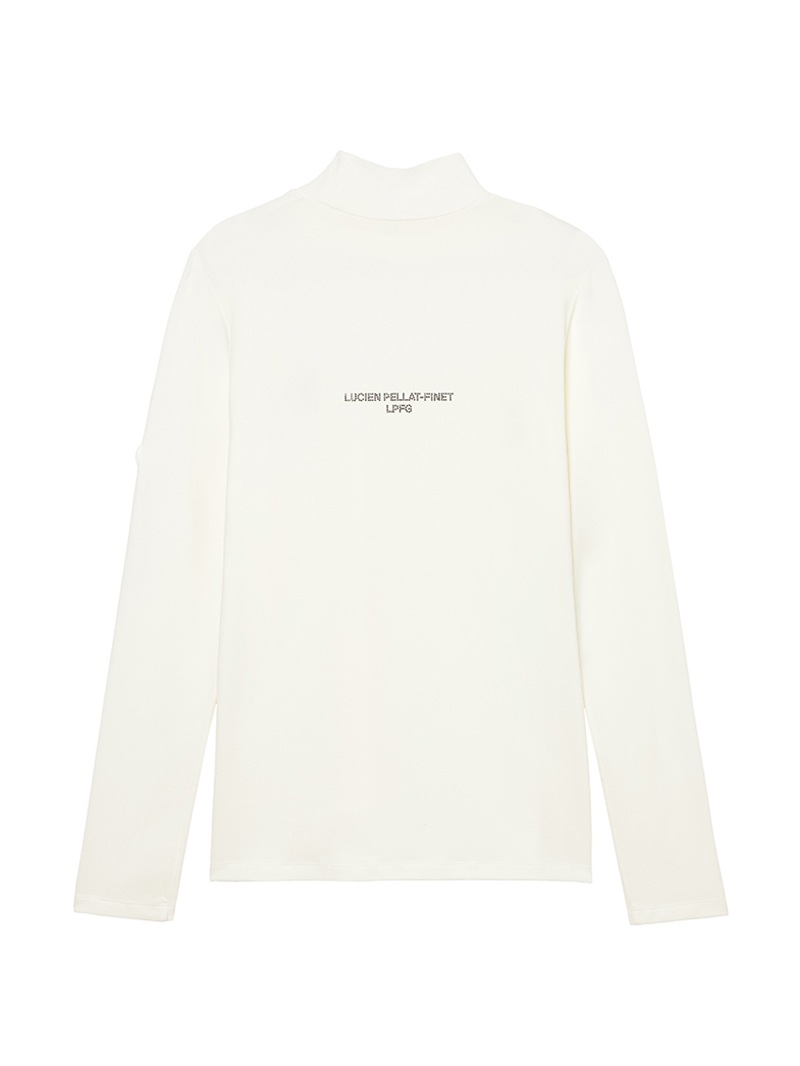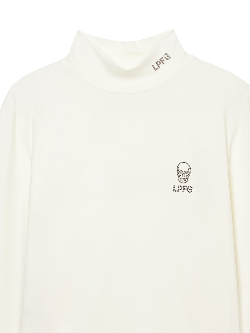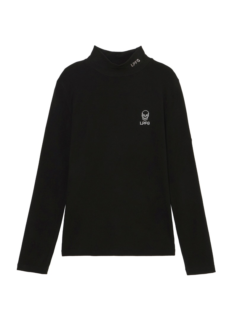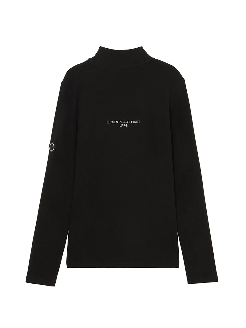 LPFGのウィメンズモックネックプルオーバー。左胸にスカル、左袖にLUCIEN PELLAT-FINET LPFGロゴ、バックにはLUCIEN PELLAT-FINETロゴをデザイン。中肉素材では表現しづらいストレッチ感と膨らみ感を追求し、UVカット、接触冷感効果を備え、かつ非常に軽量でありながらシワになりにくい特徴を備えたダンボールニット素材となります。
