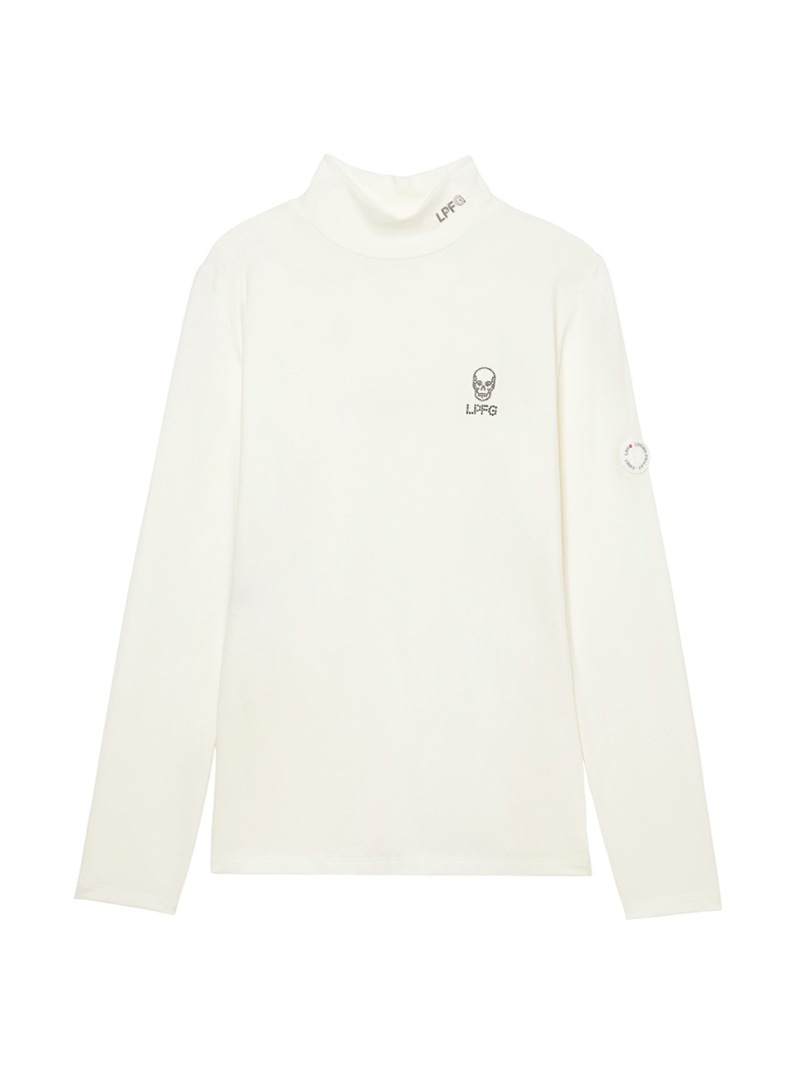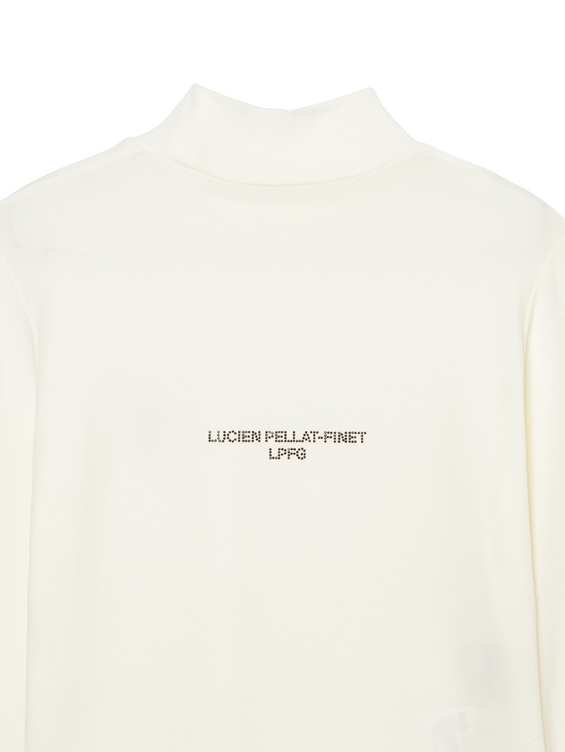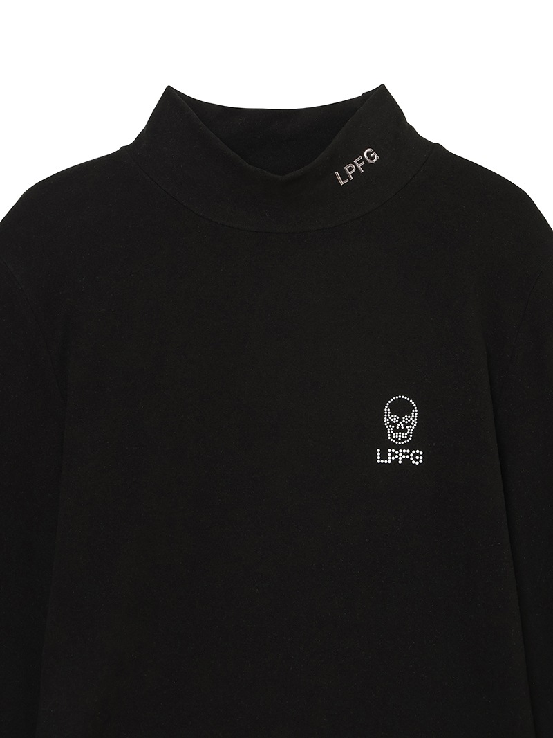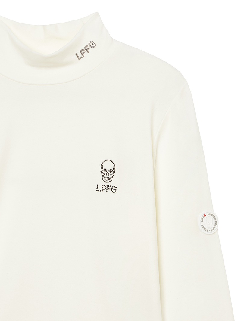 LPFGのウィメンズモックネックプルオーバー。左胸にスカル、左袖にLUCIEN PELLAT-FINET LPFGロゴ、バックにはLUCIEN PELLAT-FINETロゴをデザイン。中肉素材では表現しづらいストレッチ感と膨らみ感を追求し、UVカット、接触冷感効果を備え、かつ非常に軽量でありながらシワになりにくい特徴を備えたダンボールニット素材となります。