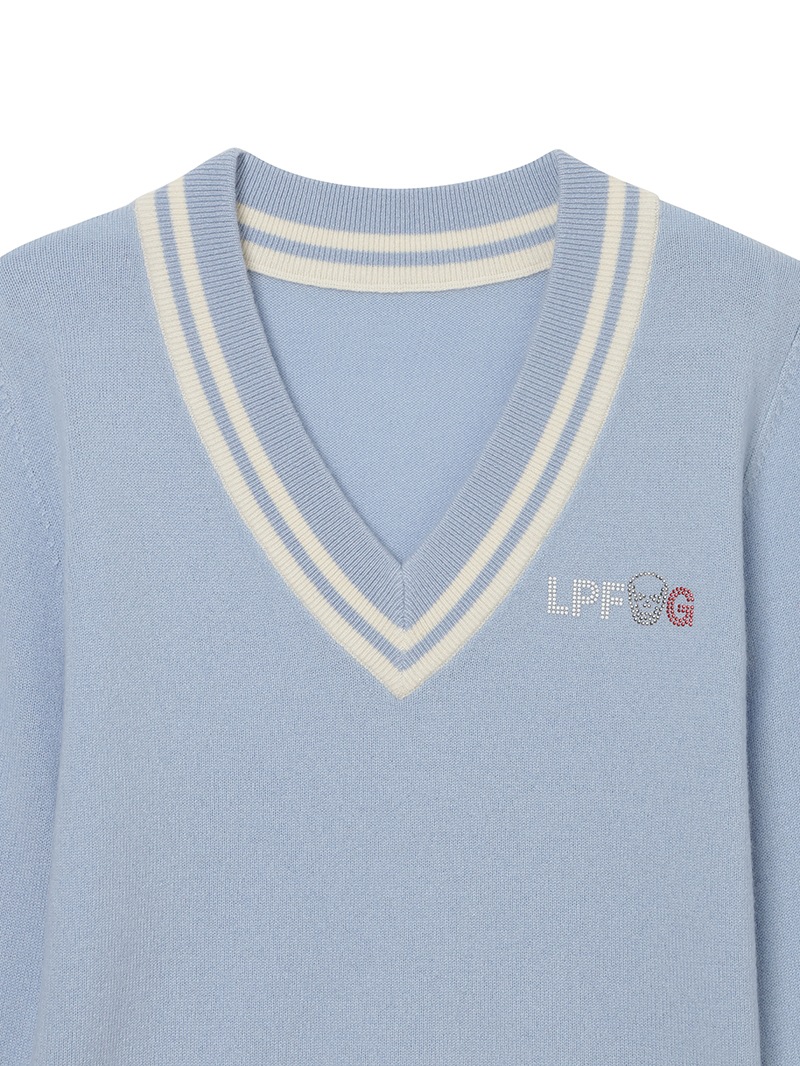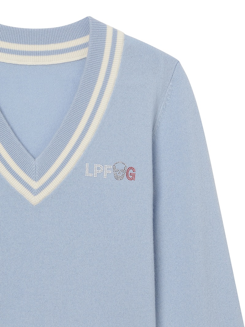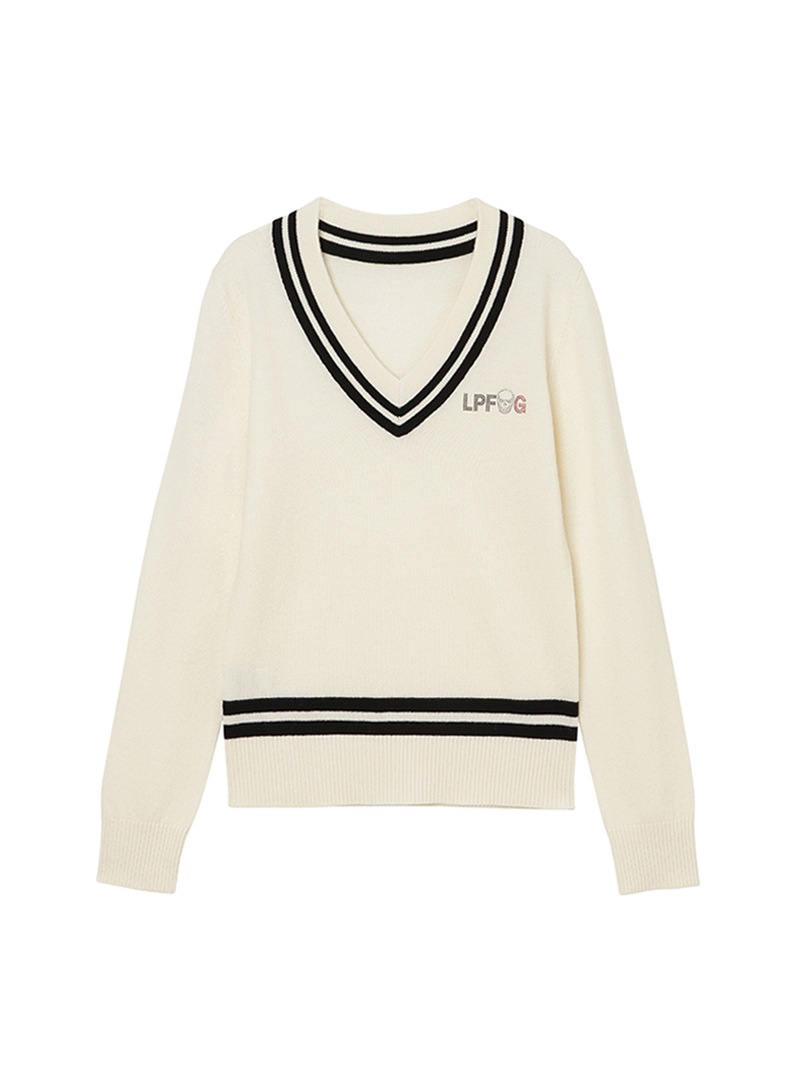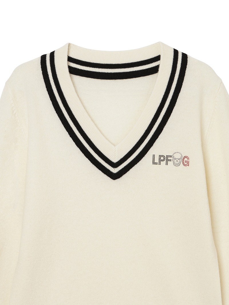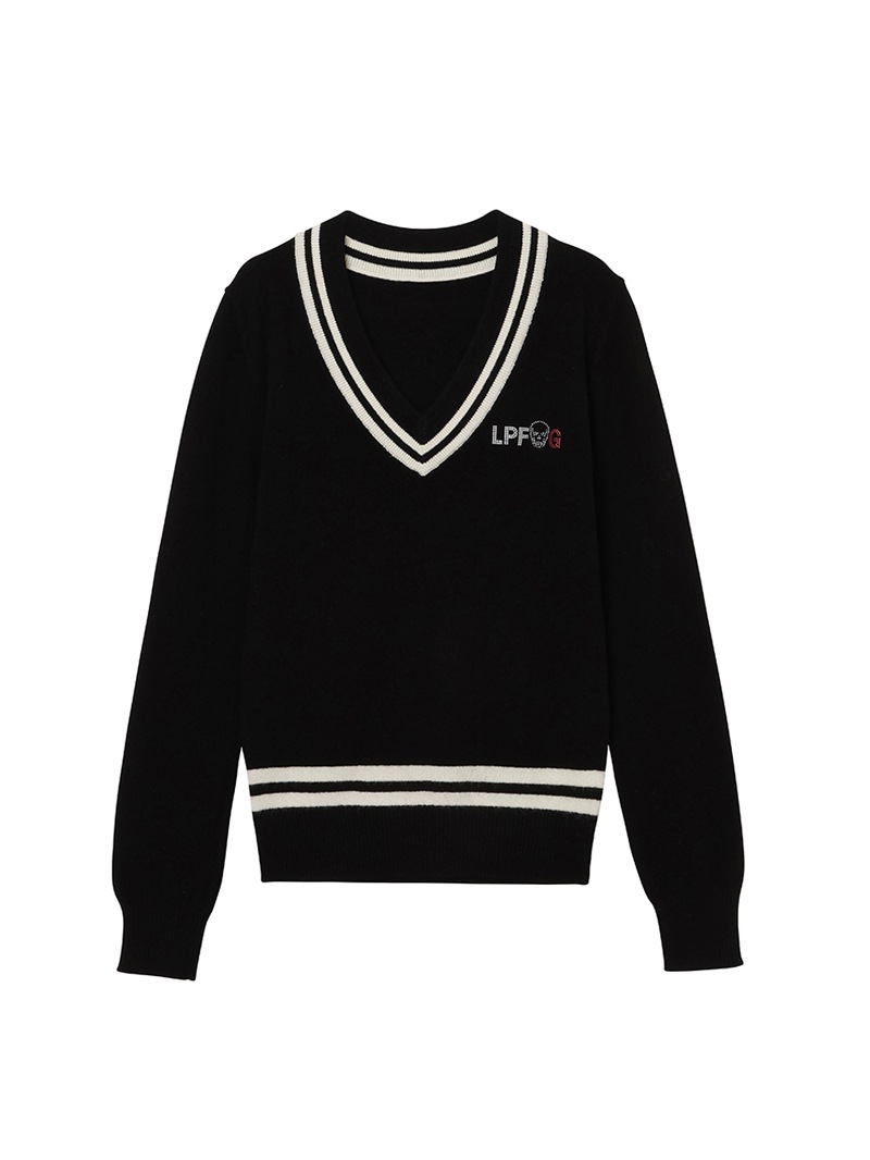 LPFGのウィメンズVネックセーター。上質なウールとカシミヤをブレンドしたもの。程よい肉厚感で保温性も抜群。ネック部分と、裾部分のバイカラーでの配色がポイント。