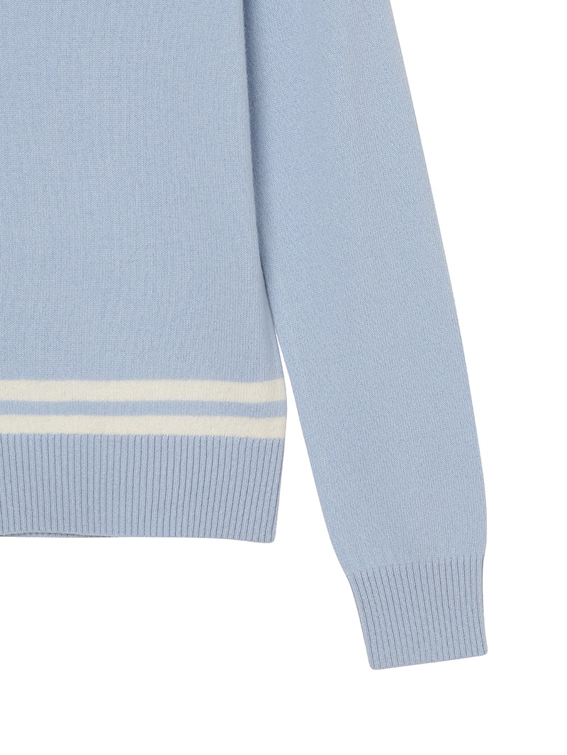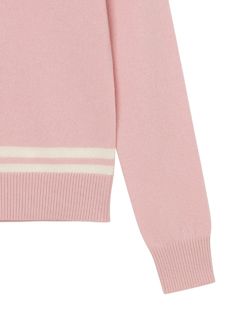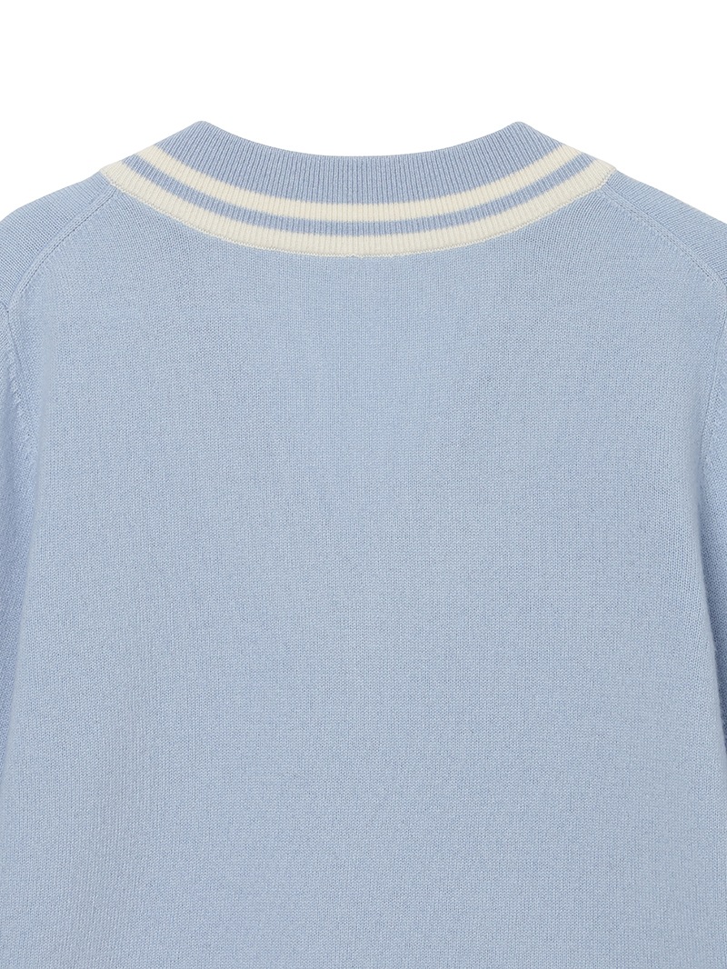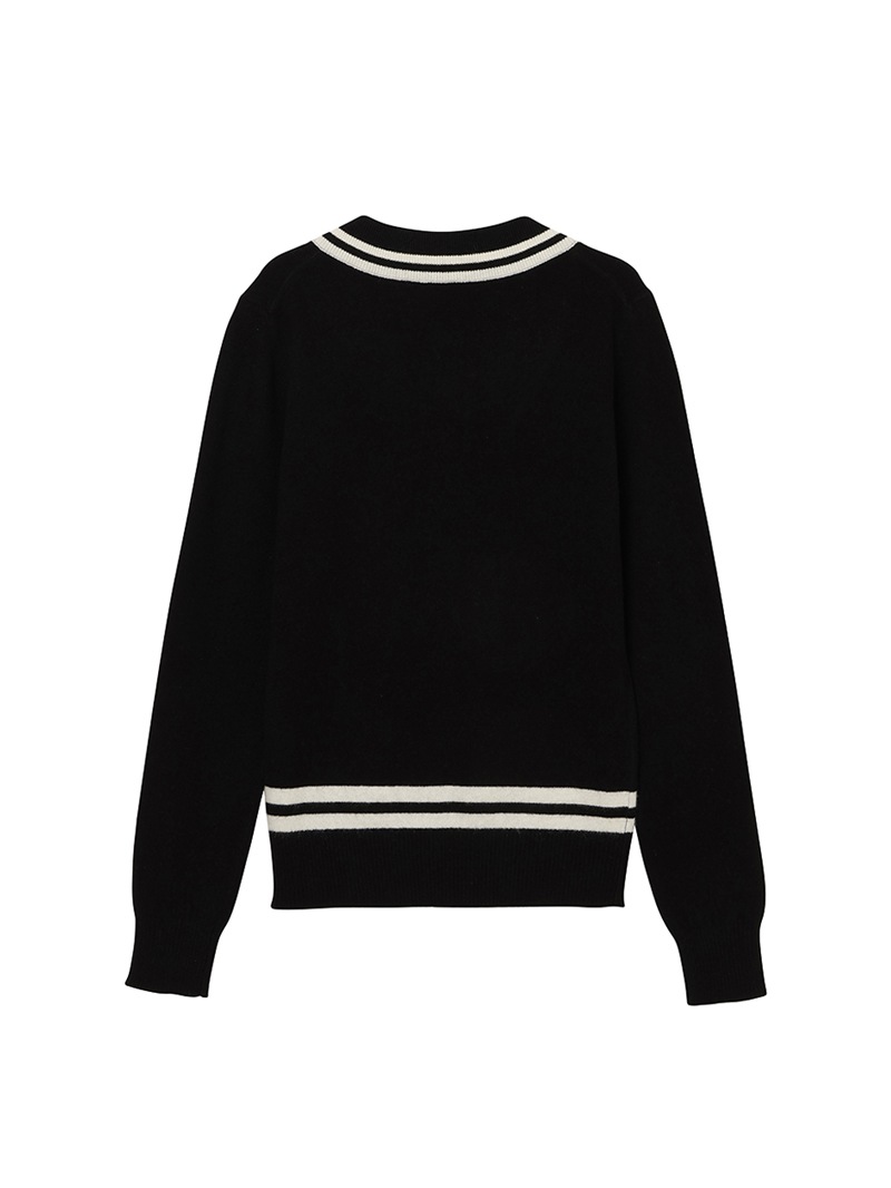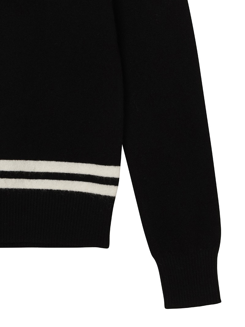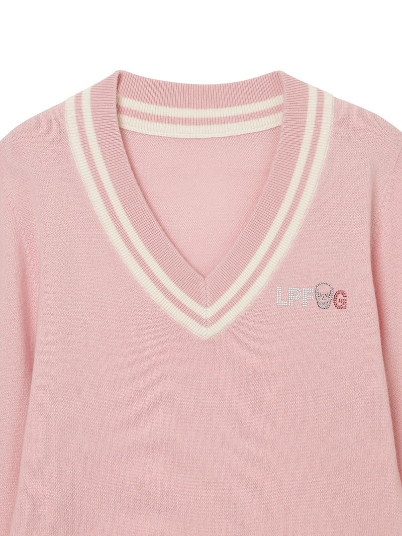 LPFGのウィメンズVネックセーター。上質なウールとカシミヤをブレンドしたもの。程よい肉厚感で保温性も抜群。ネック部分と、裾部分のバイカラーでの配色がポイント。