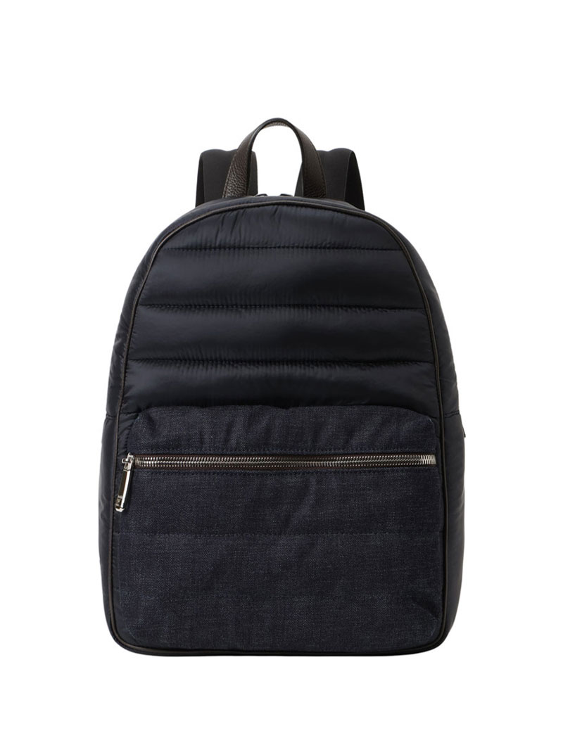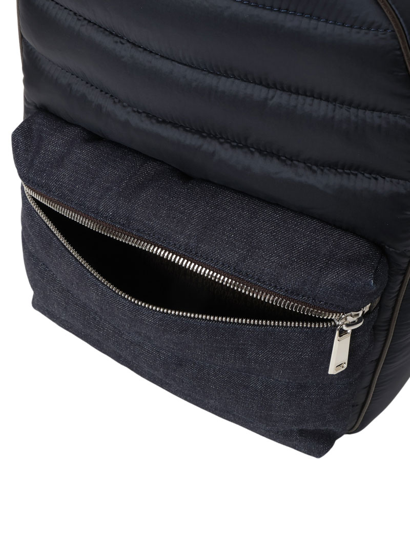 中綿を詰めてキルティングを施したバックパック。ブランドのアイコニックなダウンジャケットを想起させるデザインです。歴史ある織機で織り上げられた高品質な手触りの日本製セルヴィッジデニムで仕上げました。このファブリックにみられるムラは、この素材の個性であり、価値あるオリジナリティの証です。