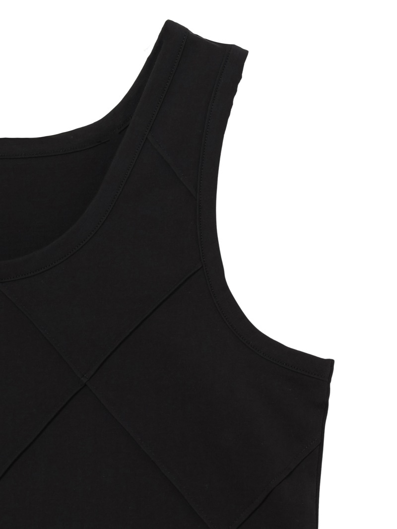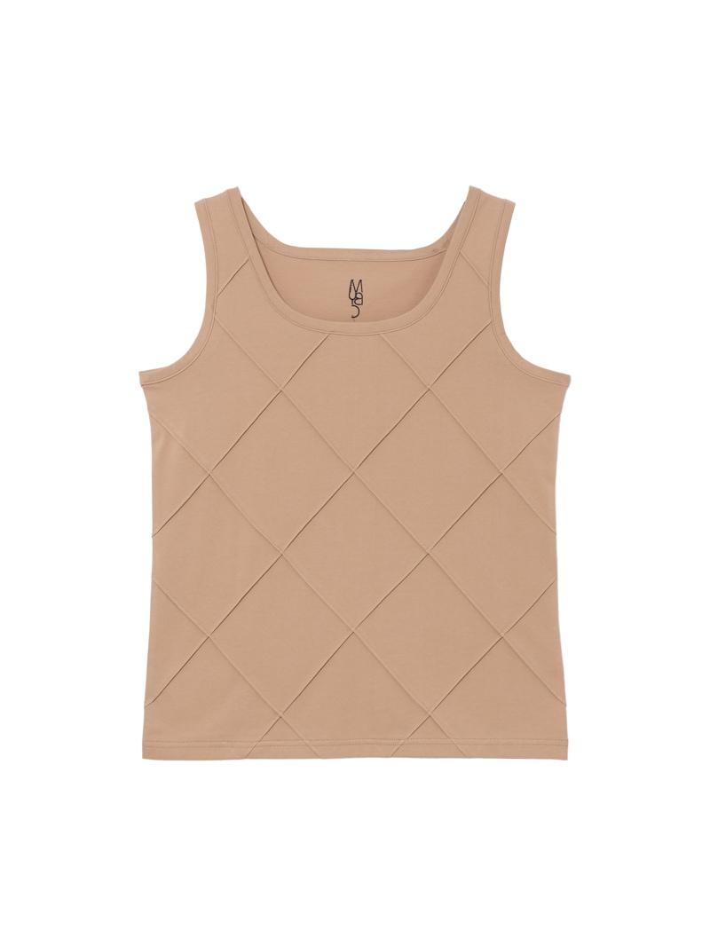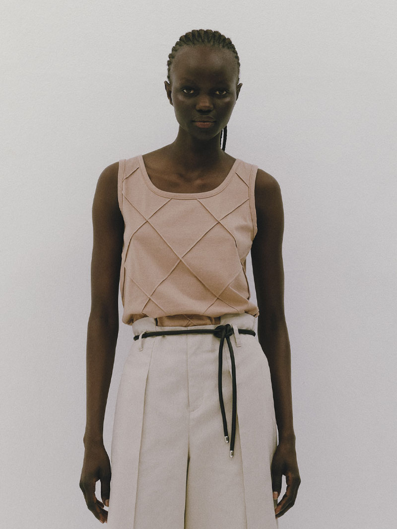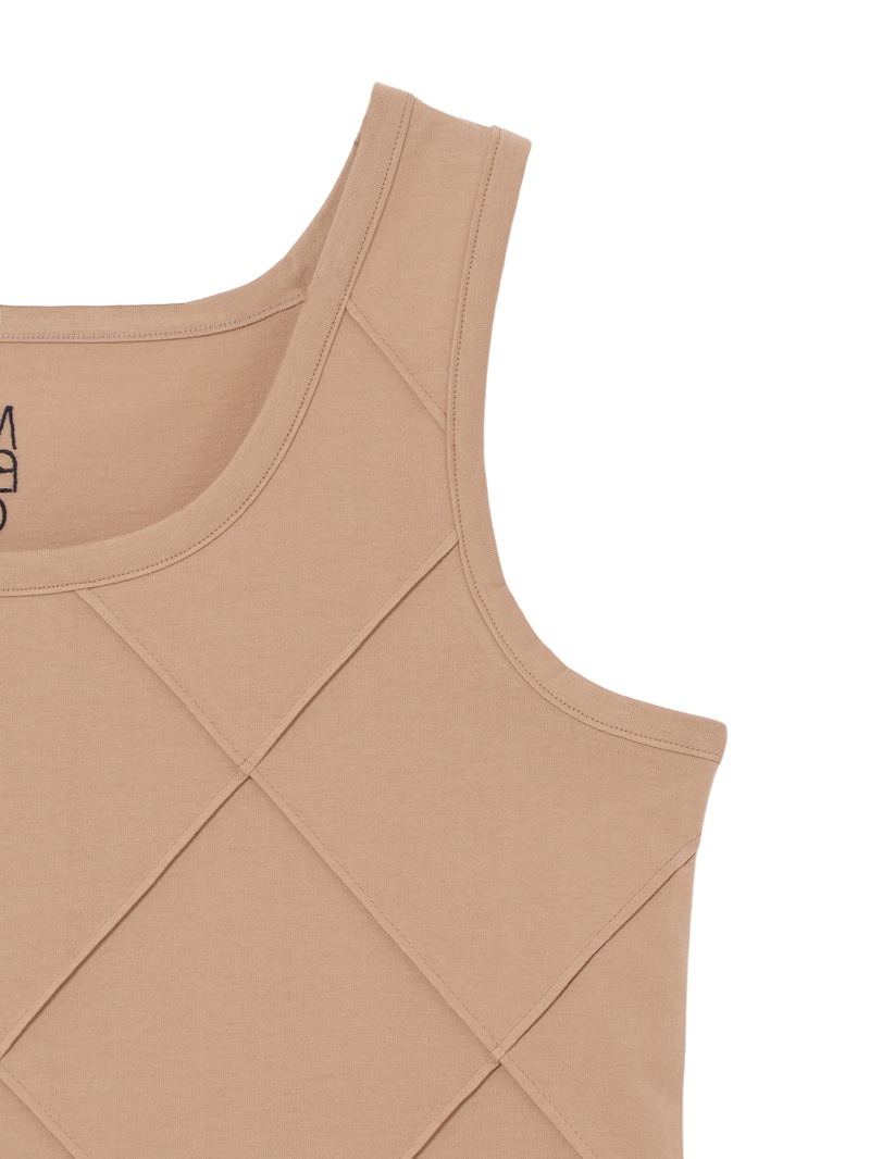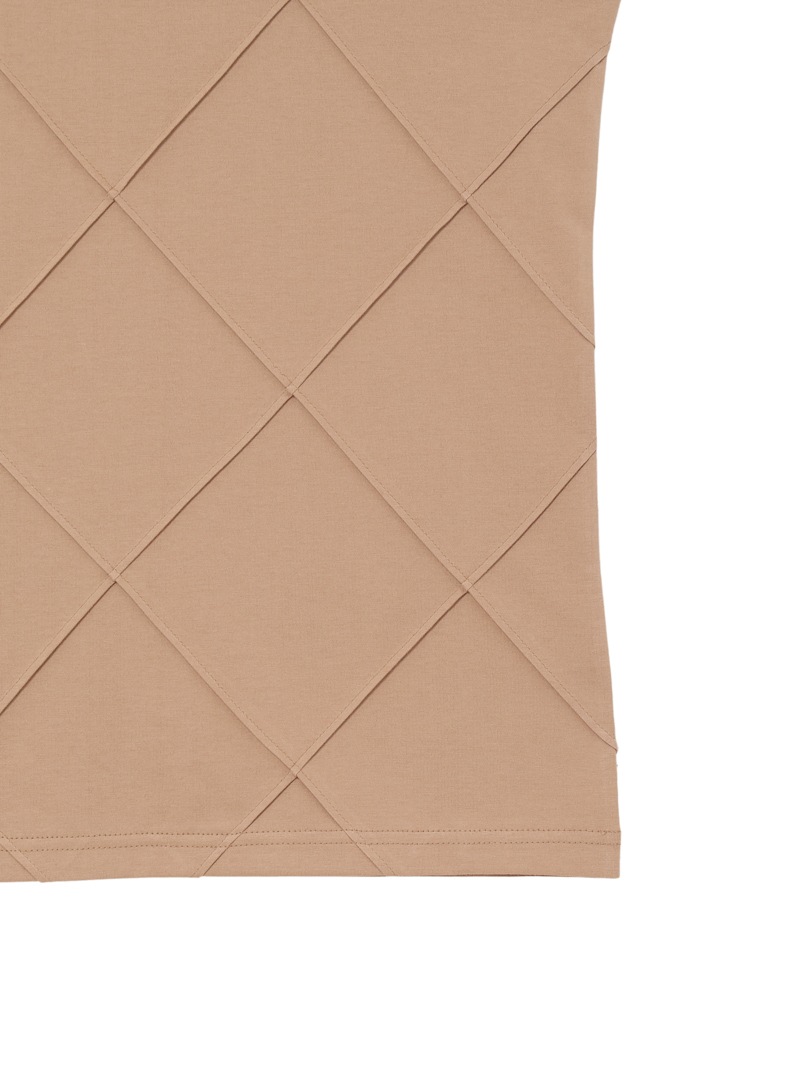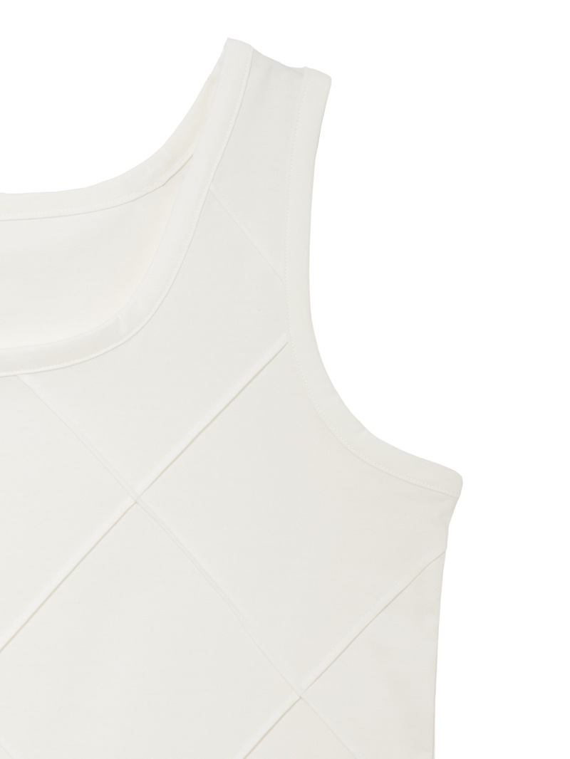 1枚で着られる肉厚感のある目面の美しいカットソー素材を使用したシリーズ。ダイヤ柄を取り入れることで、シンプルな中に程よいデザインをプラスしています。デコルテが美しく見える、丸みのあるスクエアネックラインも特徴です。