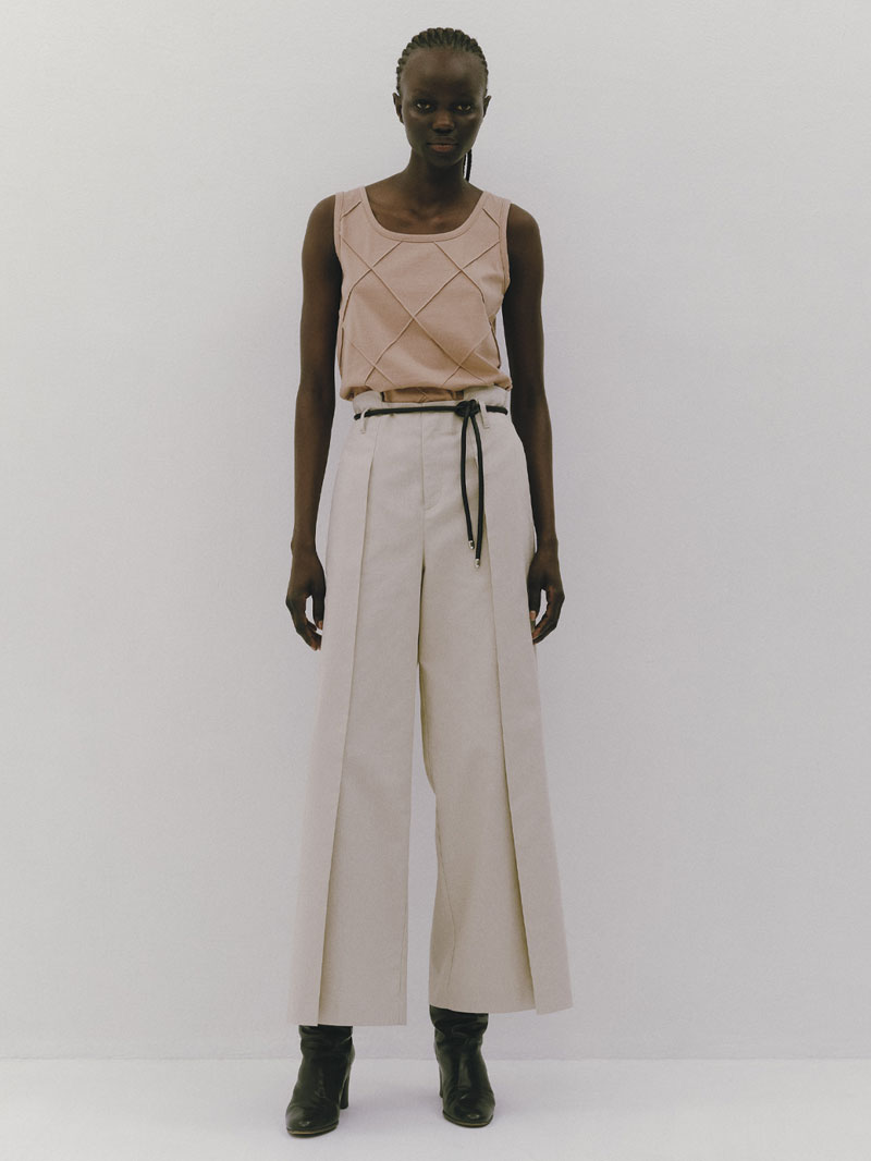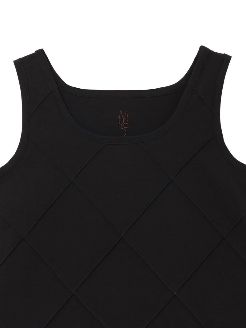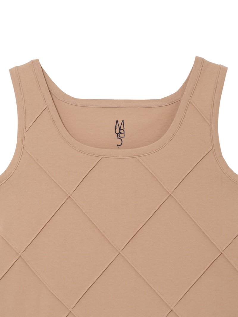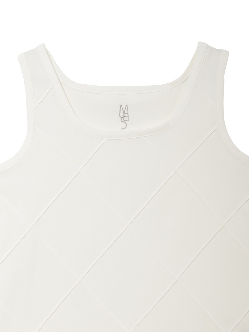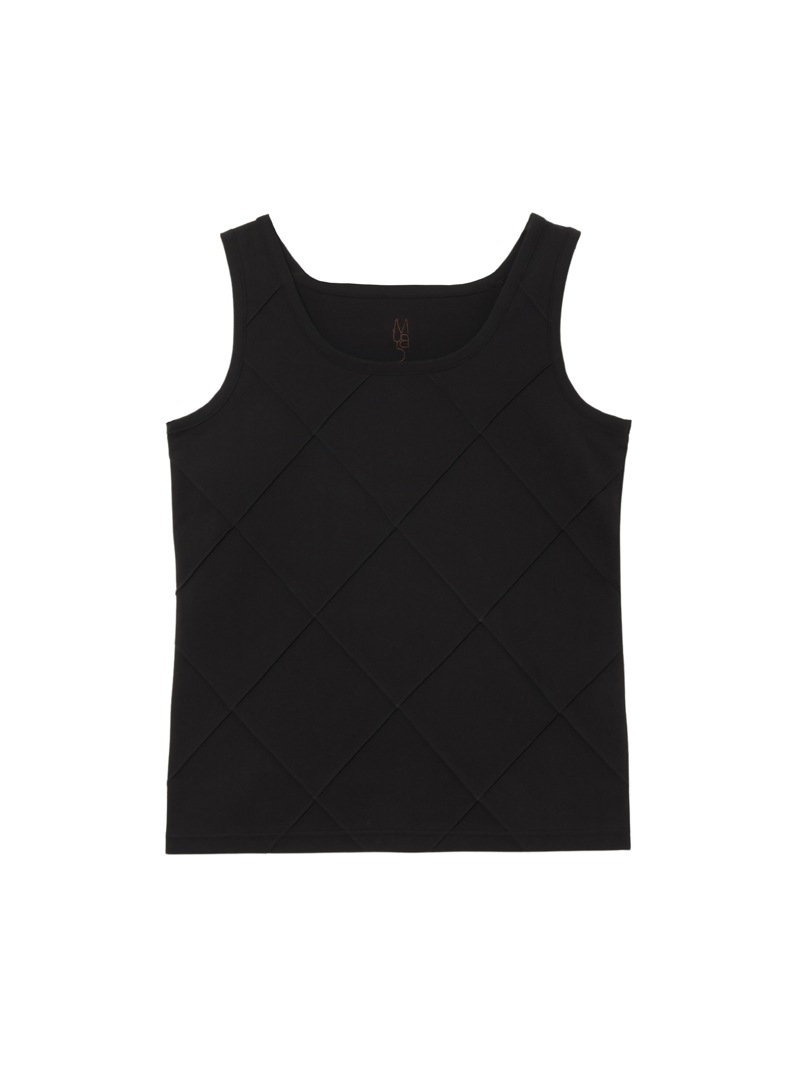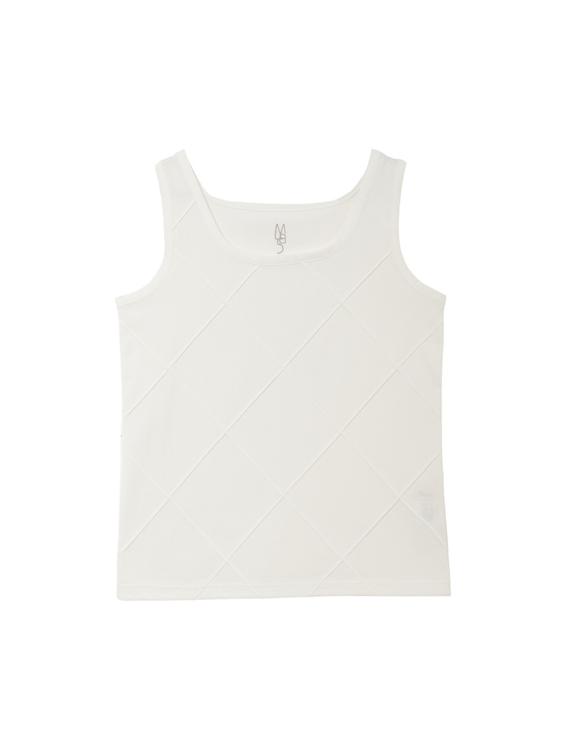 1枚で着られる肉厚感のある目面の美しいカットソー素材を使用したシリーズ。ダイヤ柄を取り入れることで、シンプルな中に程よいデザインをプラスしています。デコルテが美しく見える、丸みのあるスクエアネックラインも特徴です。