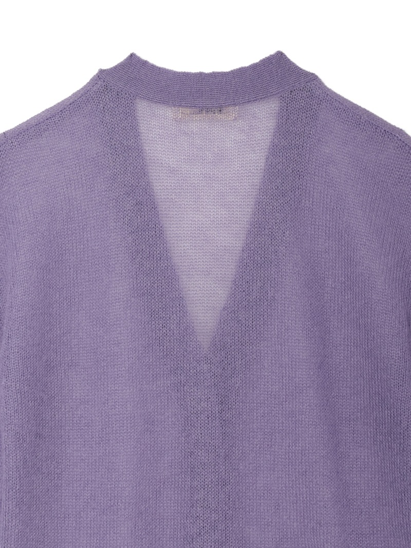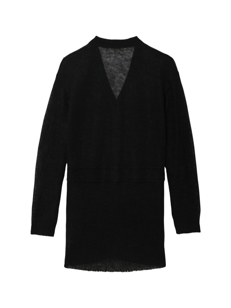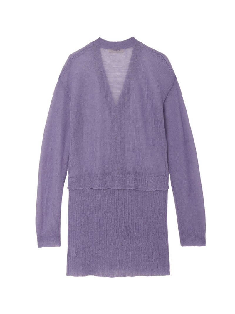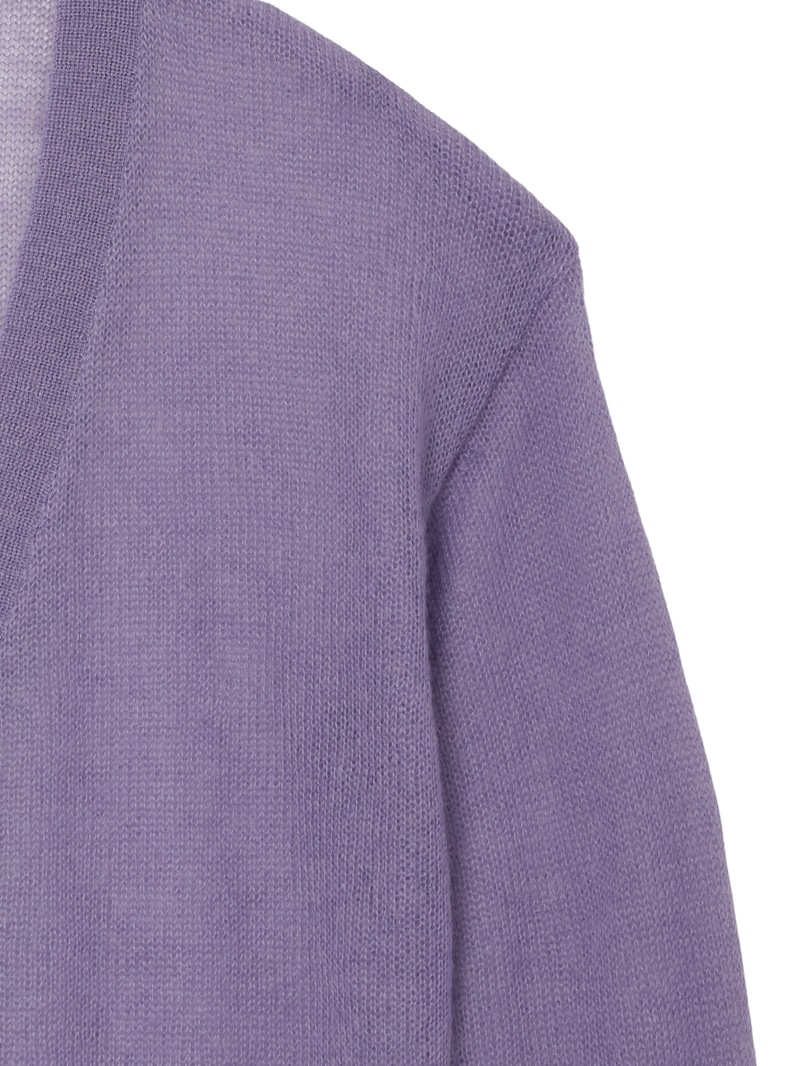 モヘアをたっぷりあしらったシアー感のあるローゲージのカーディガン。肌触りがソフトになるように仕上げており、クロップドのカーディガンと腰にスカーフを巻いたようなレイヤードのデザインがポイントです。