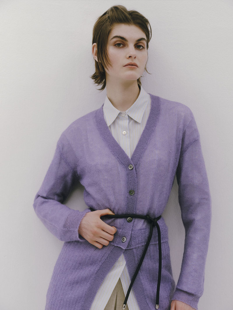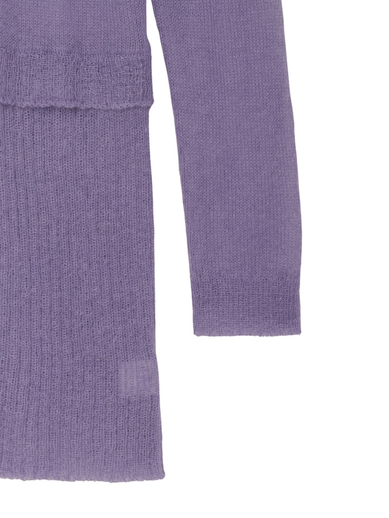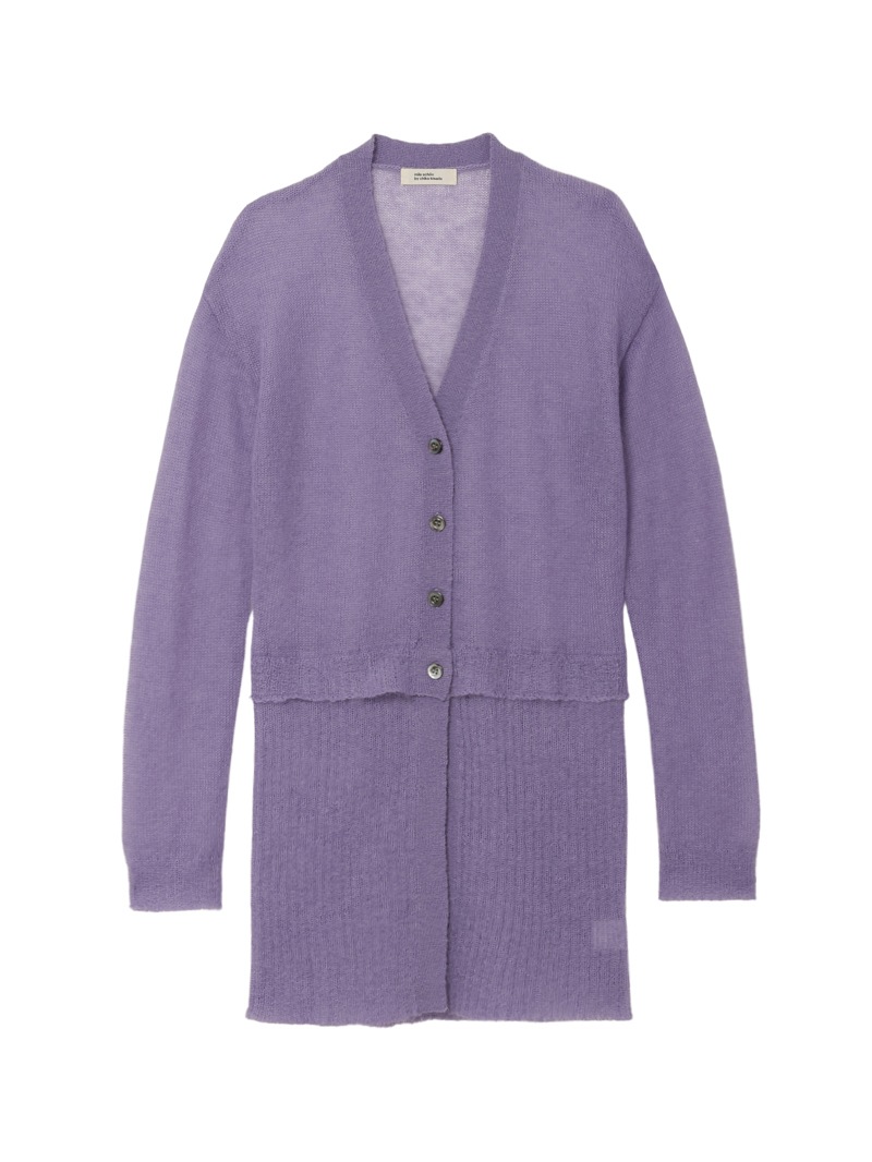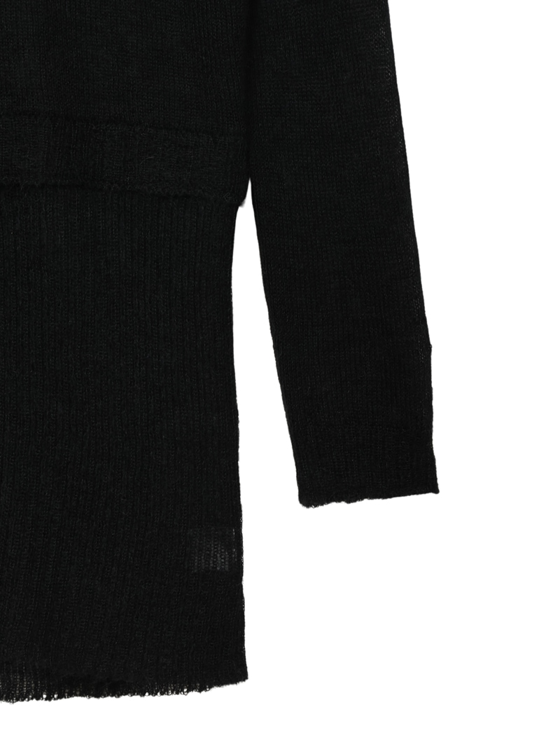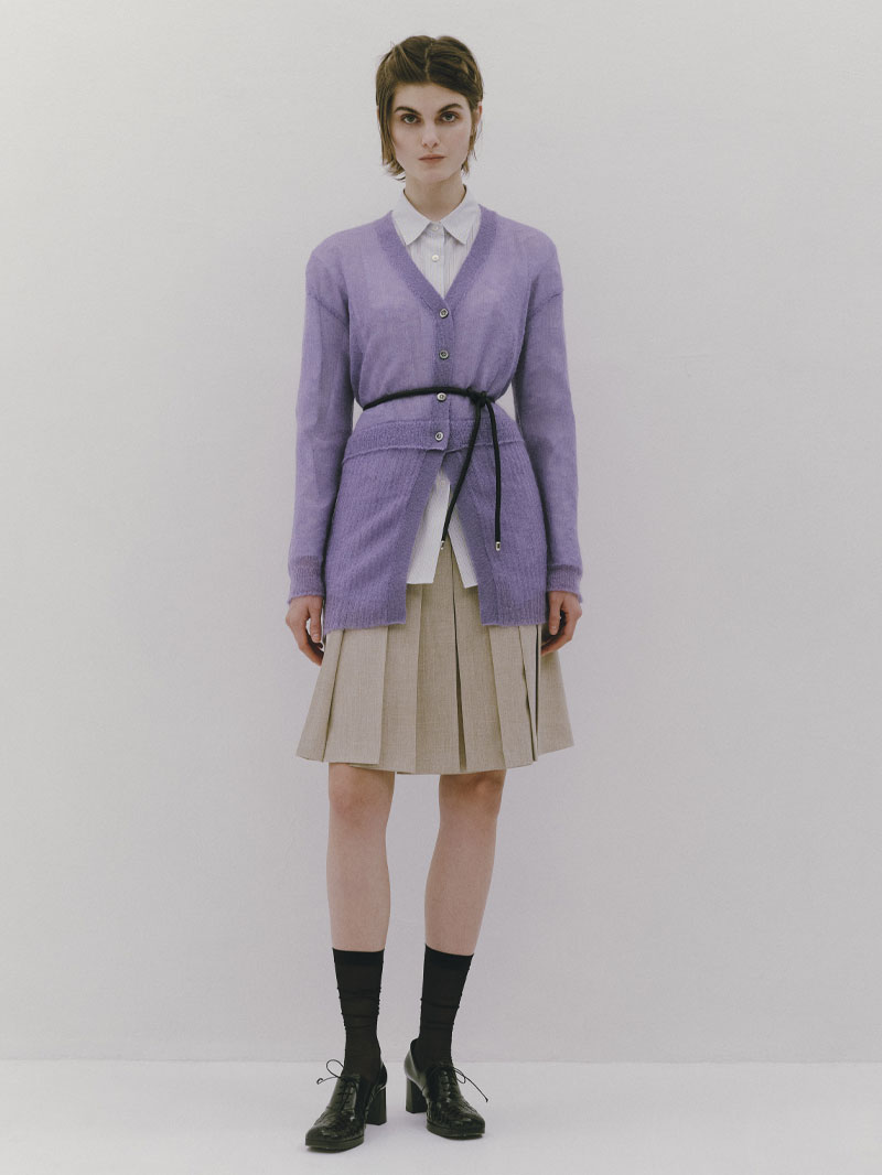 モヘアをたっぷりあしらったシアー感のあるローゲージのカーディガン。肌触りがソフトになるように仕上げており、クロップドのカーディガンと腰にスカーフを巻いたようなレイヤードのデザインがポイントです。