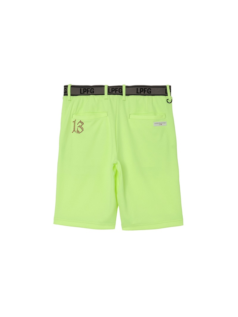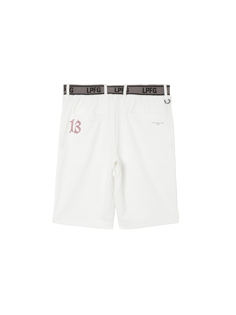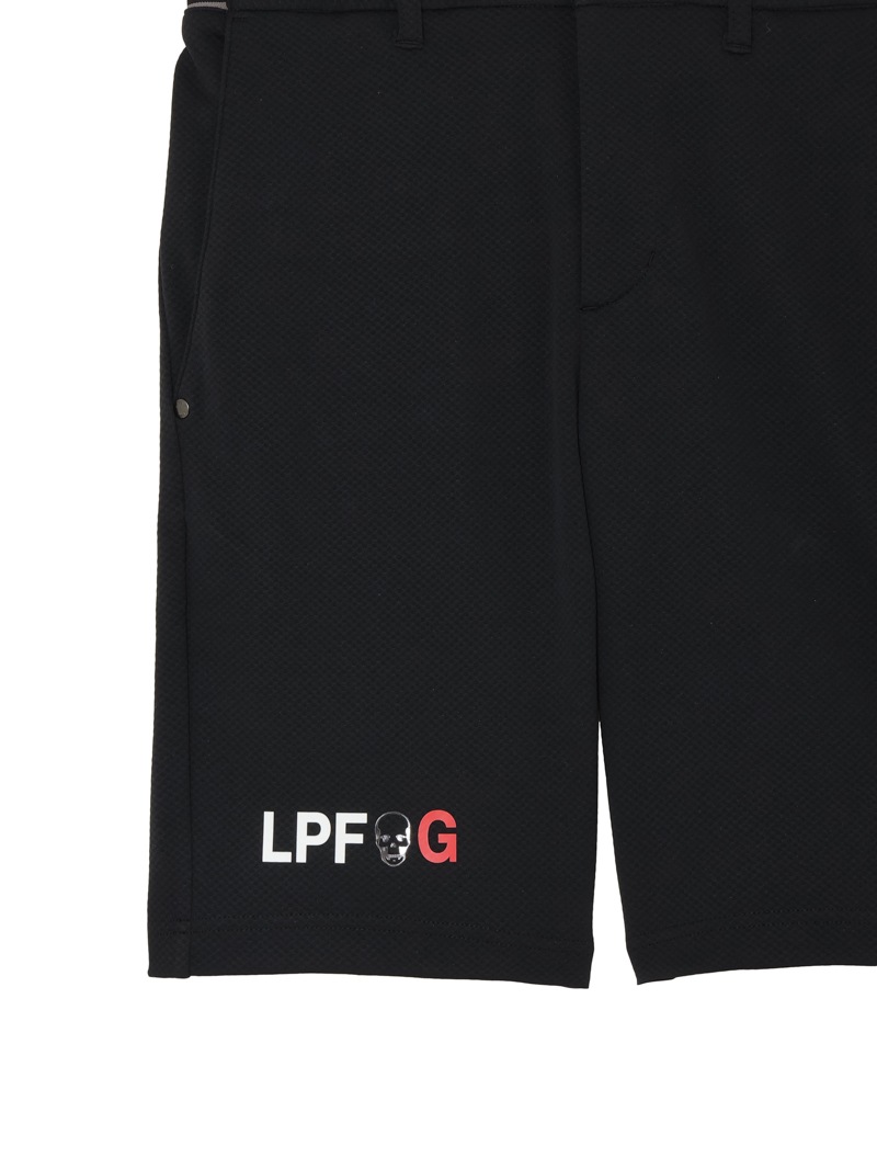 LPFGのメンズバミューダ。右裾にLPFGロゴ&スカルを、左後ろポケット部分にスタッズにてNO.13を配置。