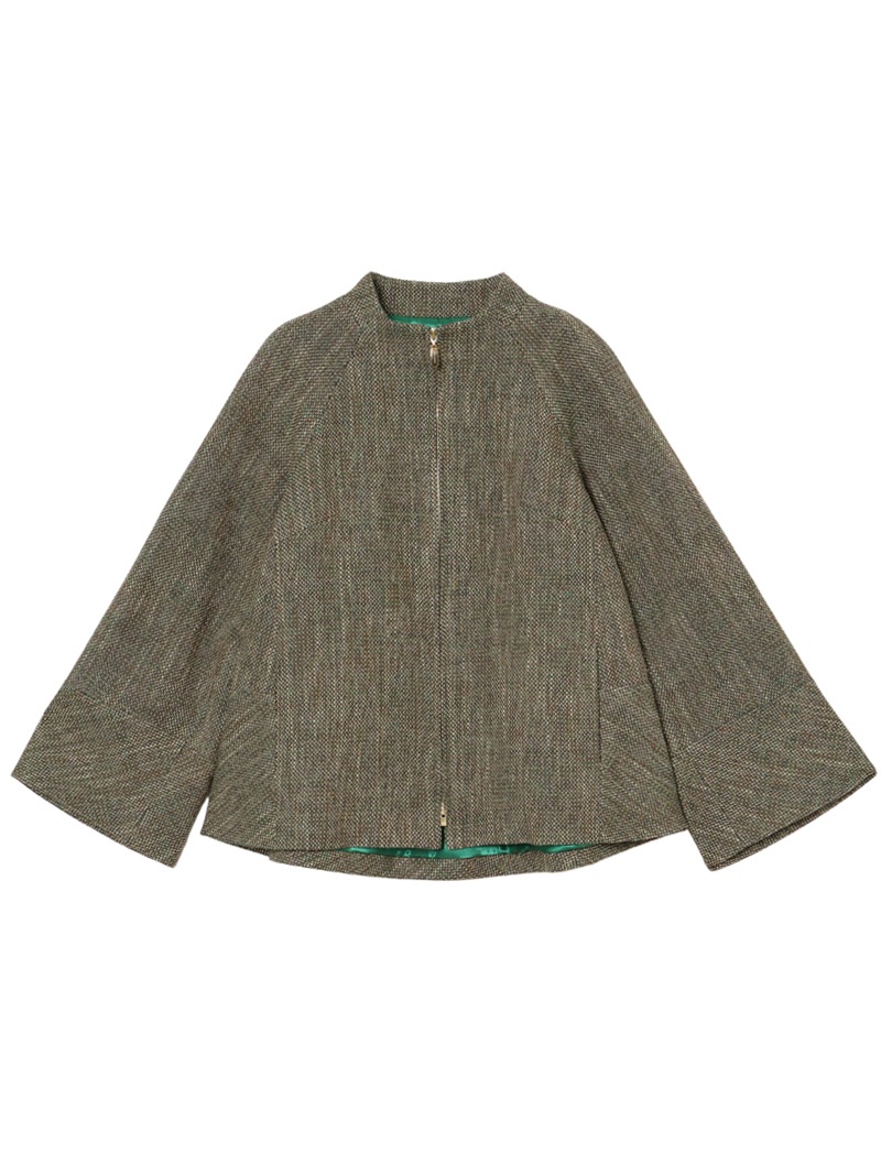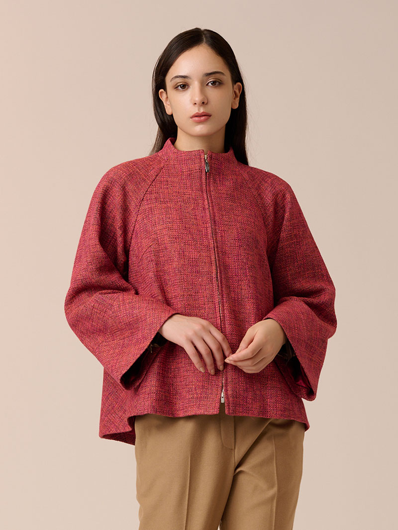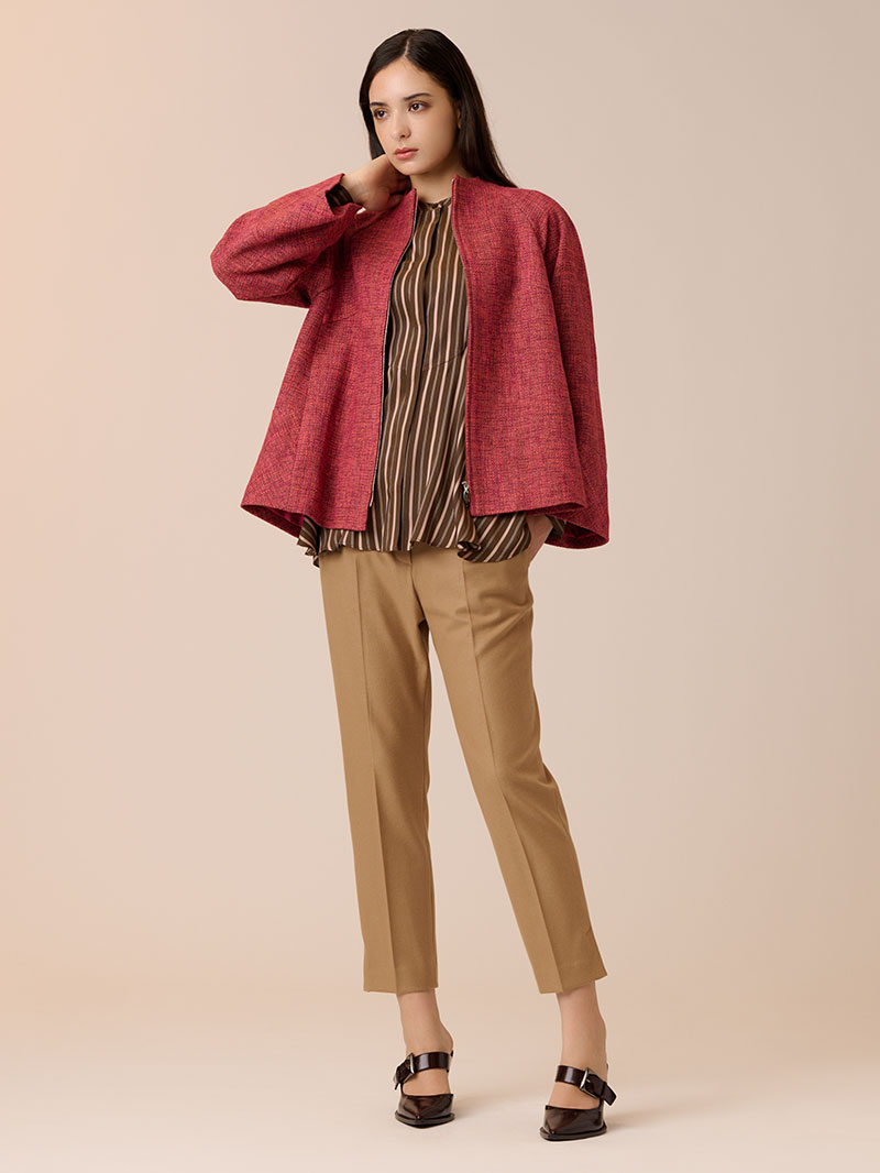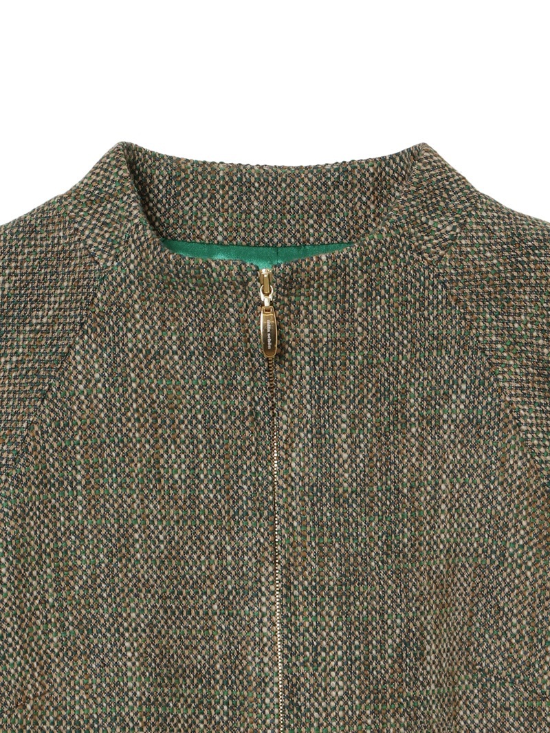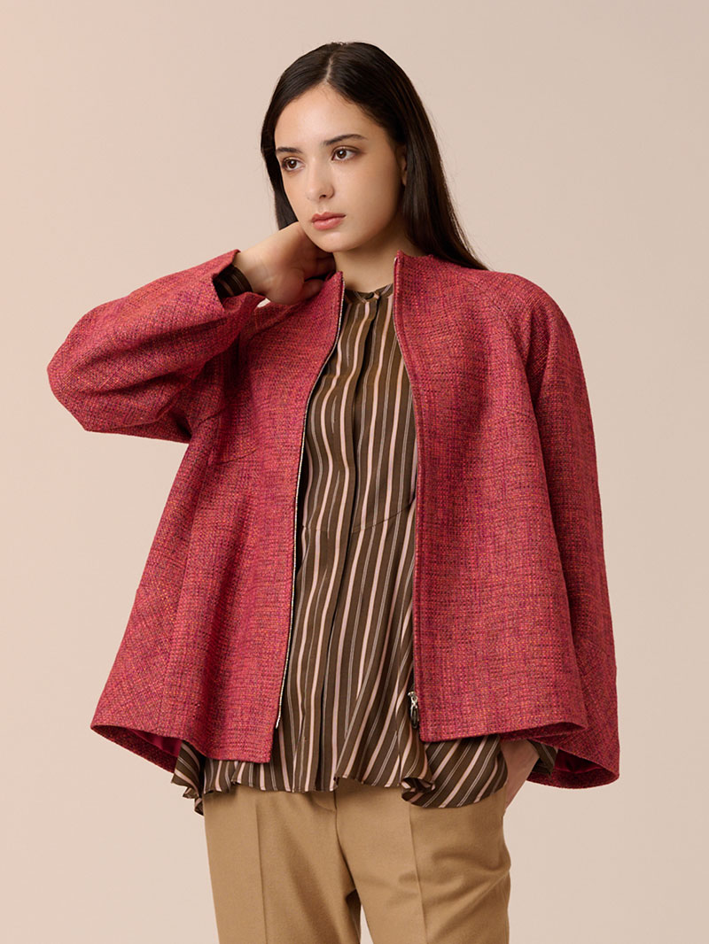 Aラインでラウンドヘムの秋冬にぴったりなブルゾン。イタリアのファブリックメーカーLINEAESSE社(リニアエッセ)のリサイクルヤーンを使用しています。様々なクオリティの糸を織り交ぜた高級感溢れる素材は、シーズンらしさを感じさせる奥行きのある色使いが魅力。同素材のスカートとのセットアップ着用も可能です。