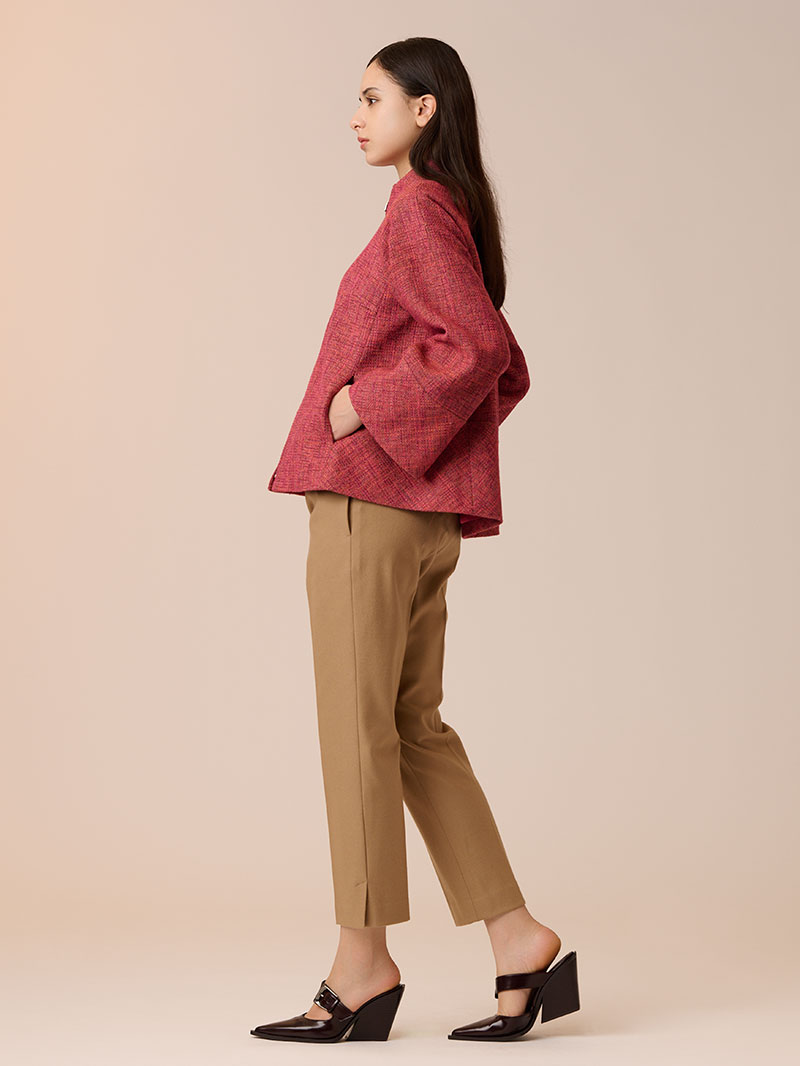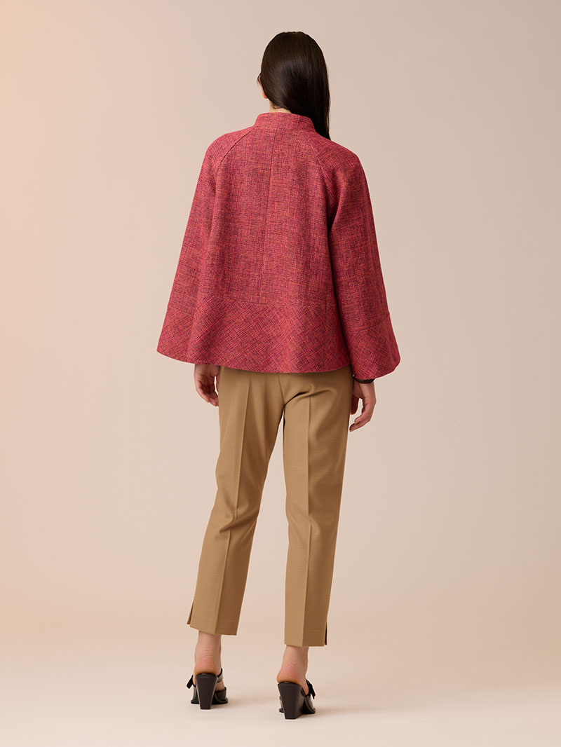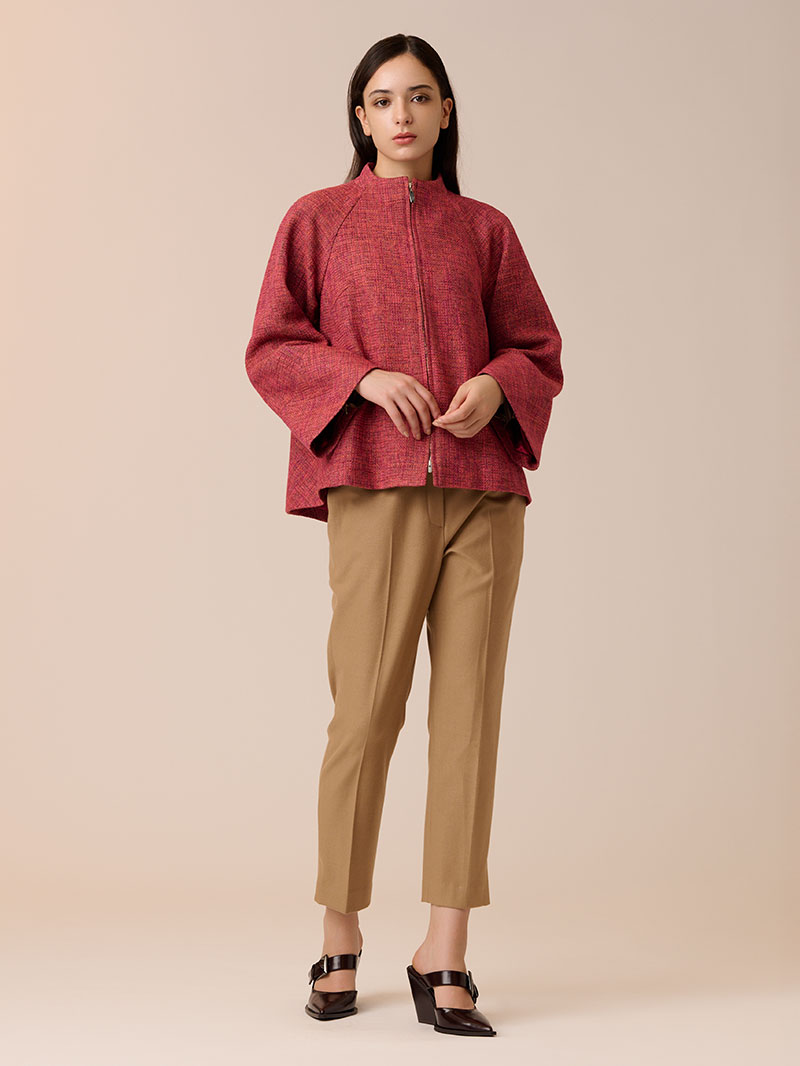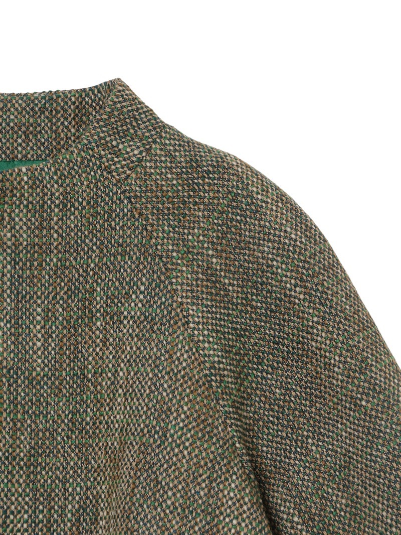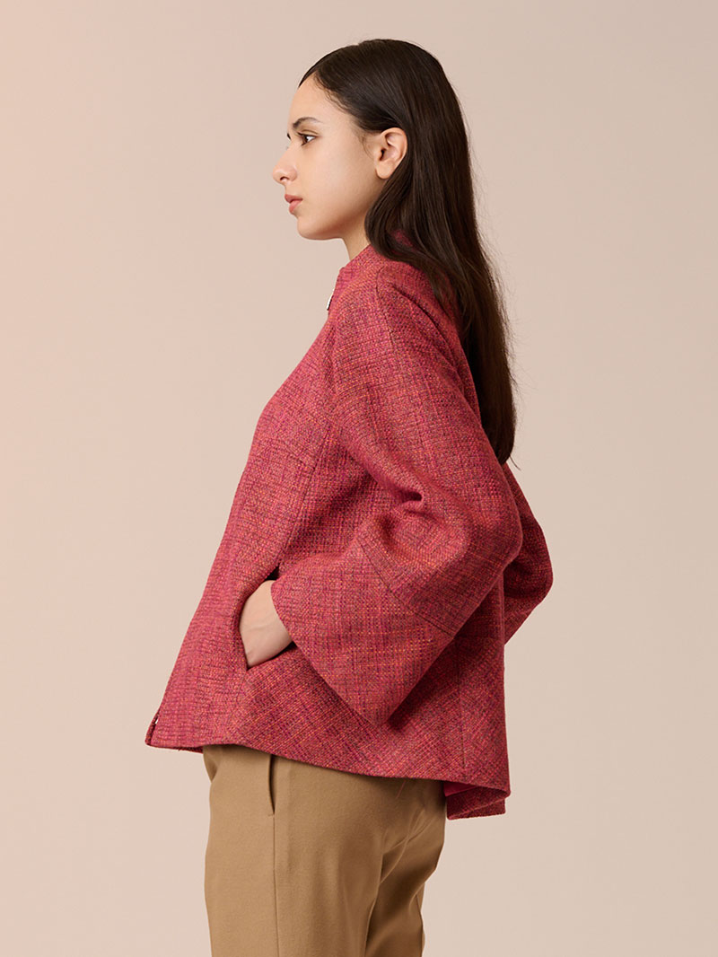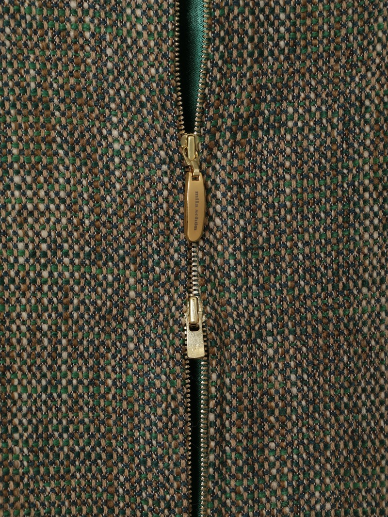 Aラインでラウンドヘムの秋冬にぴったりなブルゾン。イタリアのファブリックメーカーLINEAESSE社(リニアエッセ)のリサイクルヤーンを使用しています。様々なクオリティの糸を織り交ぜた高級感溢れる素材は、シーズンらしさを感じさせる奥行きのある色使いが魅力。同素材のスカートとのセットアップ着用も可能です。