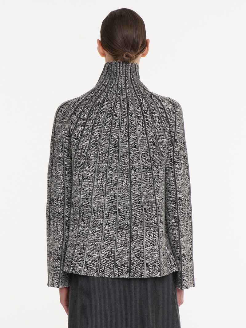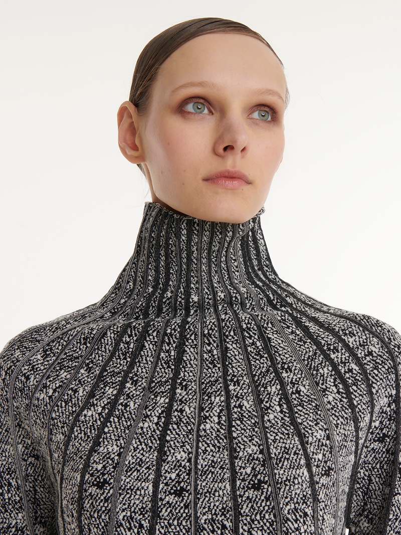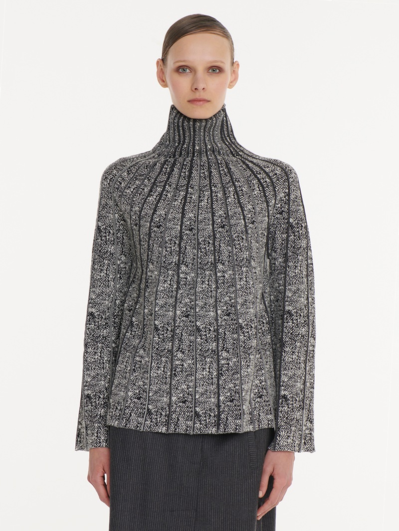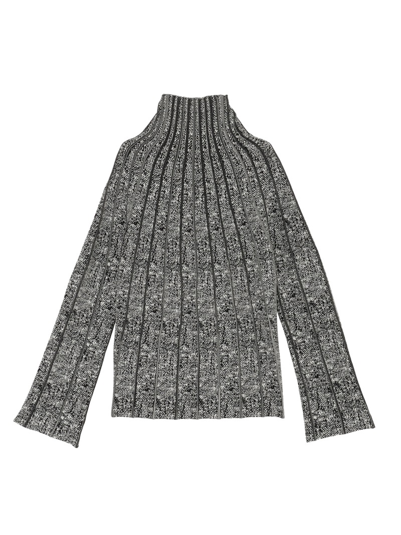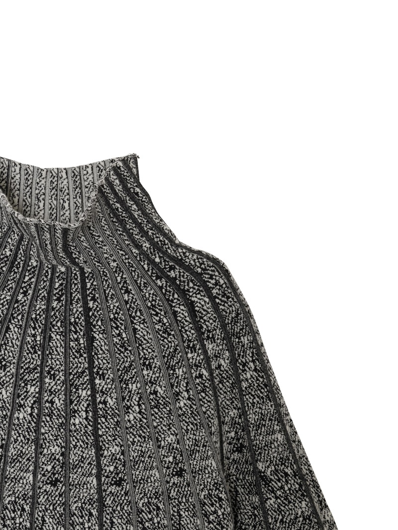 タートルネックのプルオーバーニットです。同系色のストライプがモードな印象。柔らかい肌触りです。