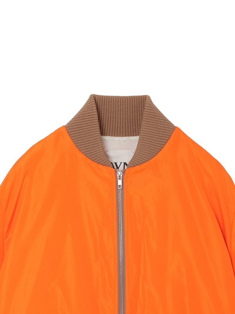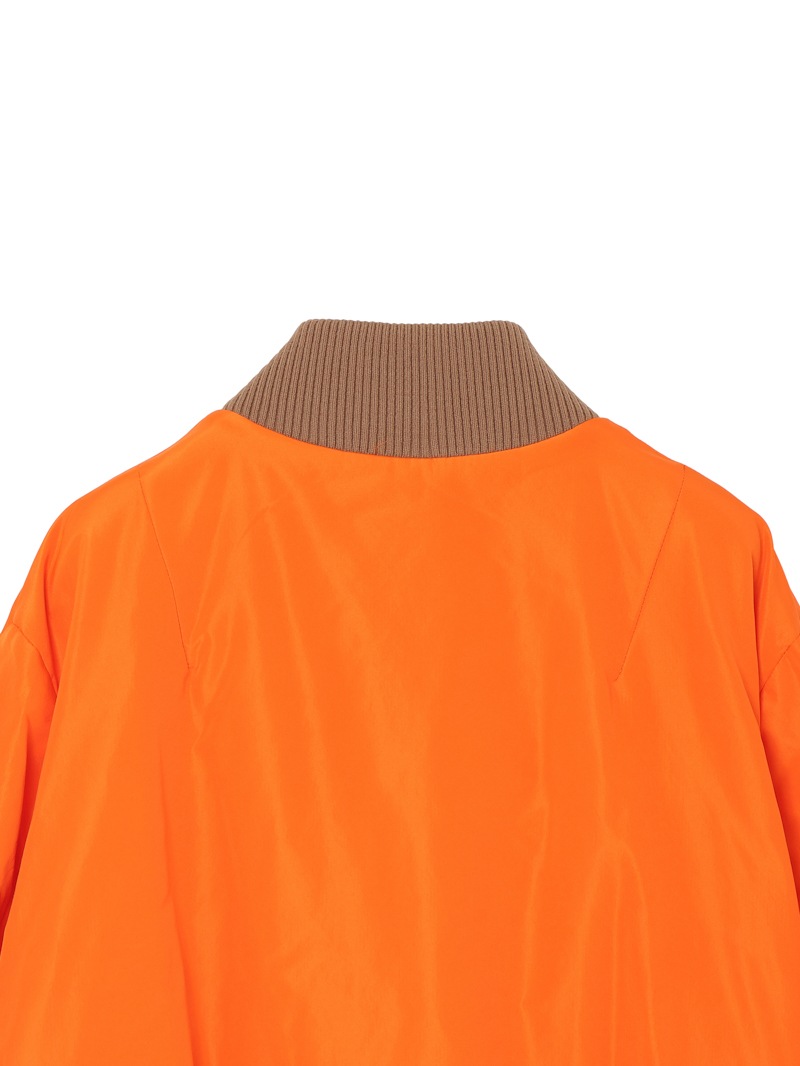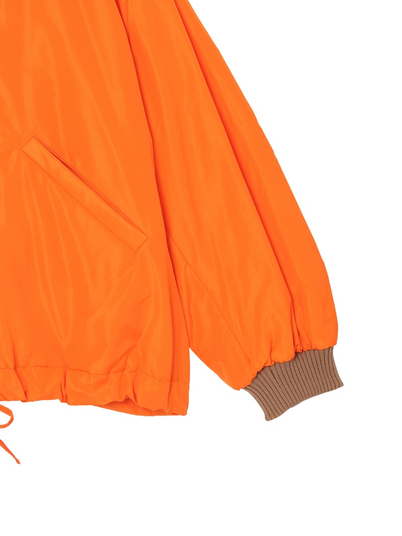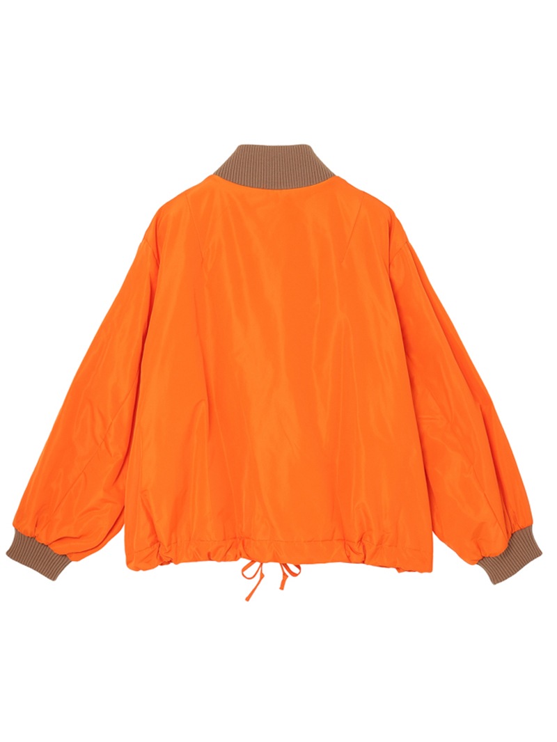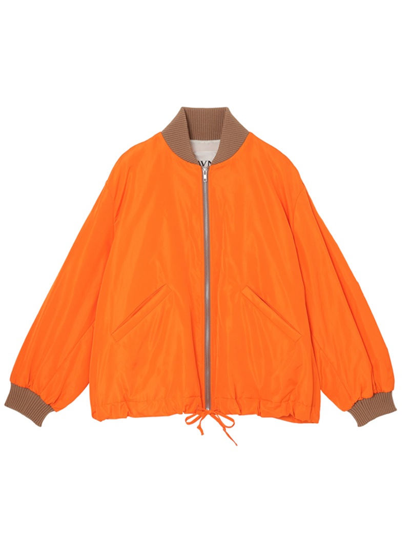 鮮やかなオレンジが目をひく軽量ボンバージャケット。袖口と首元のニット配色がアクセントになり、全体を引き締めます。中綿入りで、裾のドローコードでシルエットの調整が可能です。