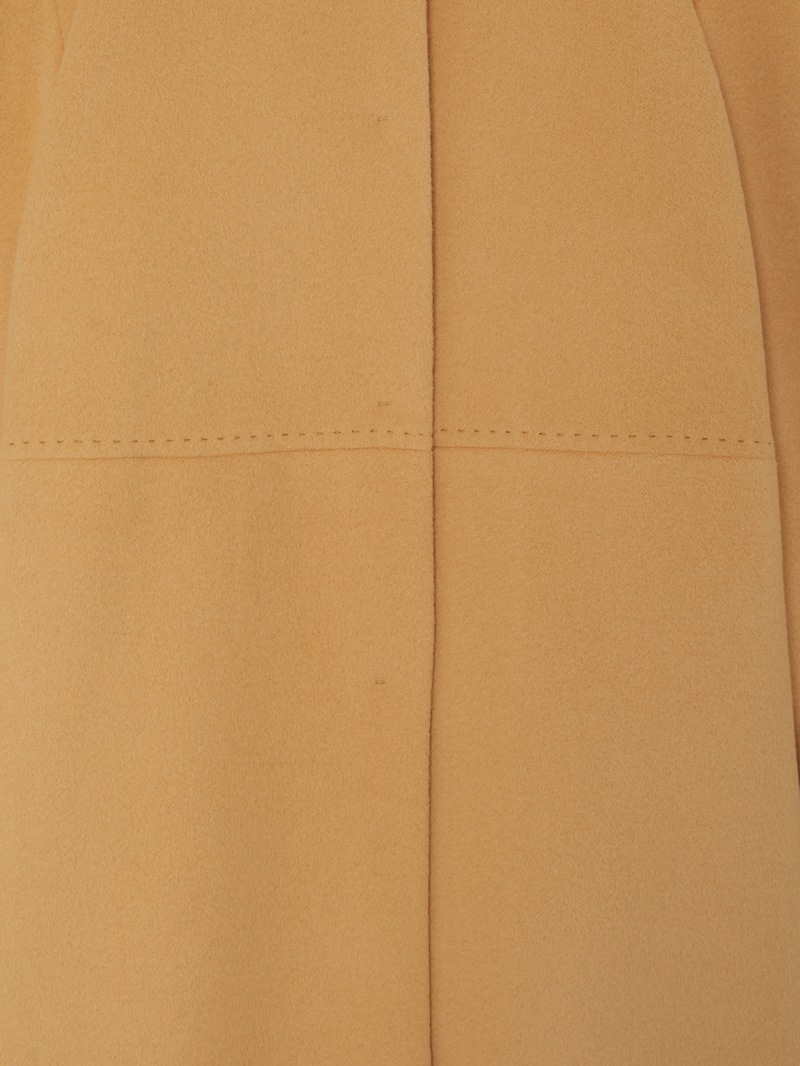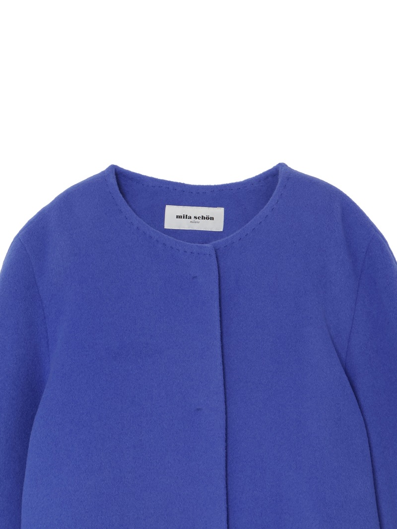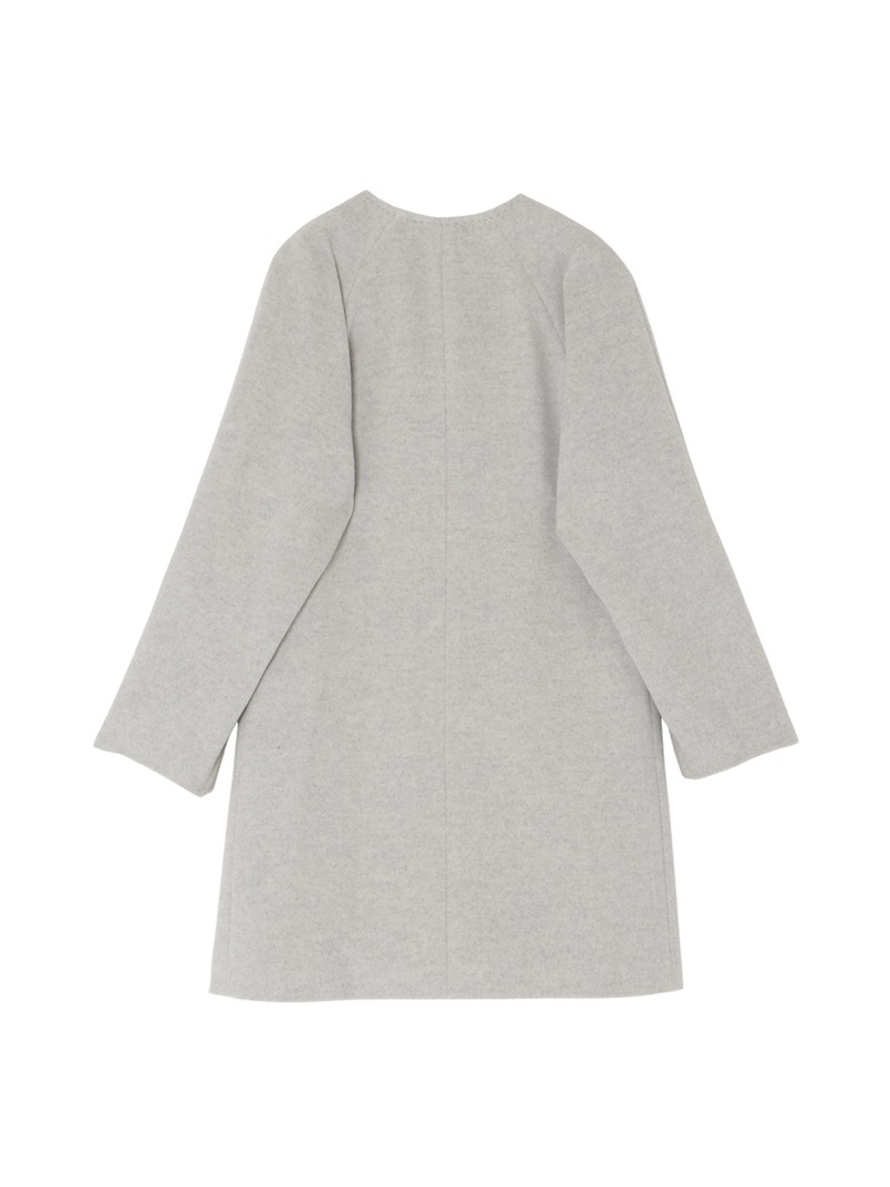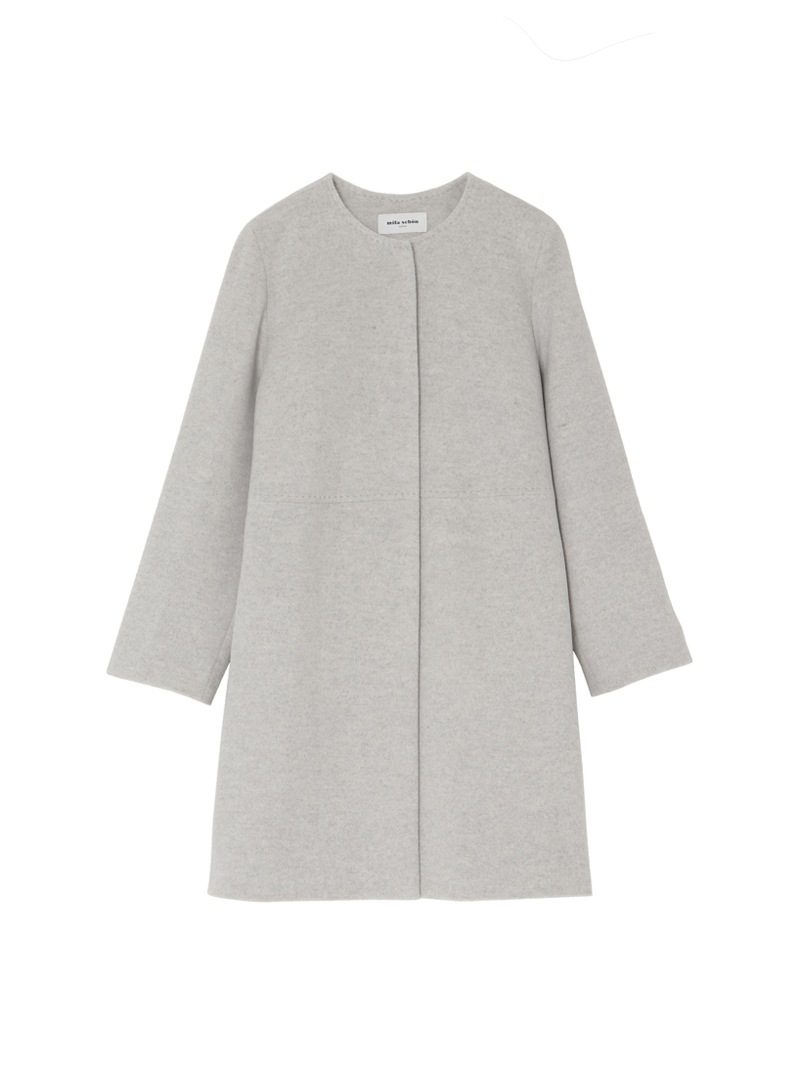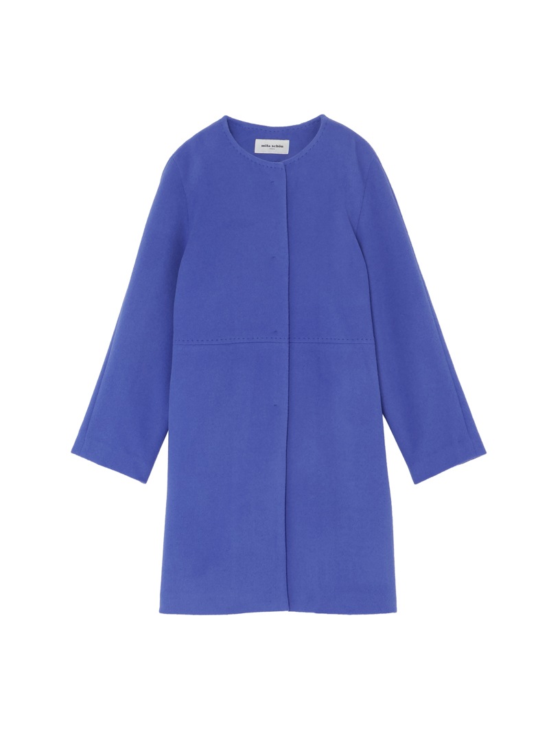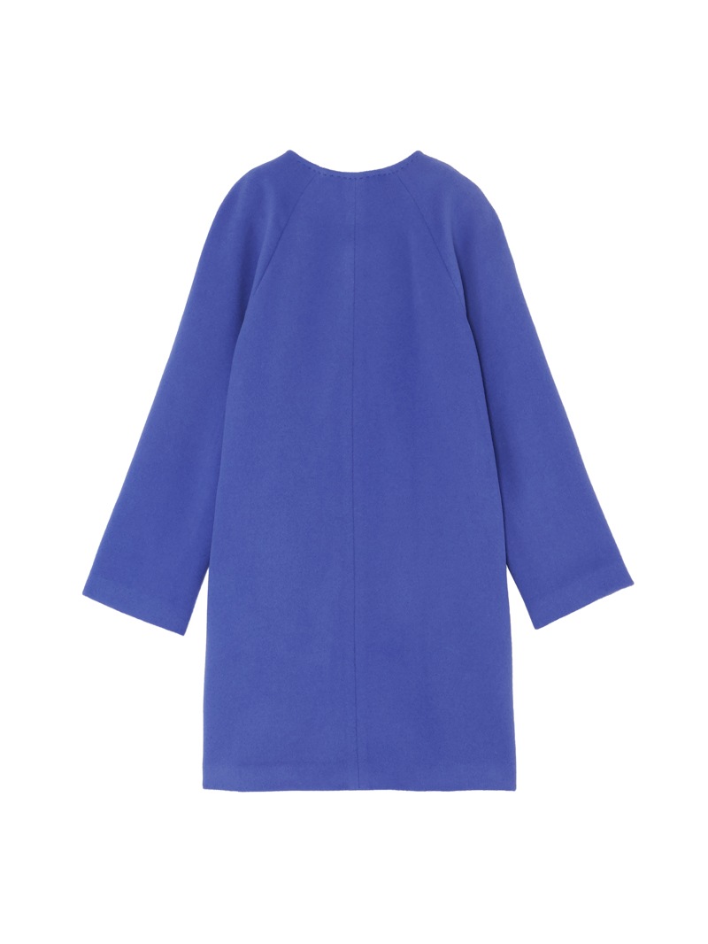 ウエストから裾に向かってAラインで広がるノーカラーコート。アンゴラ混の糸を使用した上質なコートです。アンゴラ特有のふくらみと柔らかな風合い、程良い光沢感がポイント。コーディネートやシーンを選ばず着用できるグレーに加え、冬のスタイリングに華やかさをプラスできるキャメルとブルーの三色展開です。