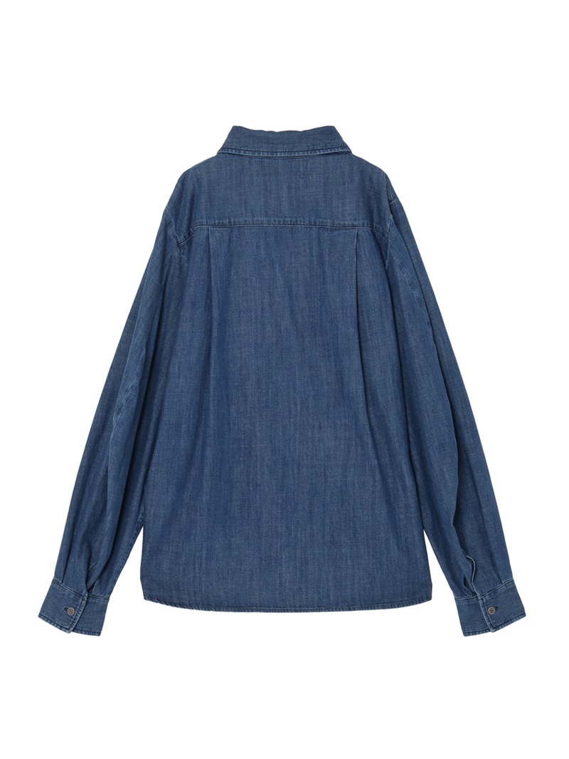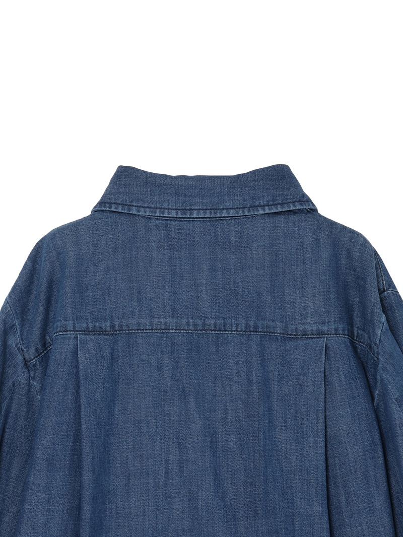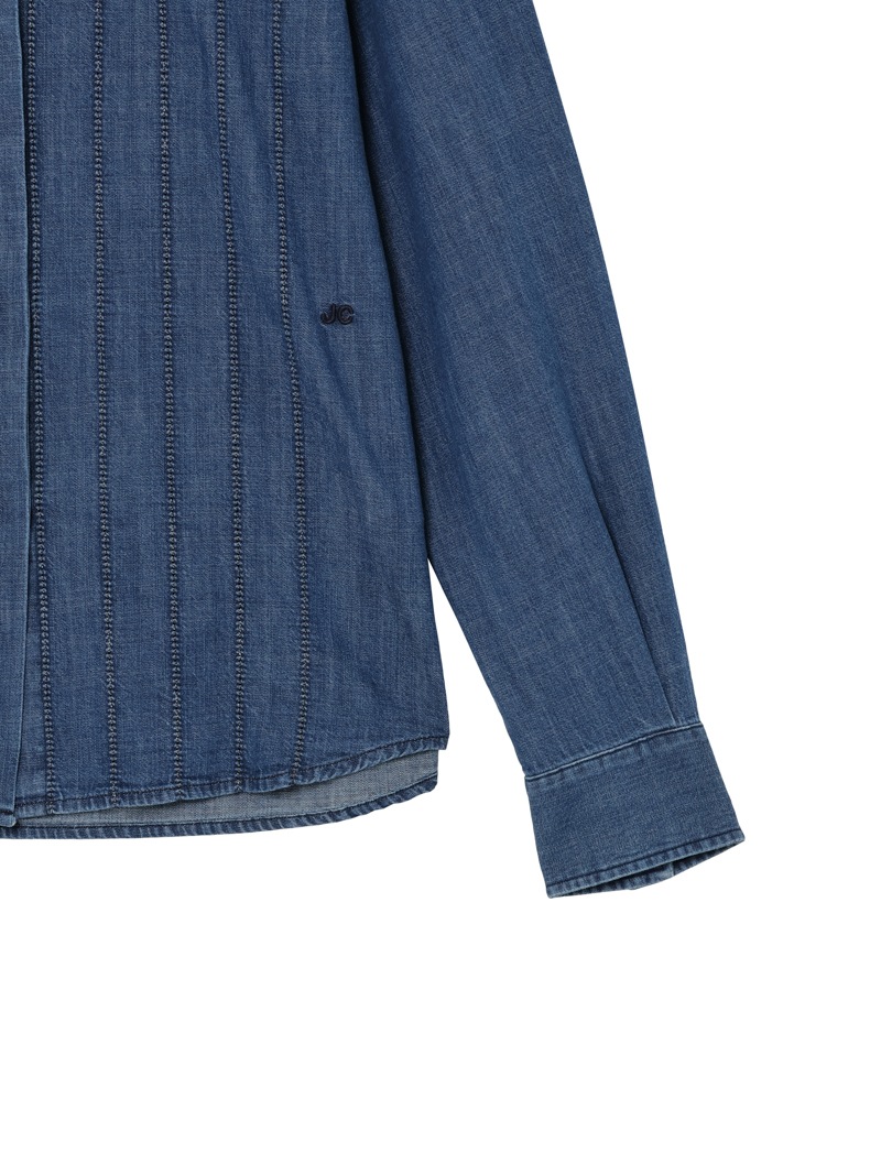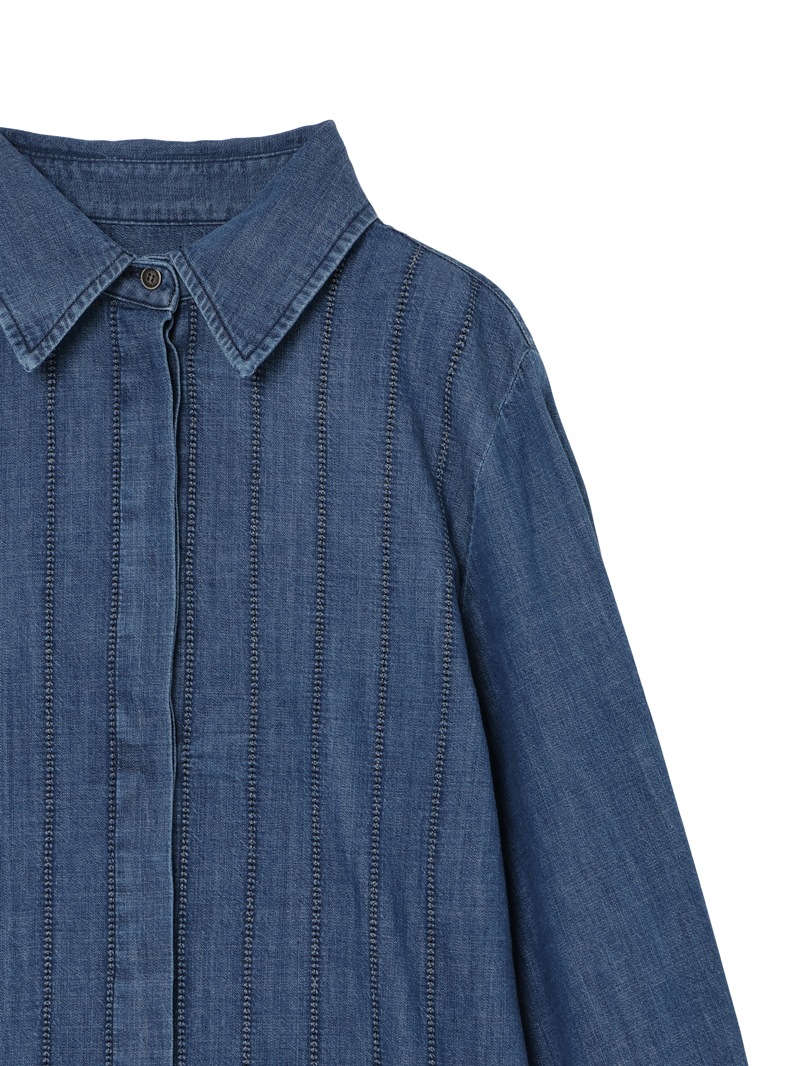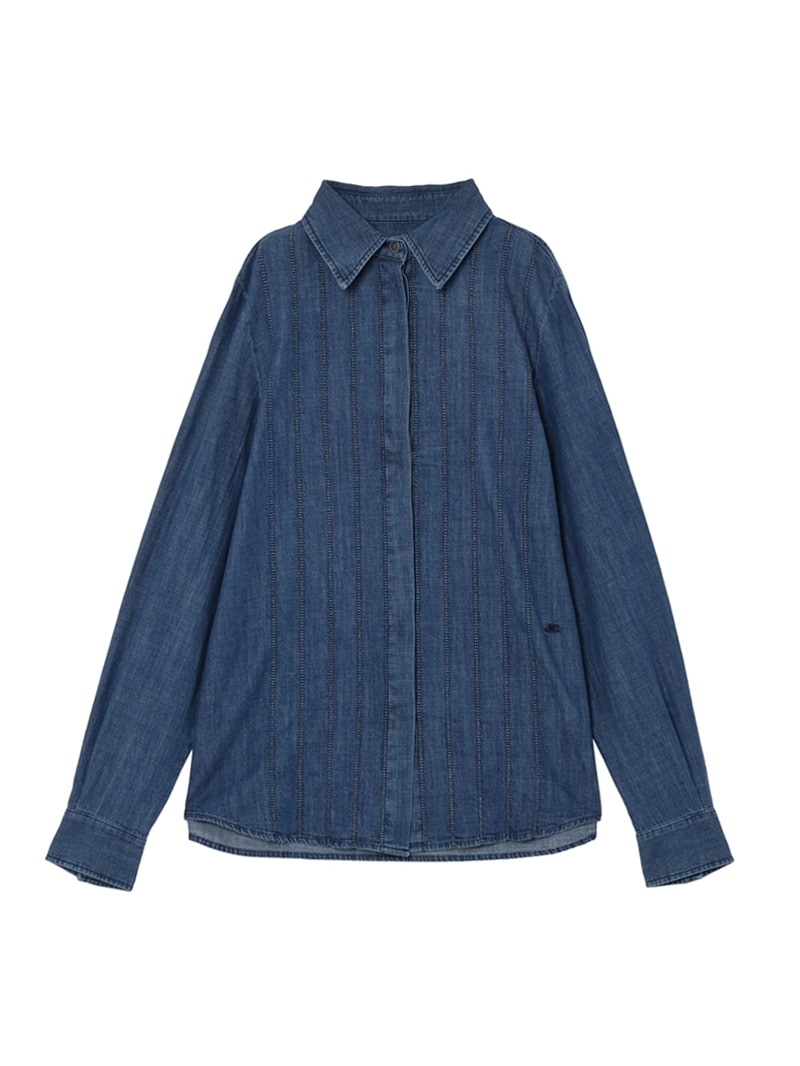 フロントにアジュール刺繍をあしらったライトコットンのブルーデニムシャツ。透かし模様が特徴的なアジュール刺繍の技法を用いてストライプを描いています。袖幅を多めに取ったボリュームスリーブデザインで、ウエスト部分にはJCの刺繍付き。軽石と共に酵素洗浄を行い軽やかな風合いを演出しています。