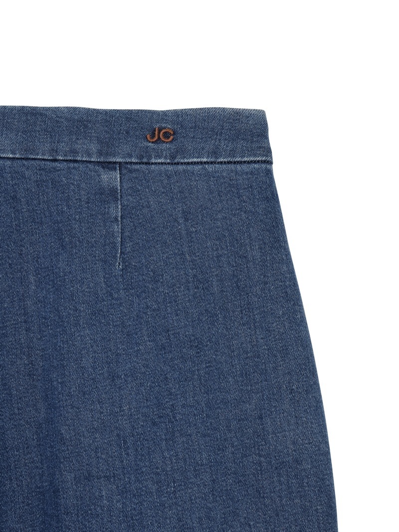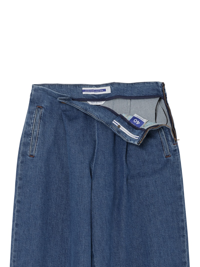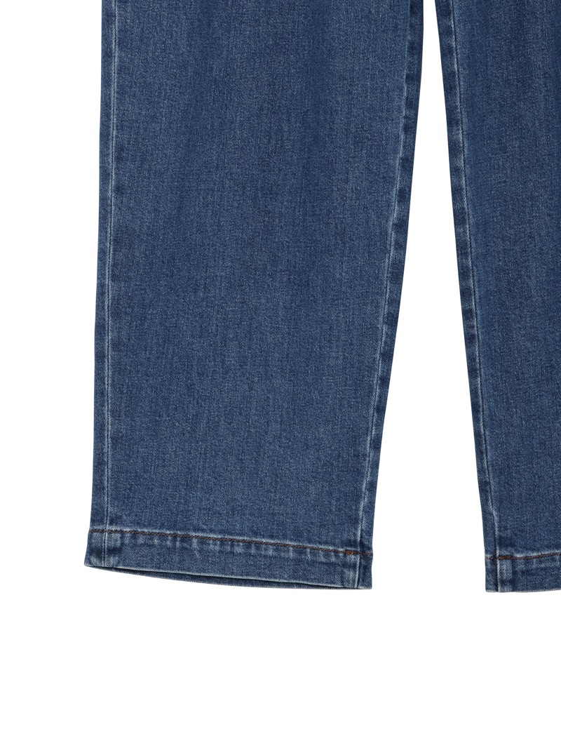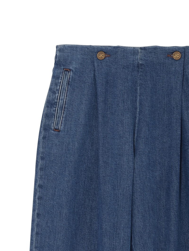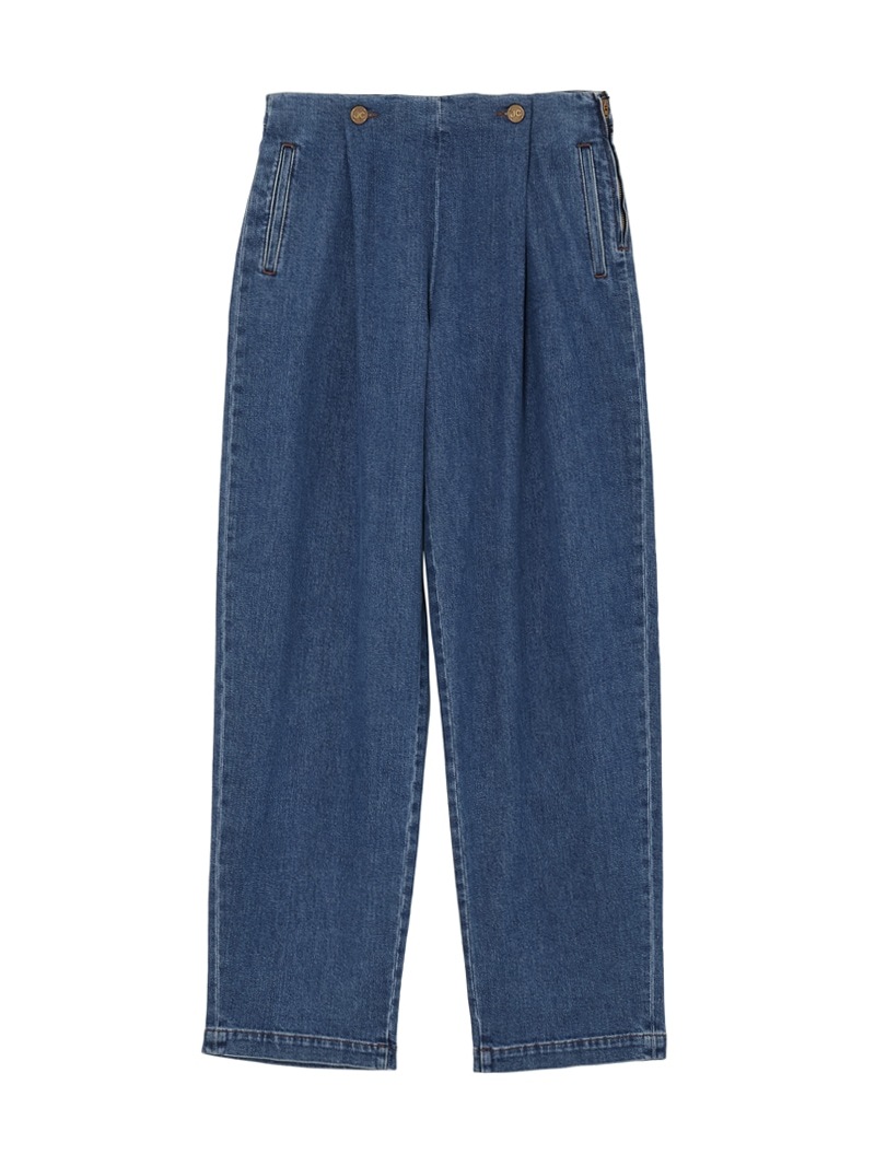 シングルプリーツのバレルパンツ「KIRSTEN」。ウエスト部分にヒダを作りボタン止めをした、ユニークなデザインのパンツです。太めのカーヴィーなシルエットで、トレンドライクな1本。11ozのコンフォートリヨセル ブルーデニムを使用。酵素洗浄が施されています。サイドジップ開閉。
