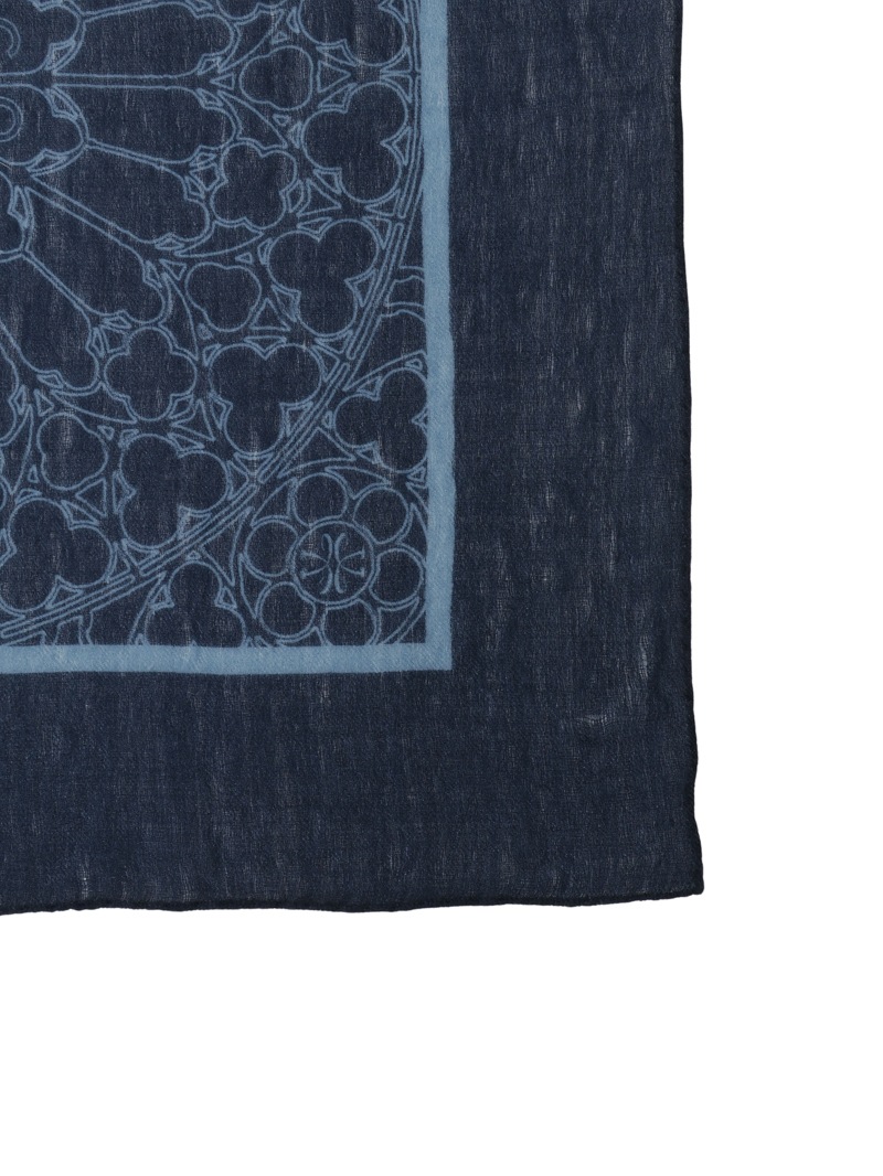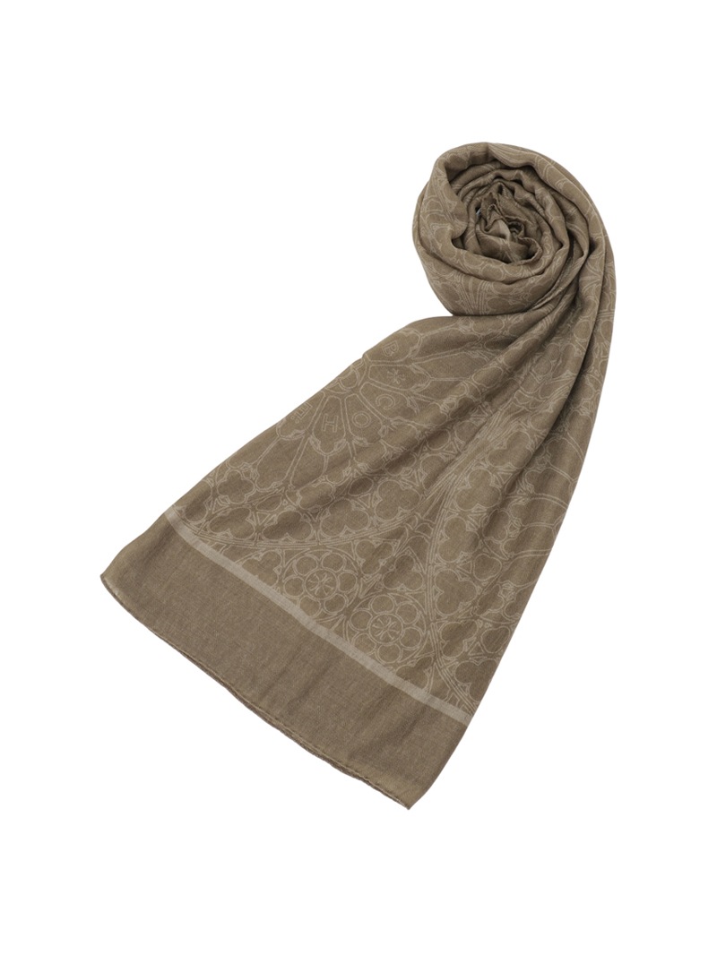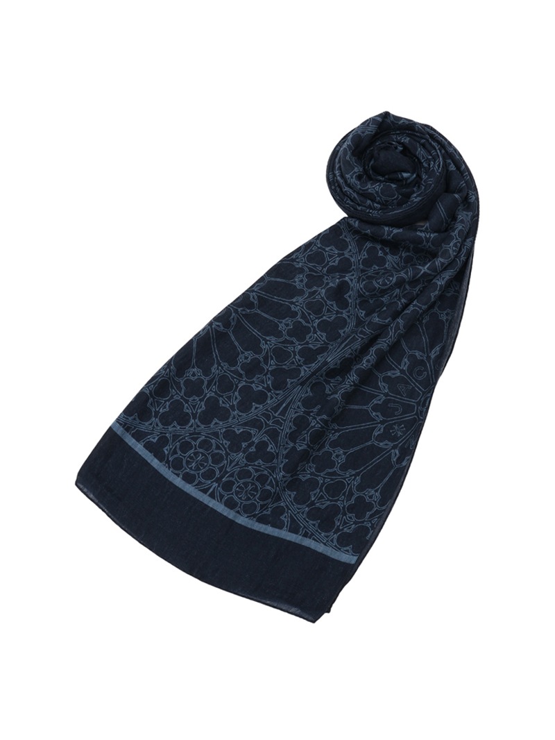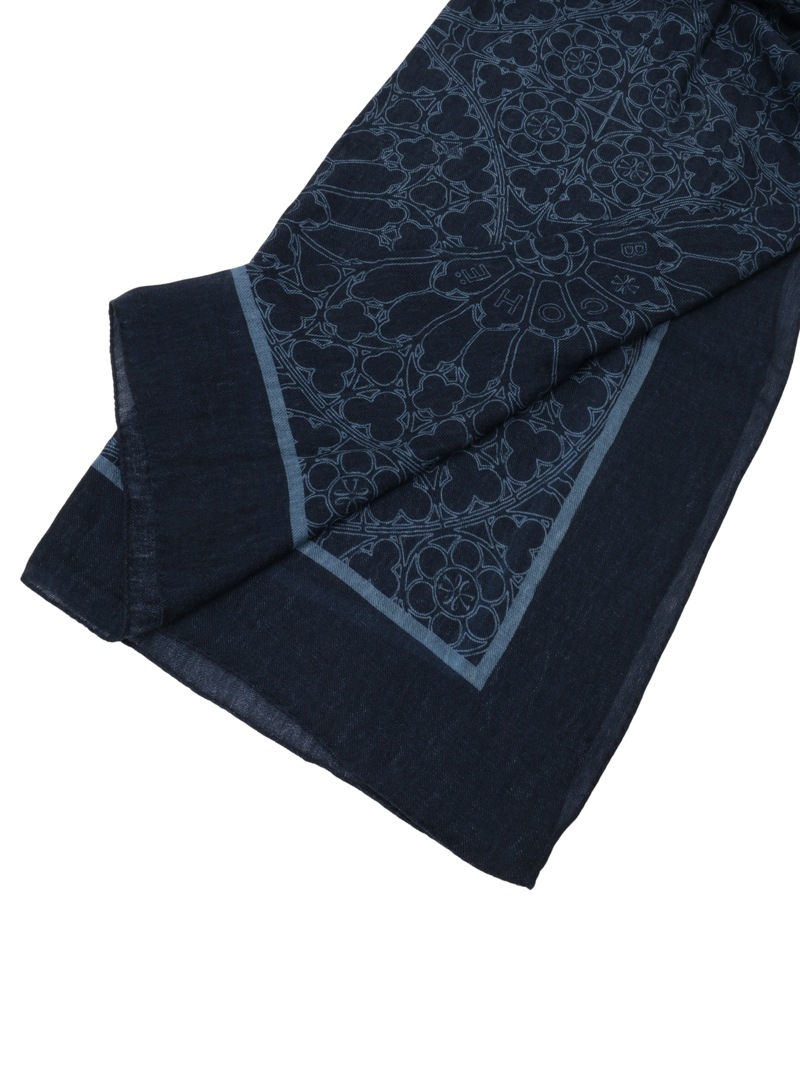 ローズウィンドウにブランドロゴを中央に配したデザインをプリントしたウールカシミア素材のスカーフ。