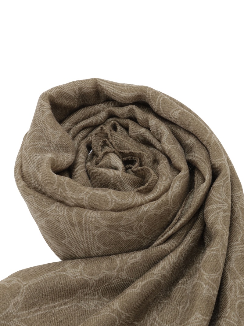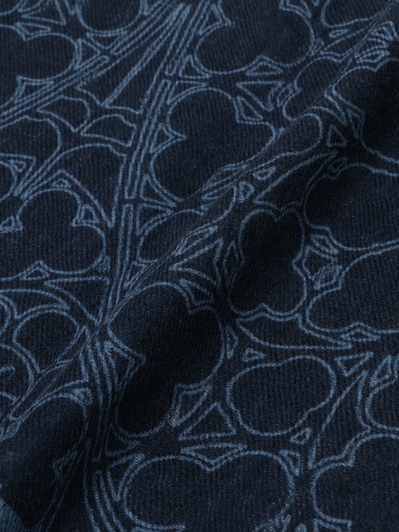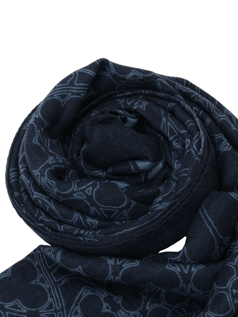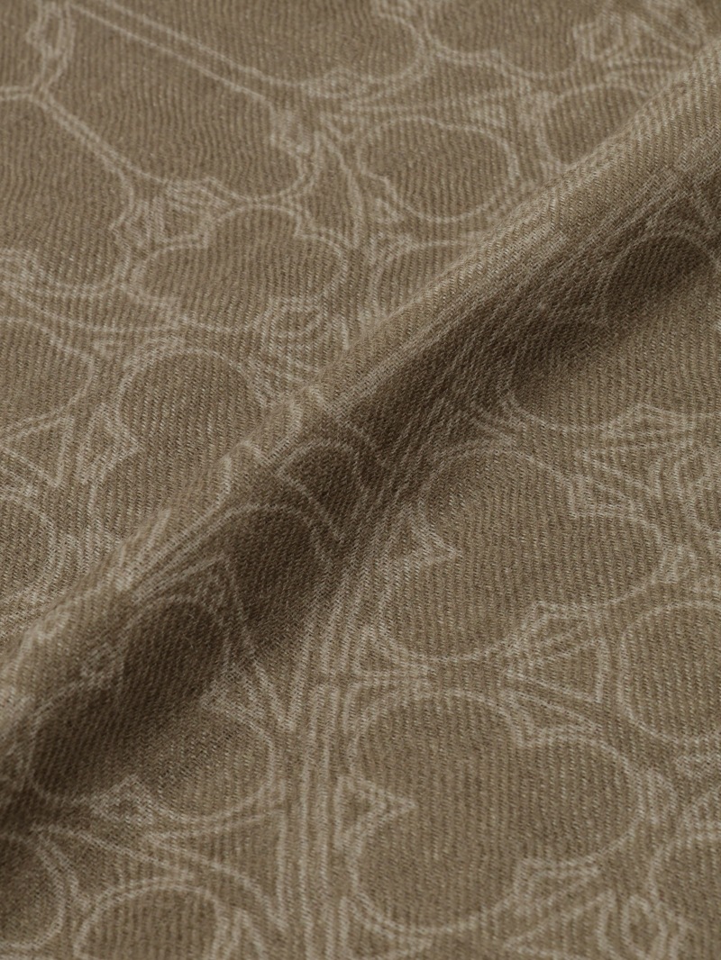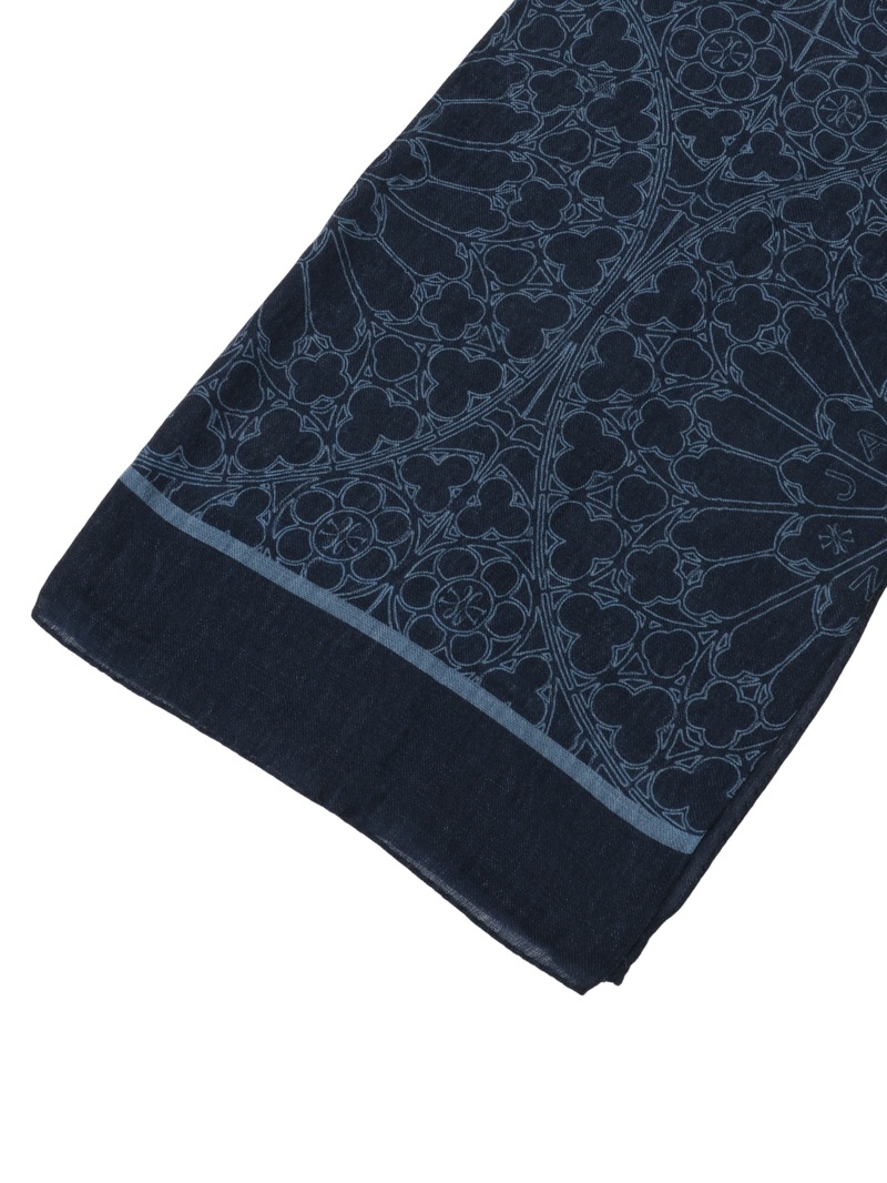 ローズウィンドウにブランドロゴを中央に配したデザインをプリントしたウールカシミア素材のスカーフ。