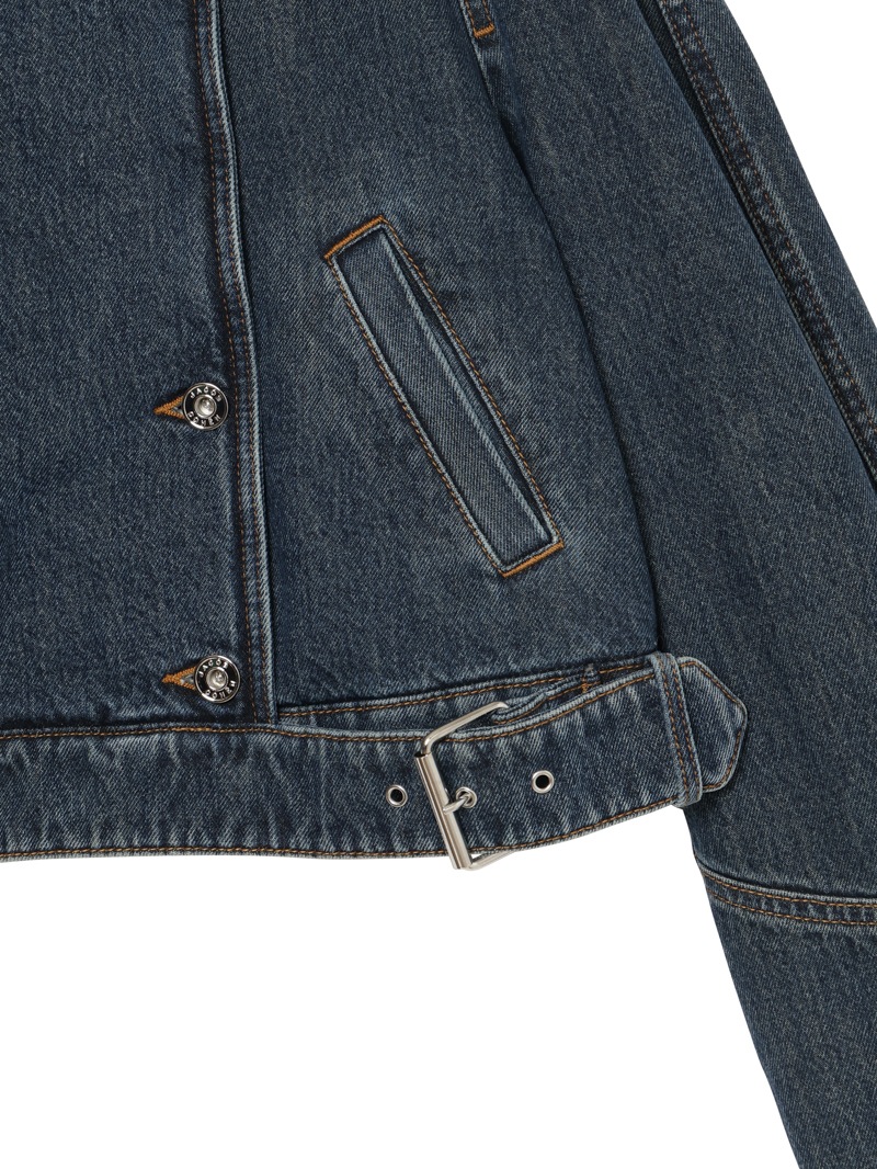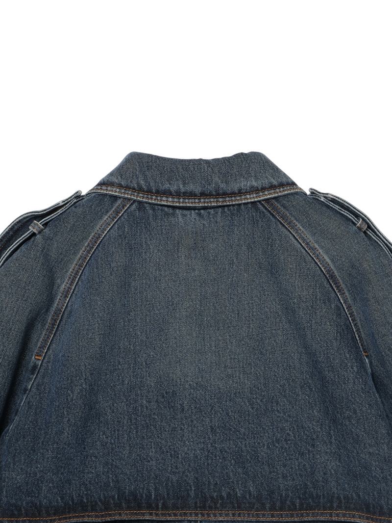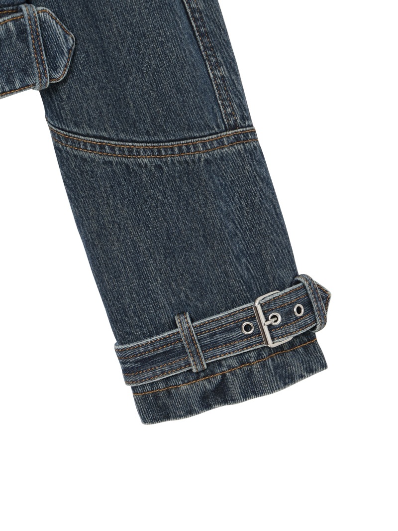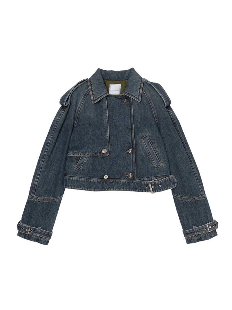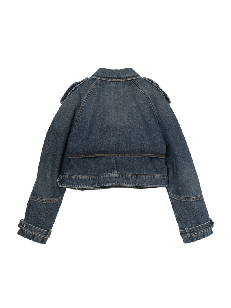 バイカージャケットにインスパイアされたクロップドフィットのダブルブレストデニムジャケット。12ozのオーセンティックコットンデニムにストーンウォッシュ加工を施し、ユーズド感を演出しています。大きなラペルとエポレットが特徴的で、ウエストと袖口に調節可能なベルトが付いています。