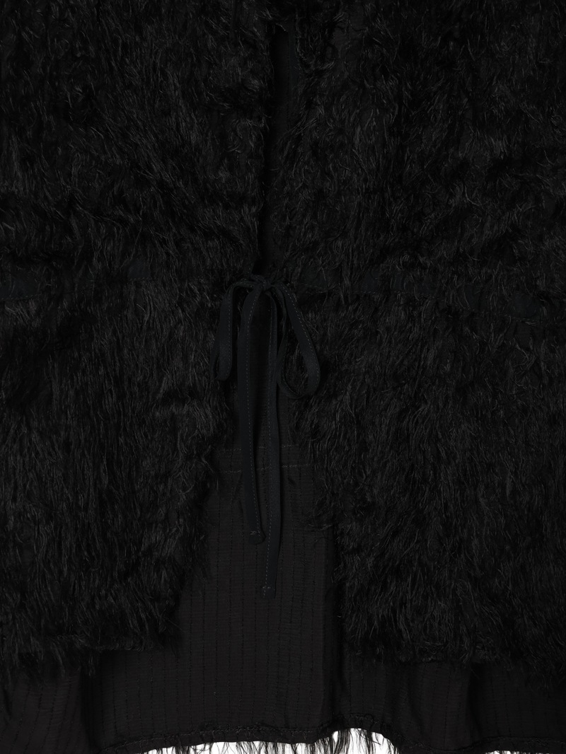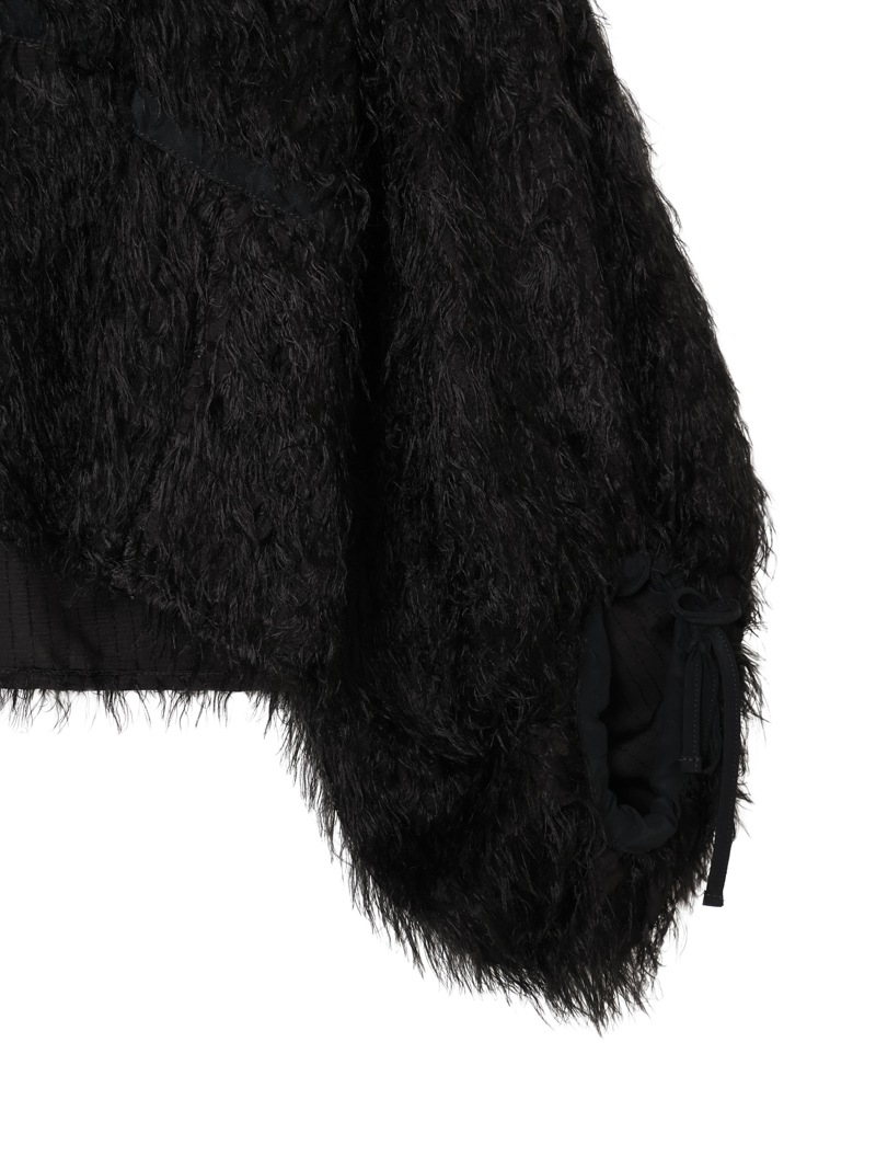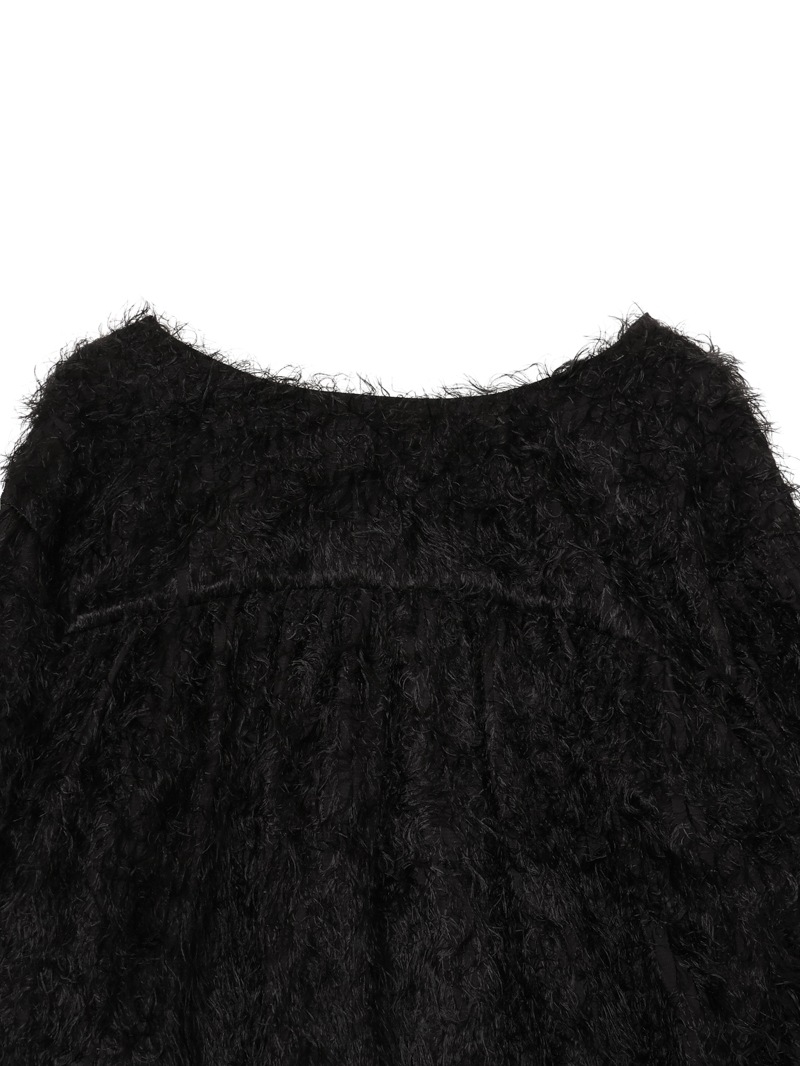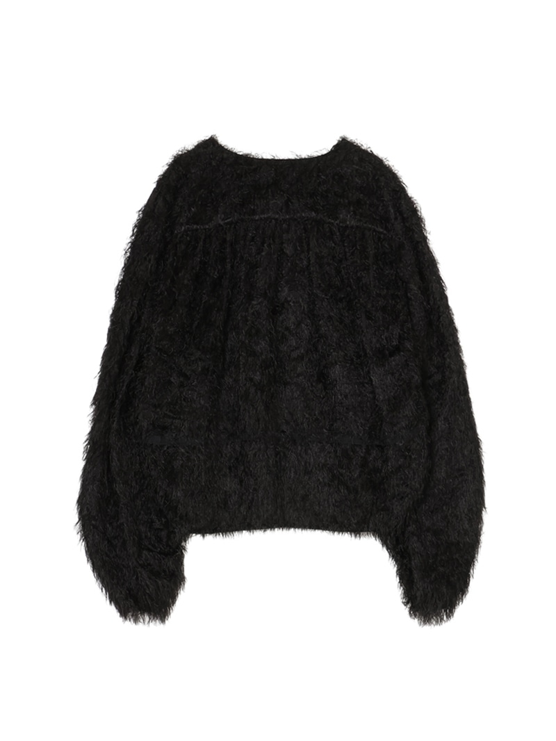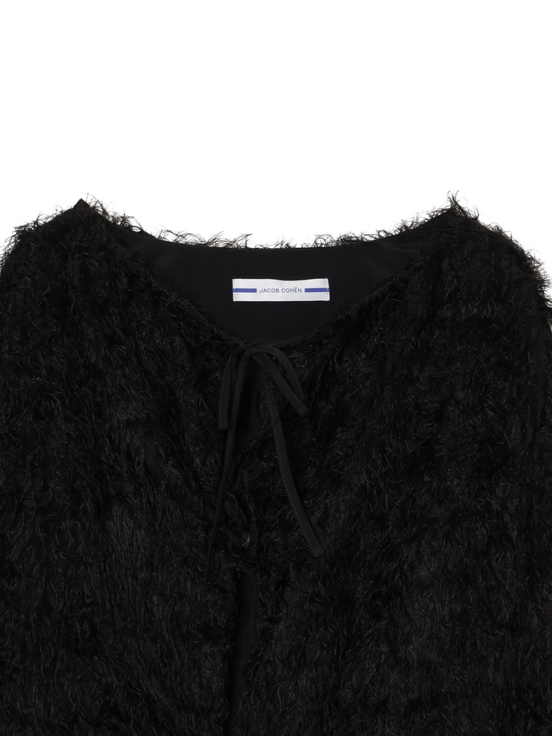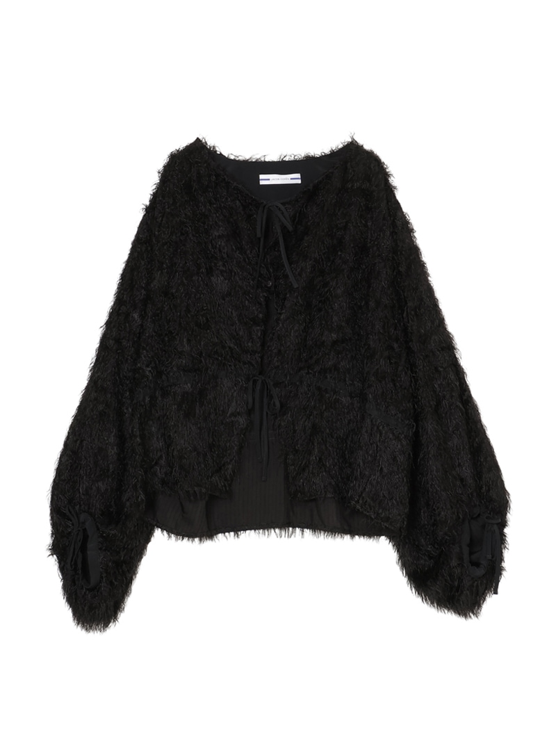 襟元、ウエスト、袖口をドローコードで絞ったブラウスカーディガン。背面、肩口にもギャザーを寄せ、リボン留めの前立てで仕上げています。ジャガード織りの一種であるフィルクーペ技法を用いた、ボリュームのあるフェザーフリンジがロマンティックなアイテムです。