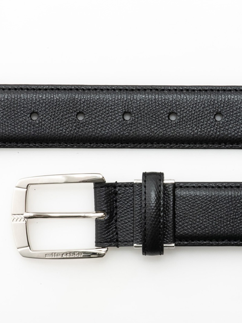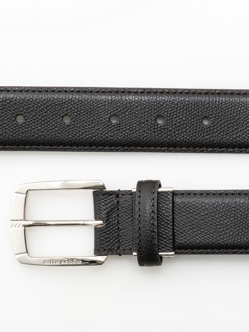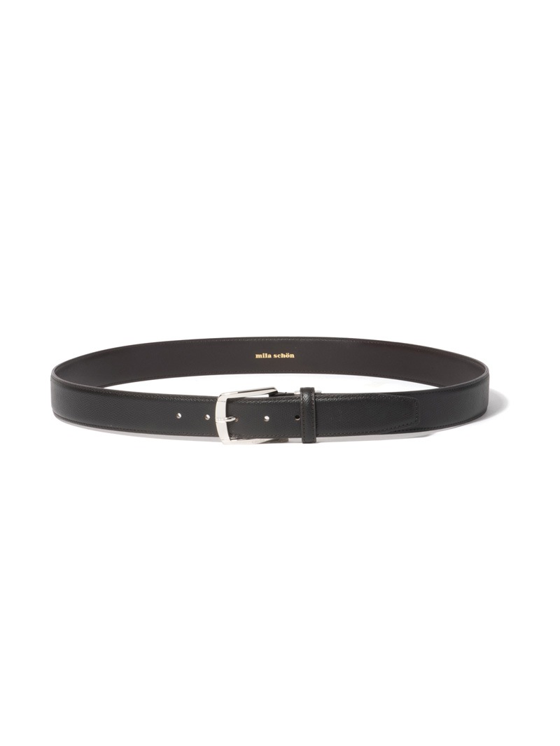 シュリンク調のエンボスレザーを使用したベルト。バックルの先端部分にはミラ・ショーンの象徴でもあるシェブロン柄、サイドにはミラ・ショーンのロゴを刻印しています。大人の休日のジャケットスタイルからビジネスシーンまで、幅広いスタイルにマッチします。