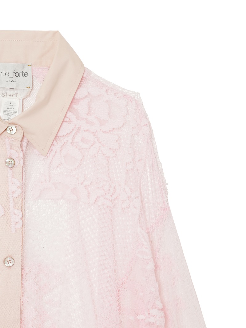 様々なパターンのレースを組み合わせたオーバーサイズシャツ。ゆったりとしたシルエットがシックで都会的な印象に。