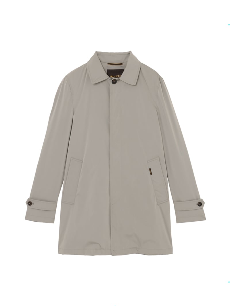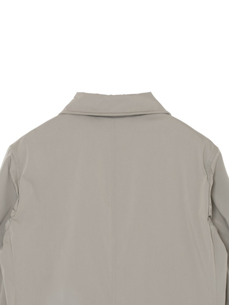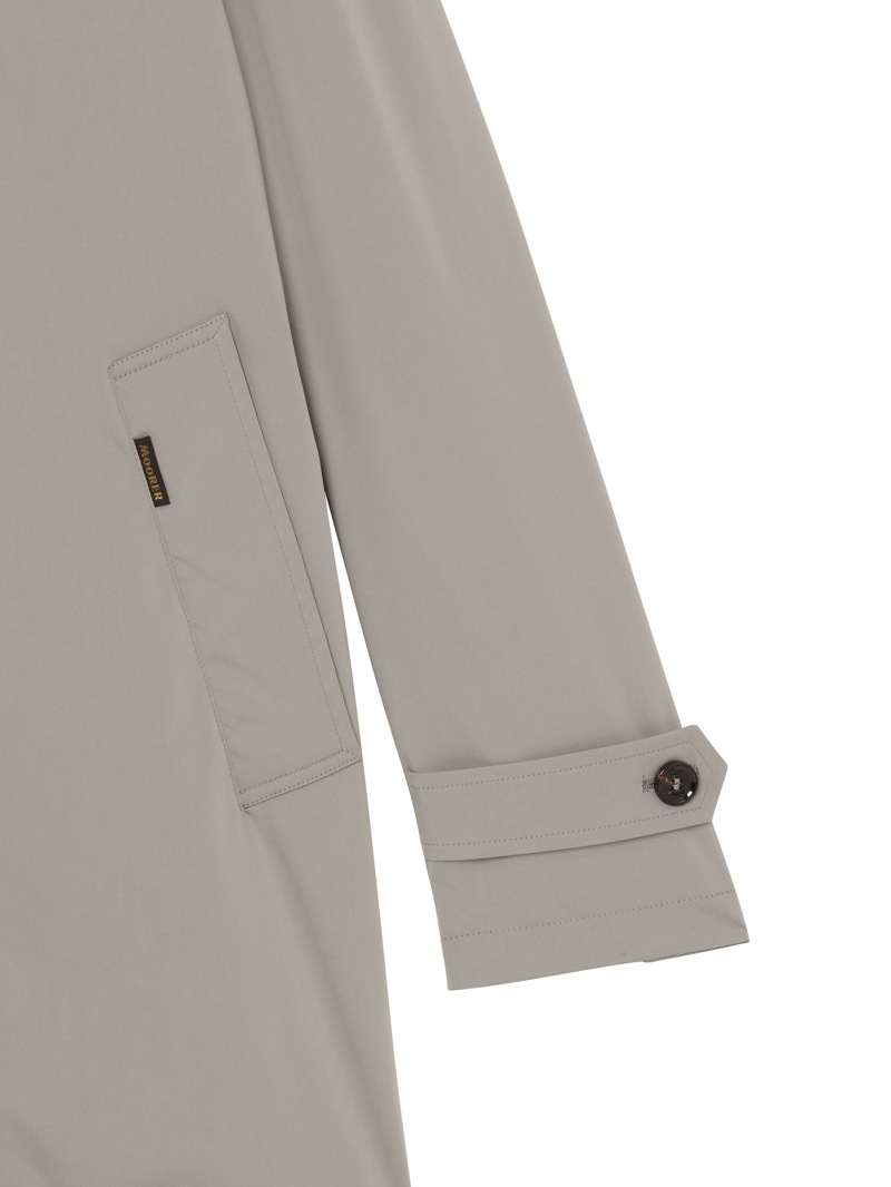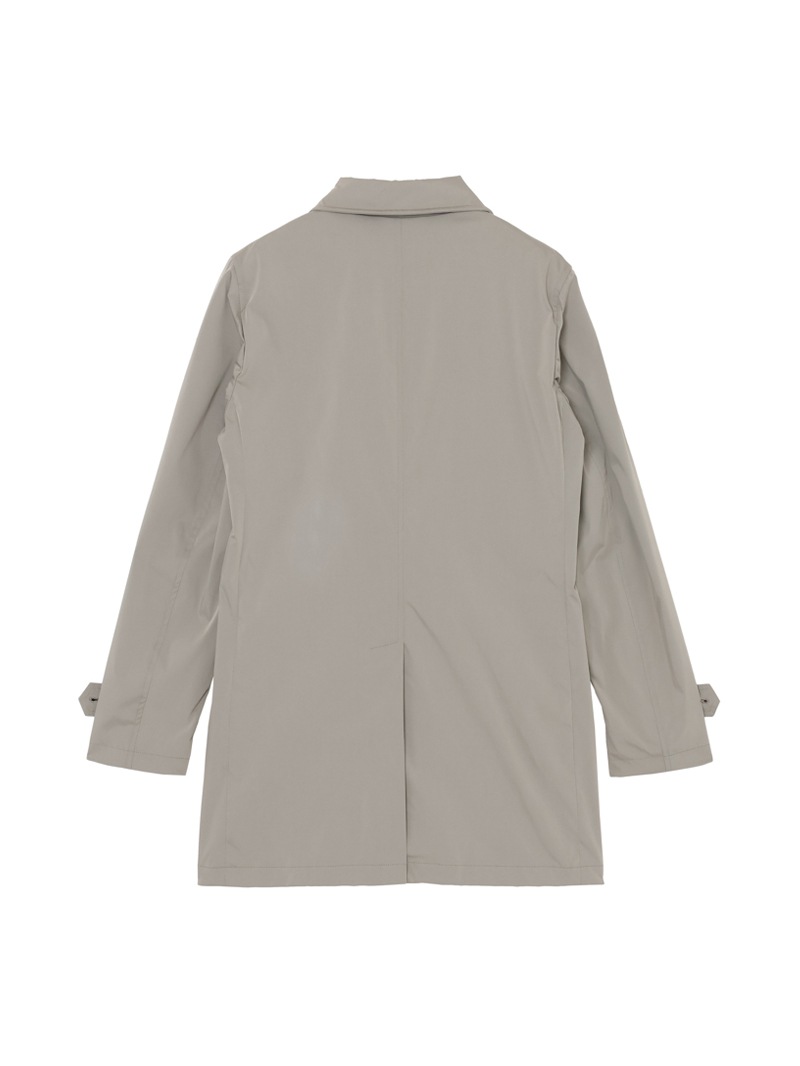 エレガントで洗練された印象のステンカラーコート。非常に細やかで光沢のある上質なダブルフェイスストレッチサテンに、撥水加工を施しています。