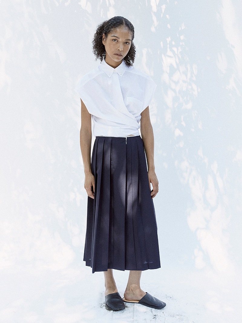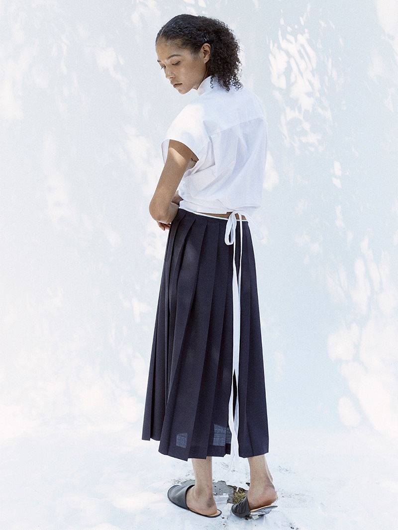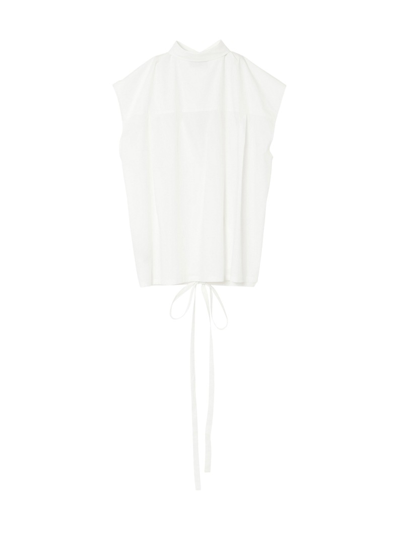 オーバーサイズのノースリーブブラウス。パンツにもスカートにも合わせやすいマルチアイテム。裾のリボンをウエストで交差して結びカシュクールのように着用します。襟元のみボタン仕様。