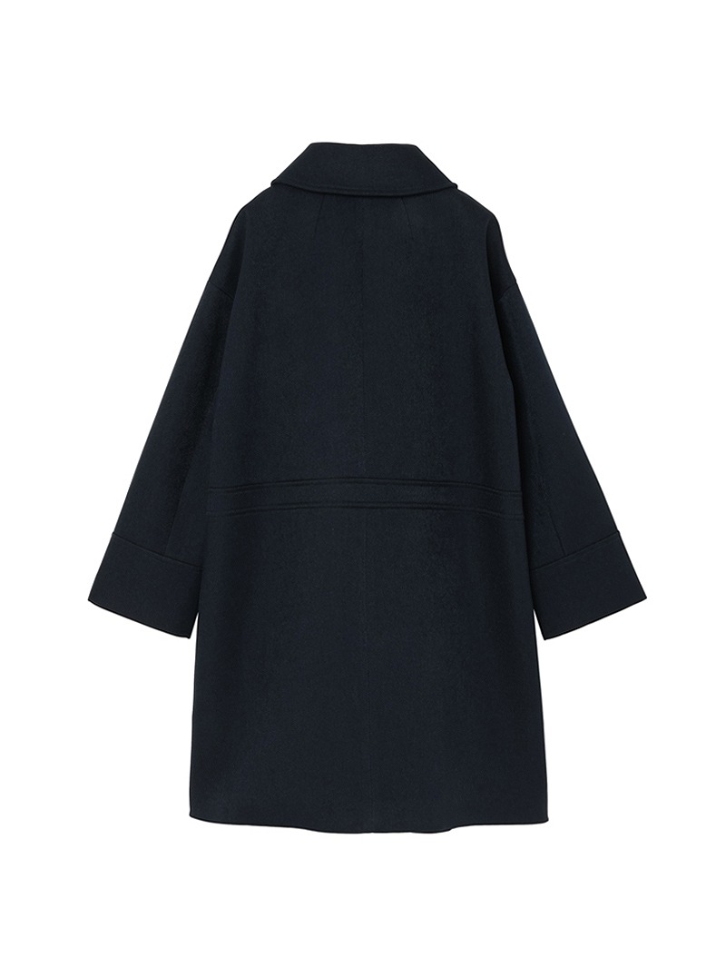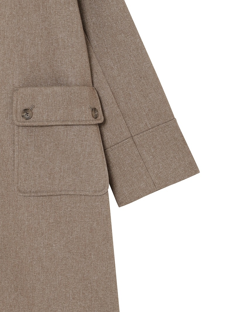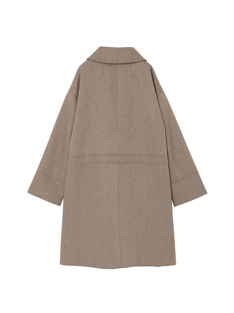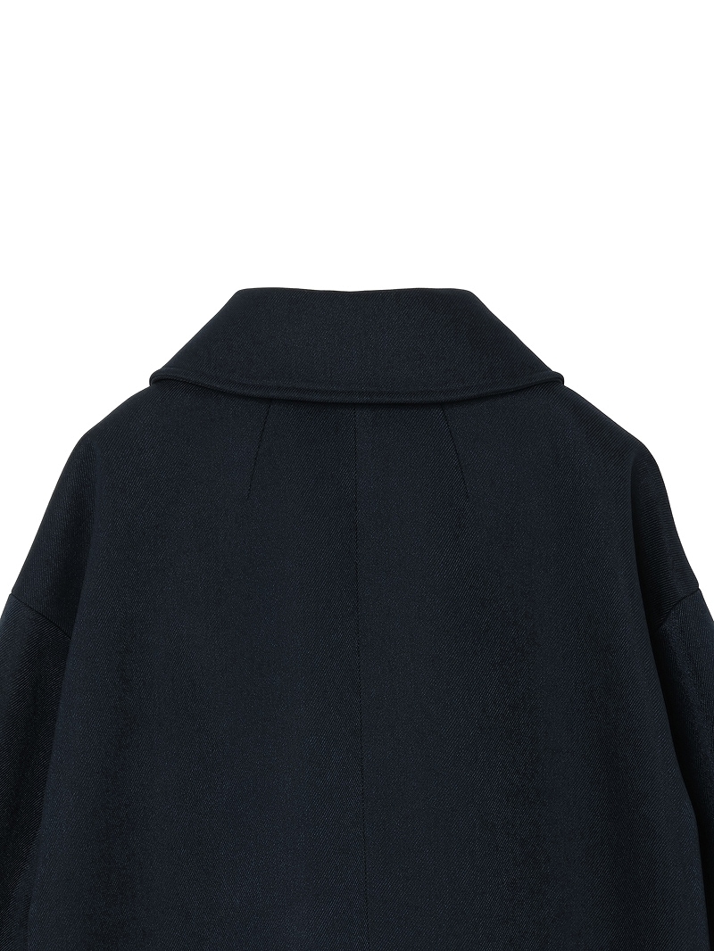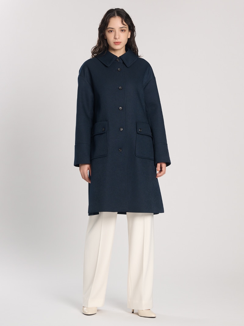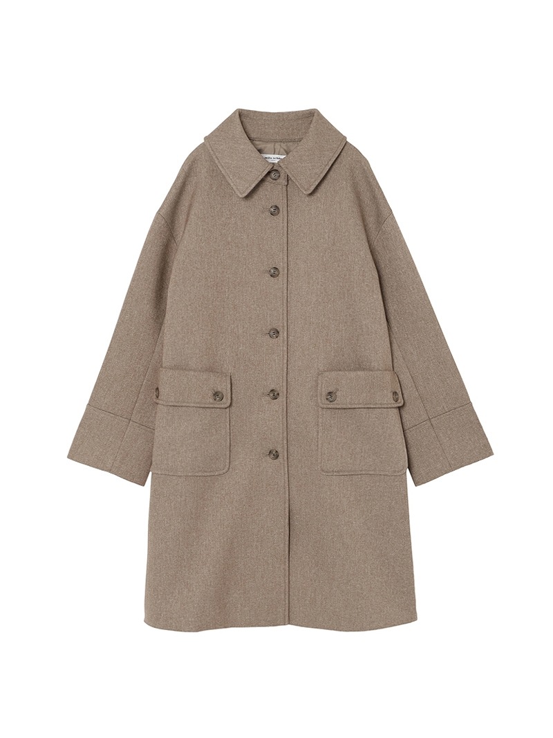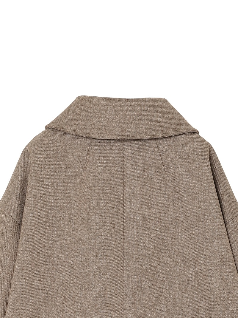 分散染料、CD型分散染料、カチオン染料という3種の染料を用いた特殊な染色技法により、奥深いメランジを表現したコート。スポンジボンディングによる3層構造で、暖かなふくらみとハリ感を持たせています。バルマカーンコート(ステンカラーコート)をベースにした、こだわりのディテールが光る一着です。