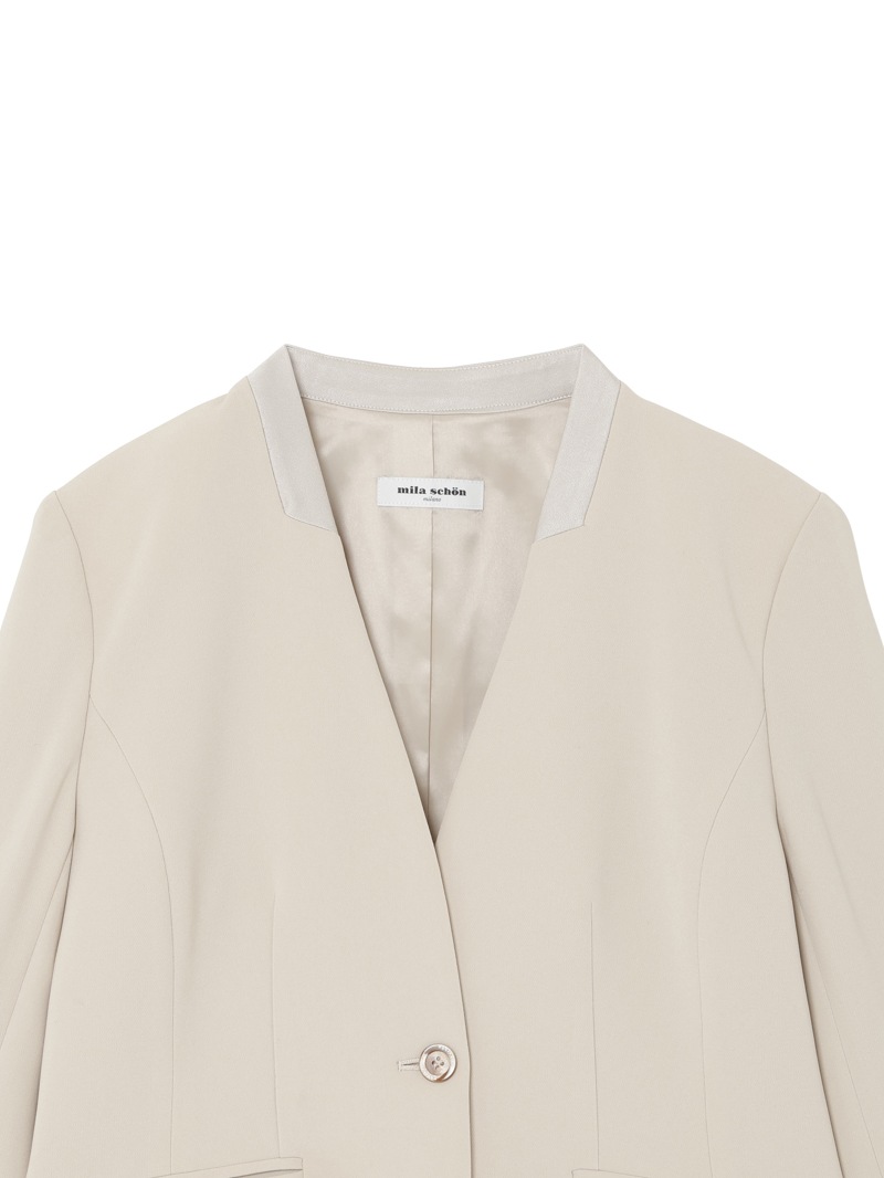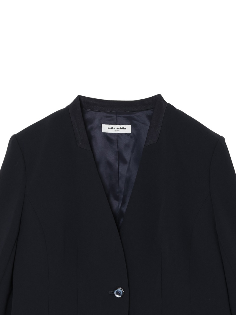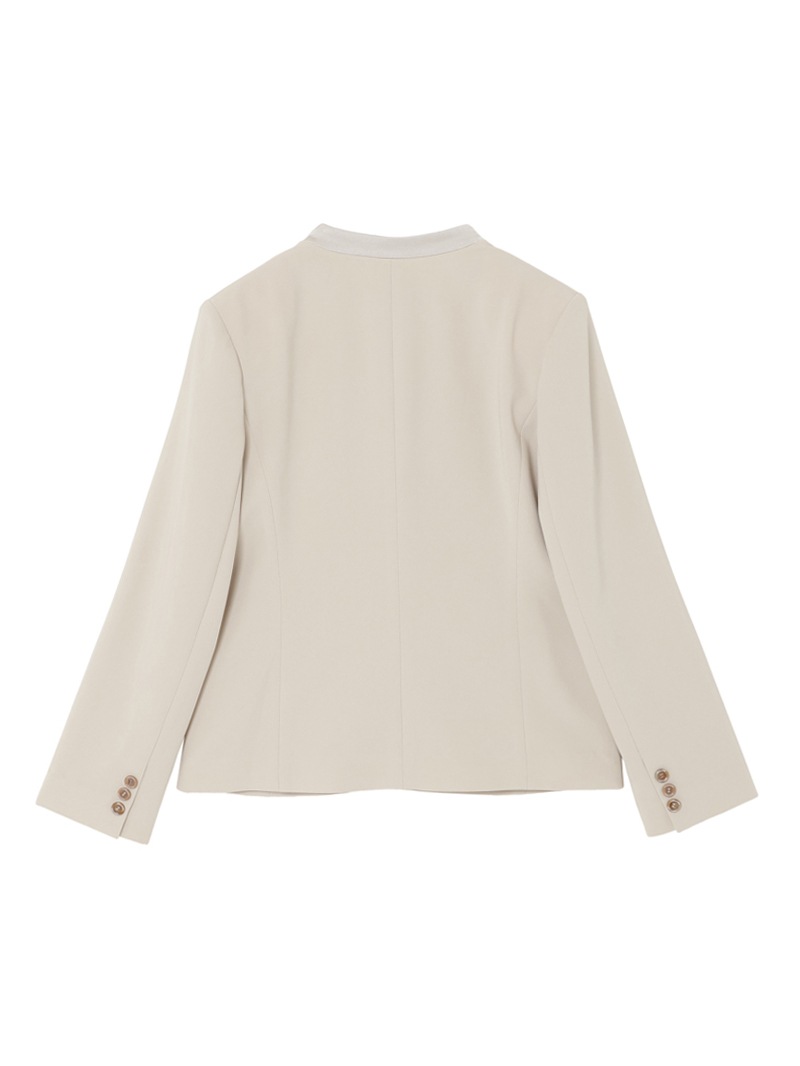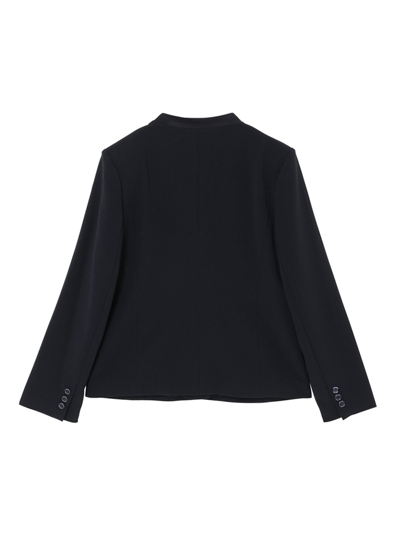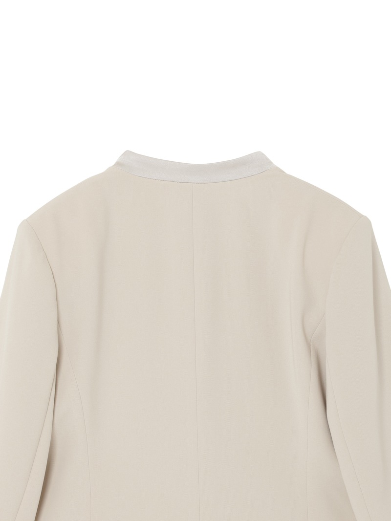 トリアセテートと特殊な加工を施したポリエステルを組み合わせた素材を使用したノーカラージャケット。トリアセテート特有の美しい光沢と深みのある発色が特徴的なダブルクロス素材は、ボディラインを拾いにくいハリ感と動きやすさを両立するストレッチ性も魅力。同素材の