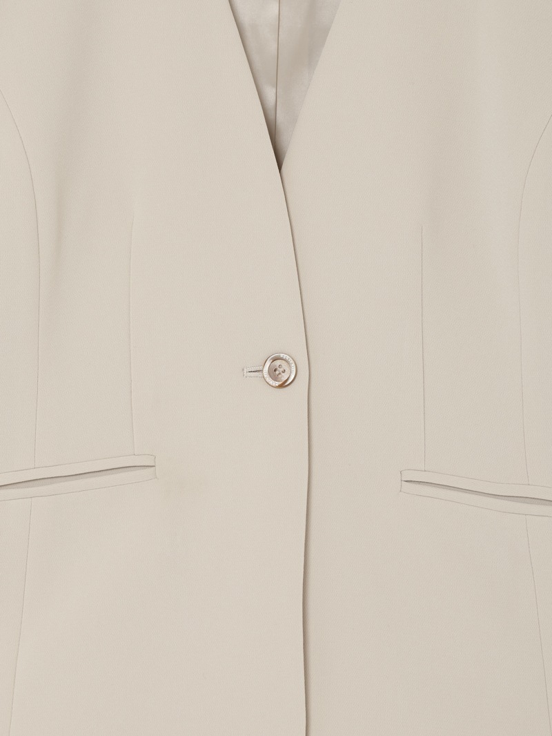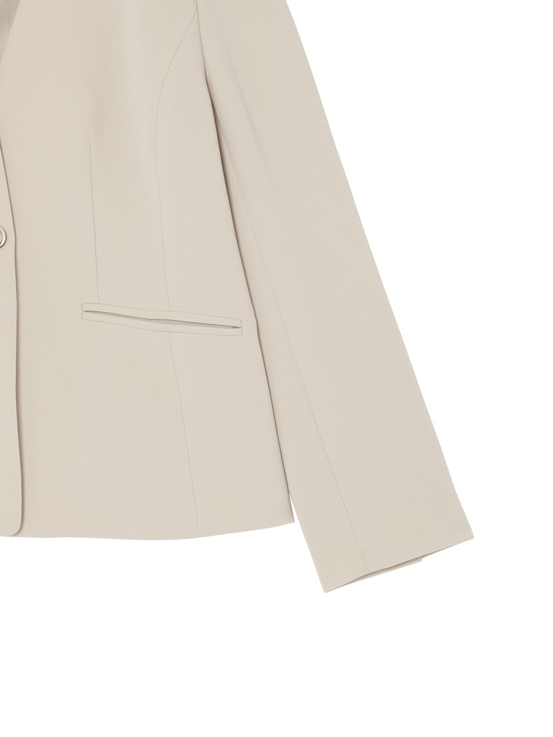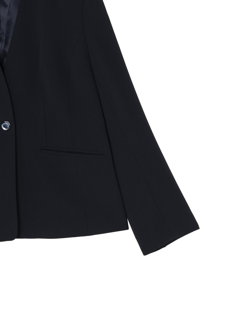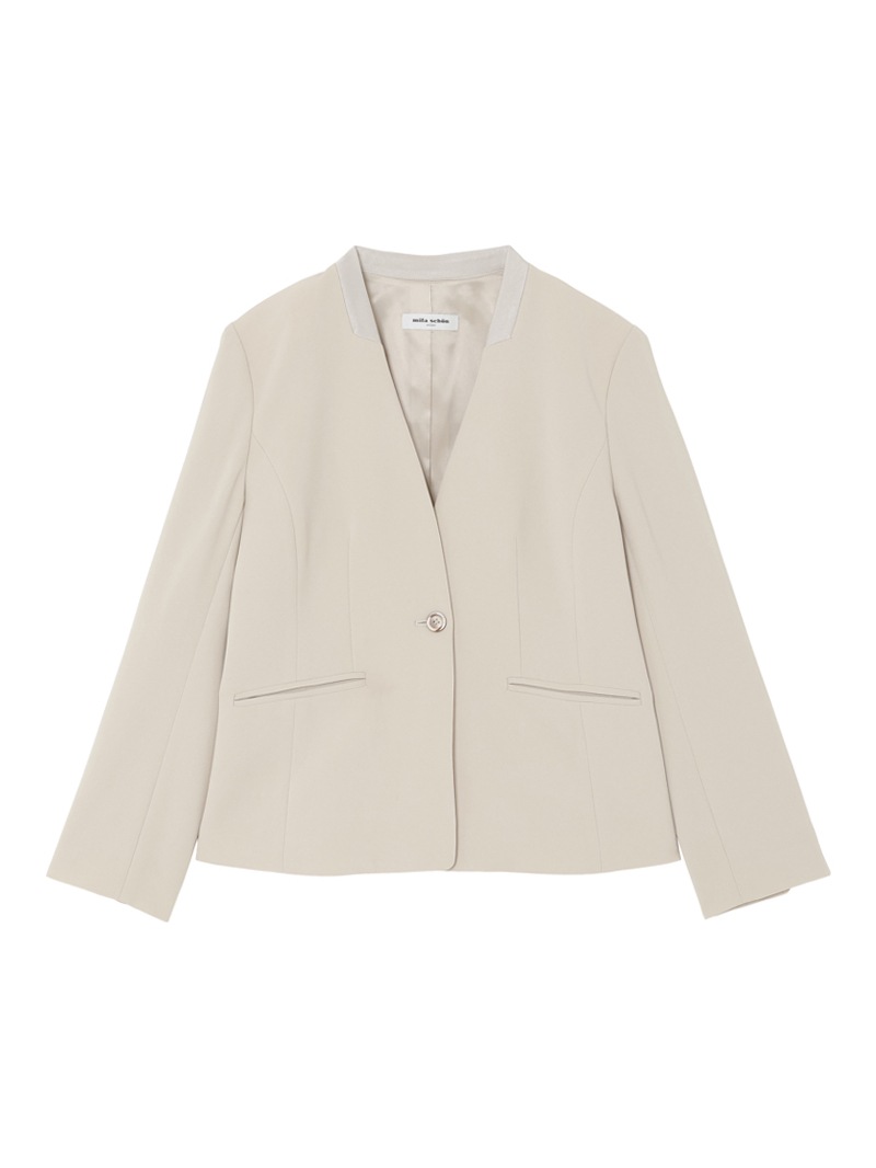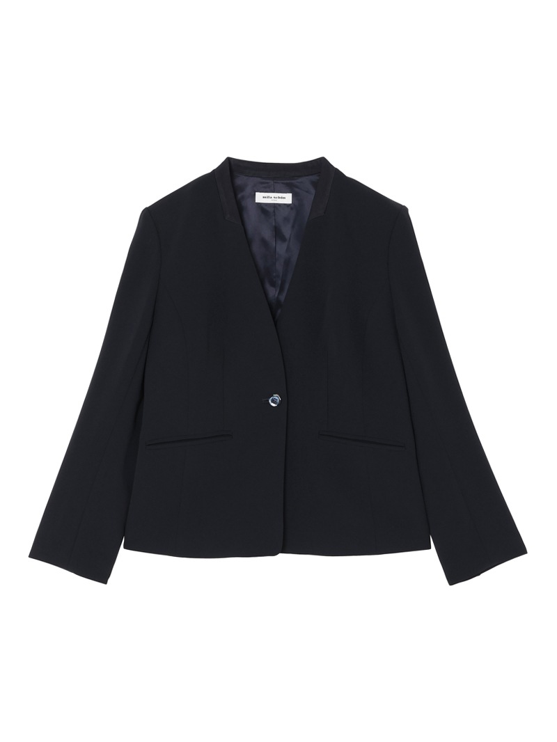 トリアセテートと特殊な加工を施したポリエステルを組み合わせた素材を使用したノーカラージャケット。トリアセテート特有の美しい光沢と深みのある発色が特徴的なダブルクロス素材は、ボディラインを拾いにくいハリ感と動きやすさを両立するストレッチ性も魅力。同素材の