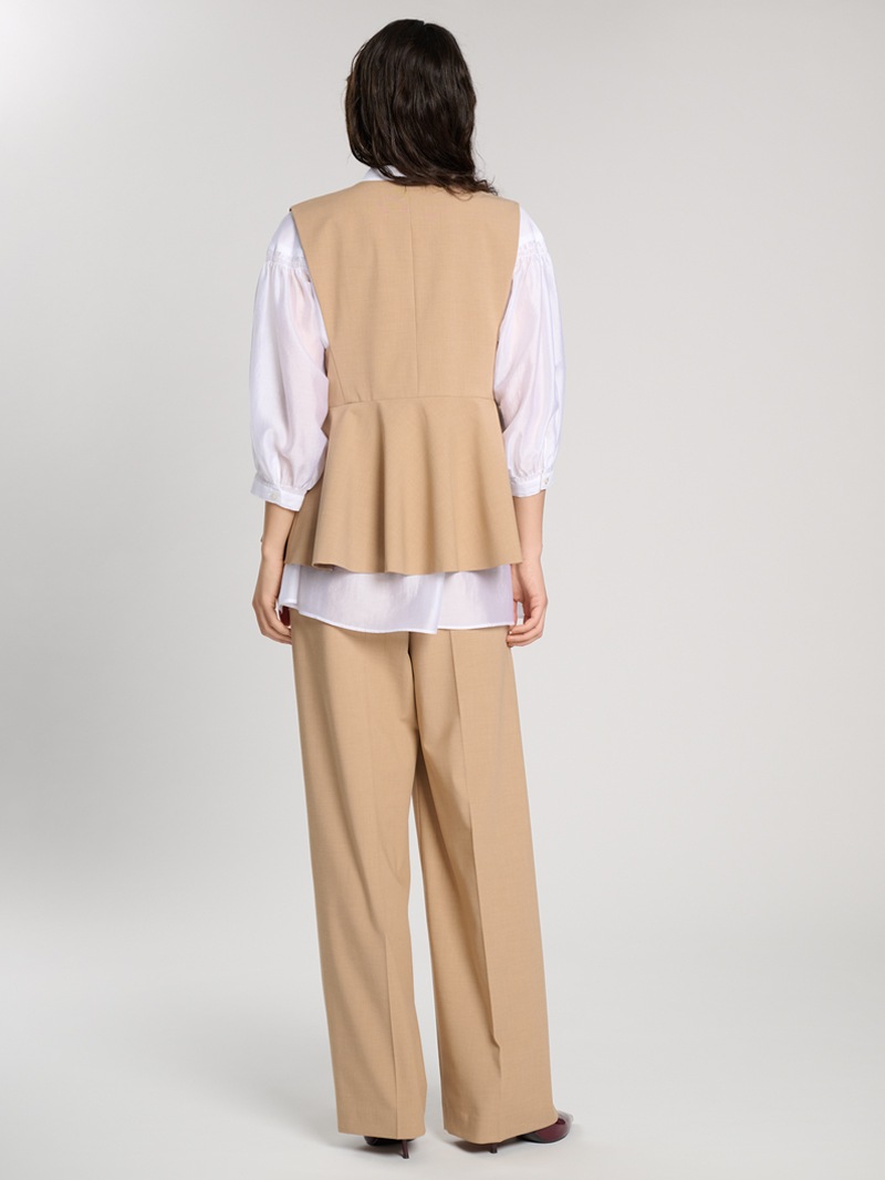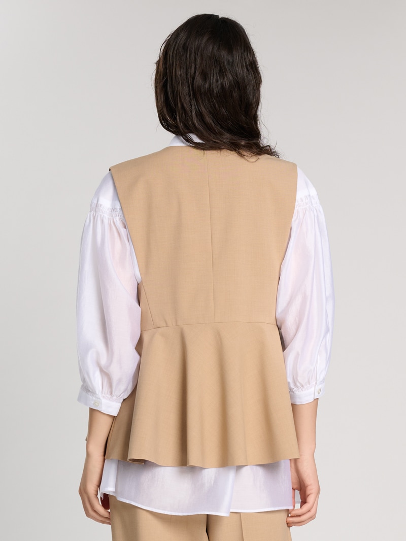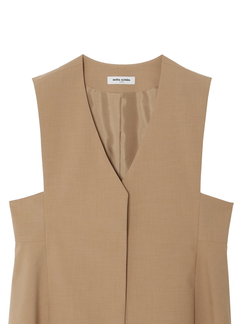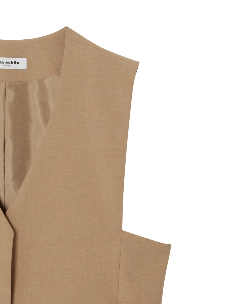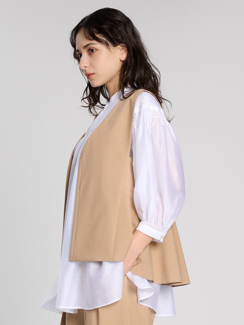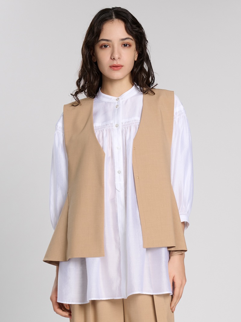 32/2のポリエステルレーヨンを使用した、トロ2WAYストレッチ素材のジレ。サイロコンパクト糸を使用しているため毛羽が少なく、ふくらみ感のある風合いが特徴です。また、プリシカルは糸を着色する際に水を使用しない方法を採用した環境配慮型素材です。