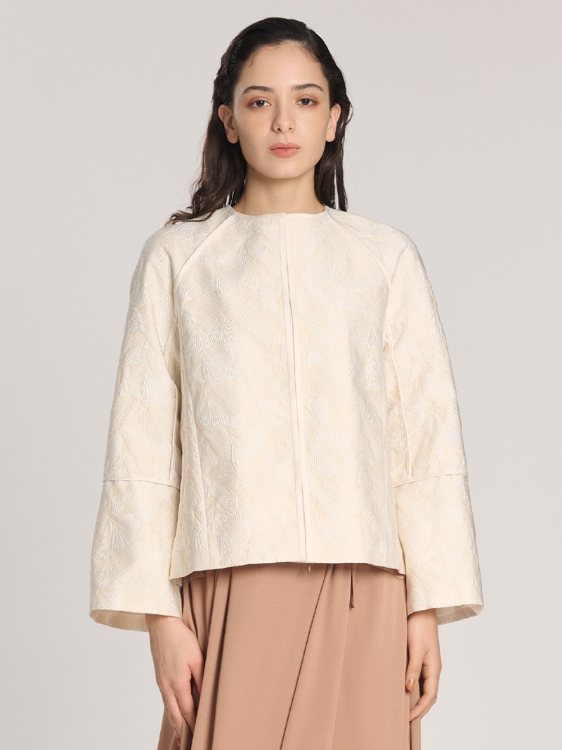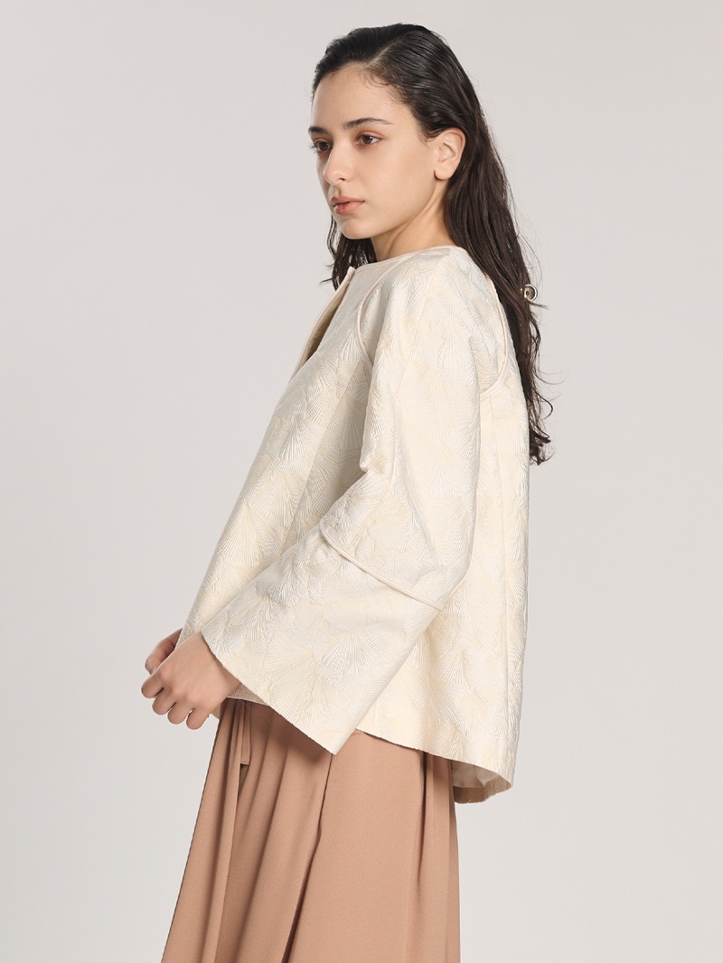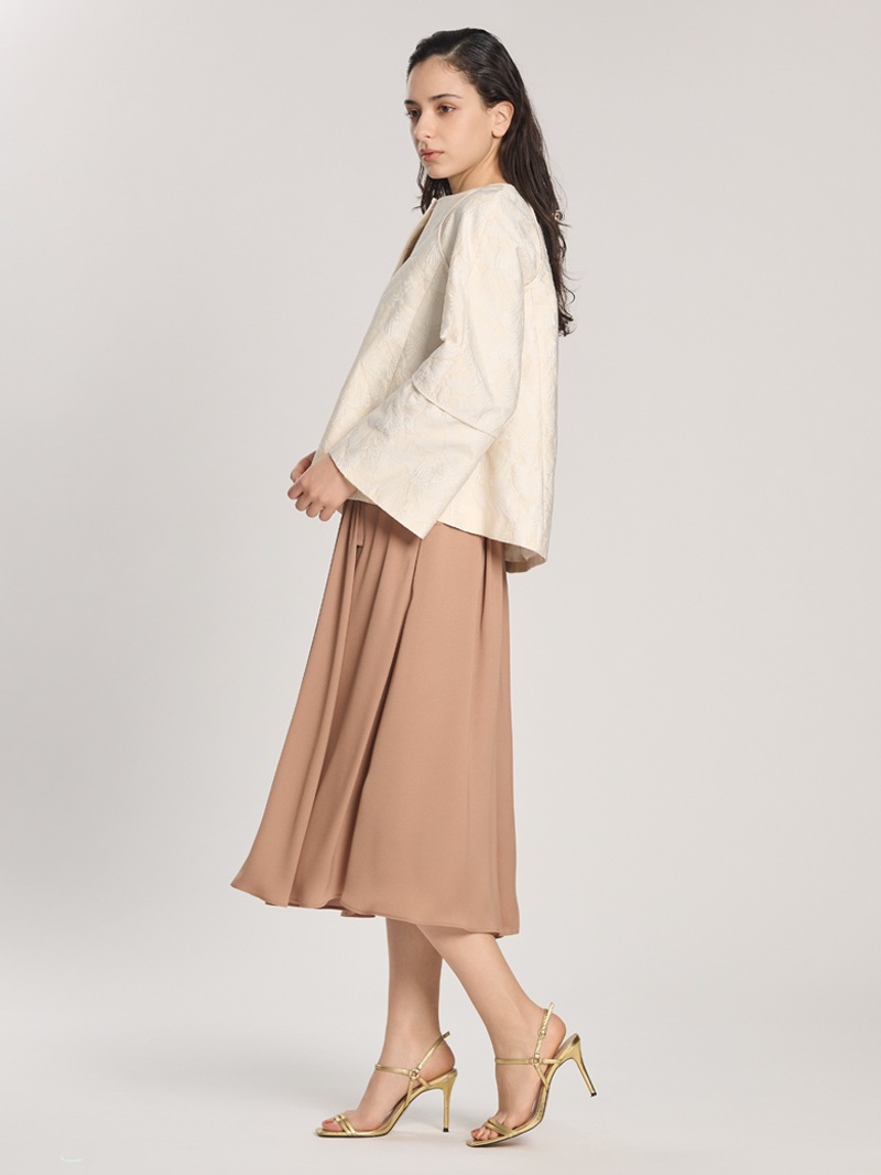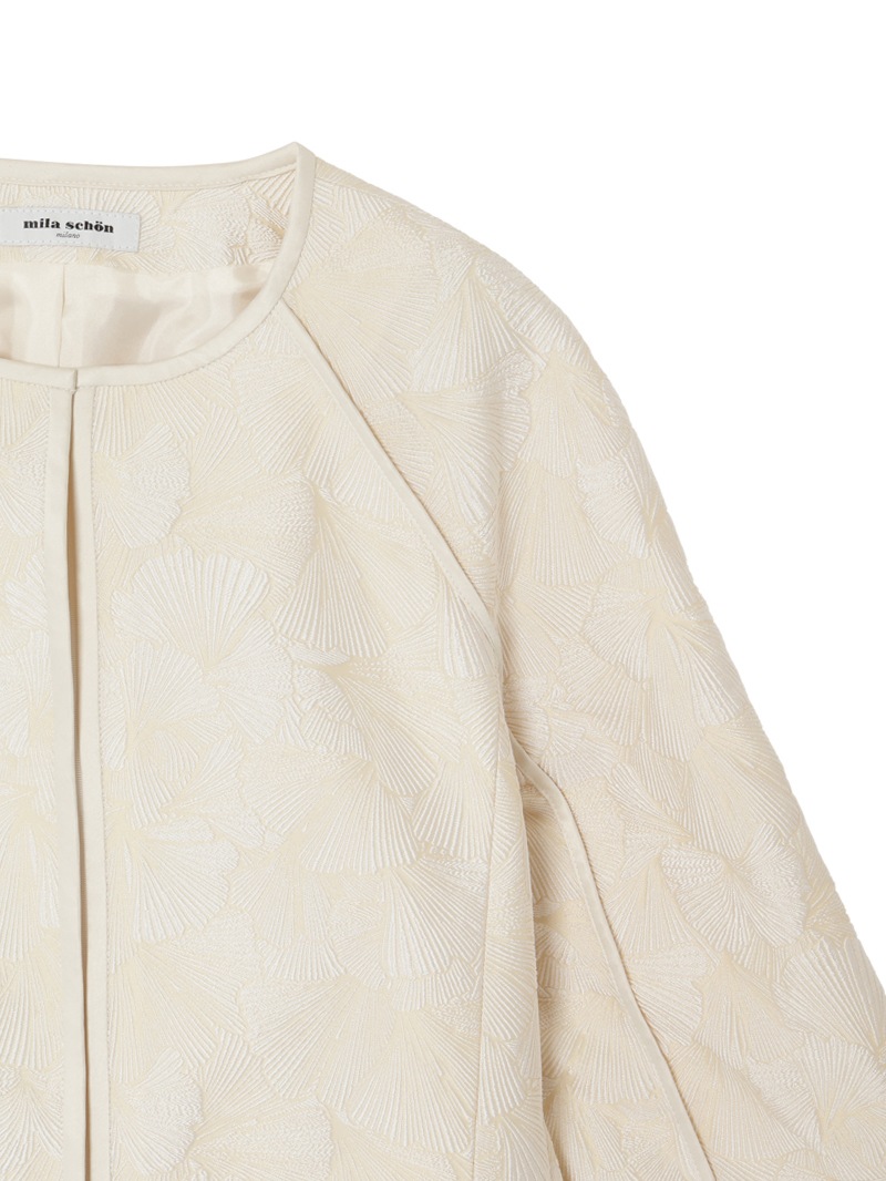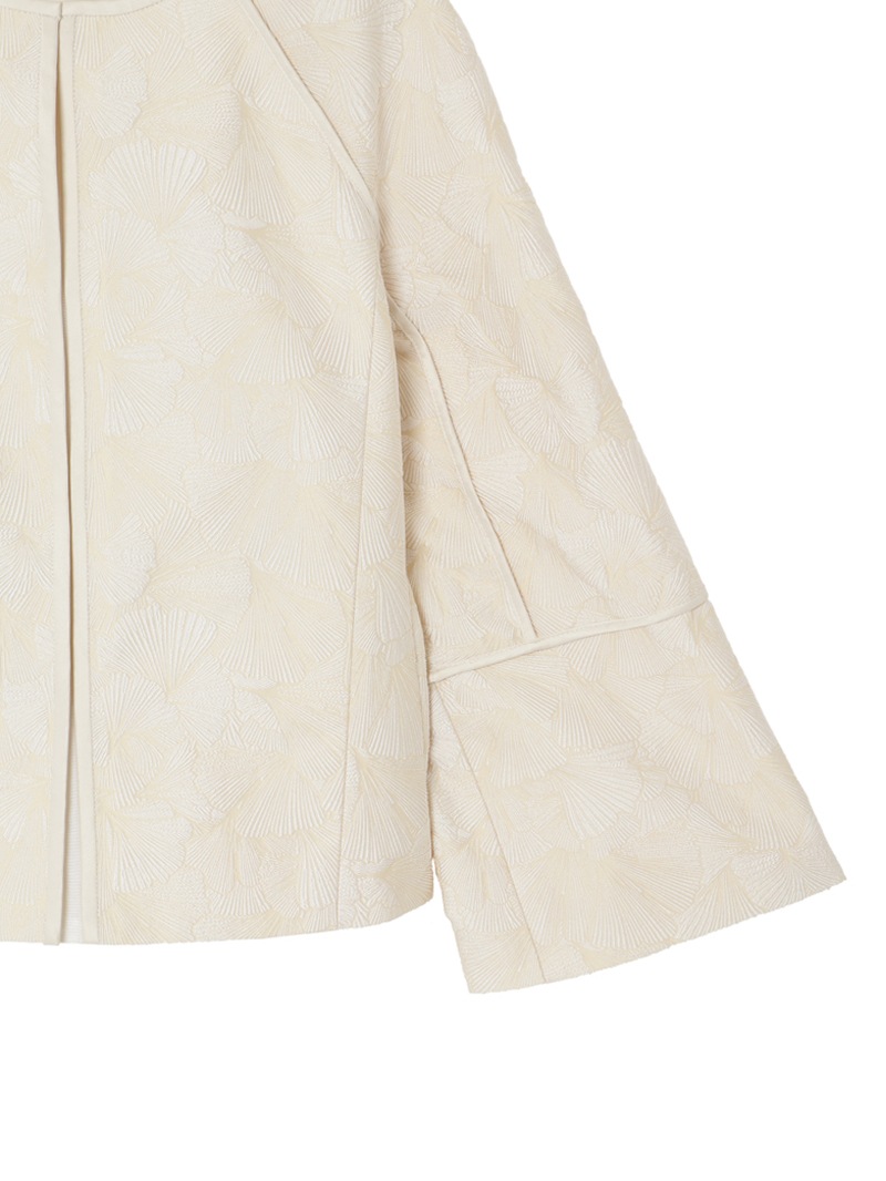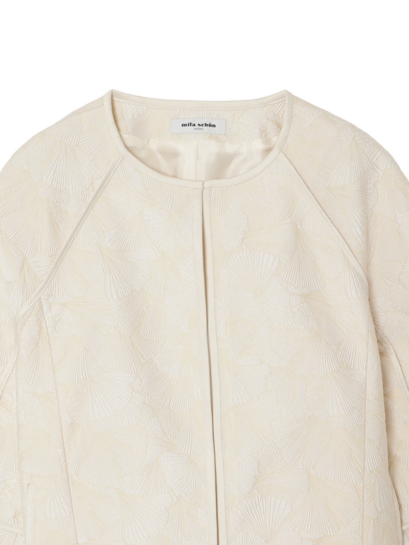 美しいシルクプリントや豪華な生地で知られるRATTI(ラッティ)社のリーフ柄ジャガード素材を使用したジャケット。繊細な柄ゆきと上品な光沢感が特徴です。同素材のスカートと合わせたセットアップでの着こなしもおすすめです。