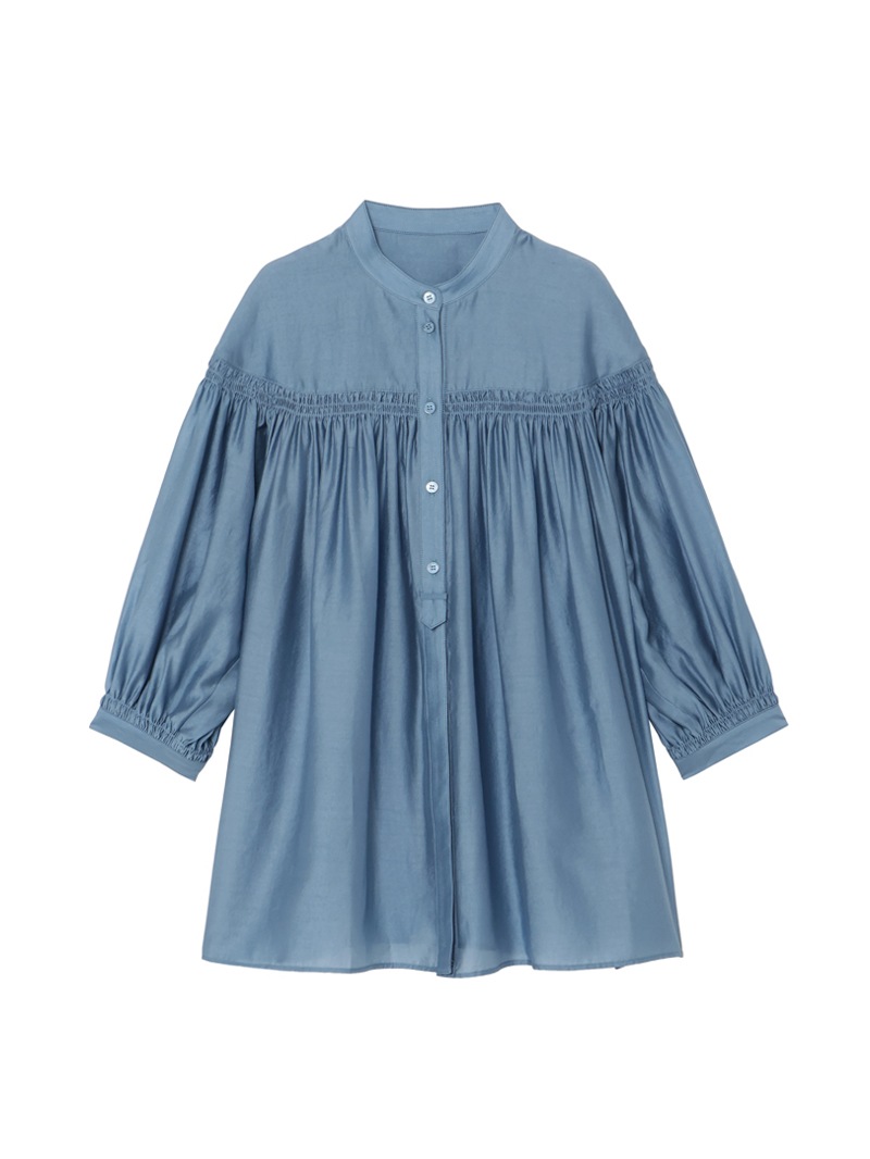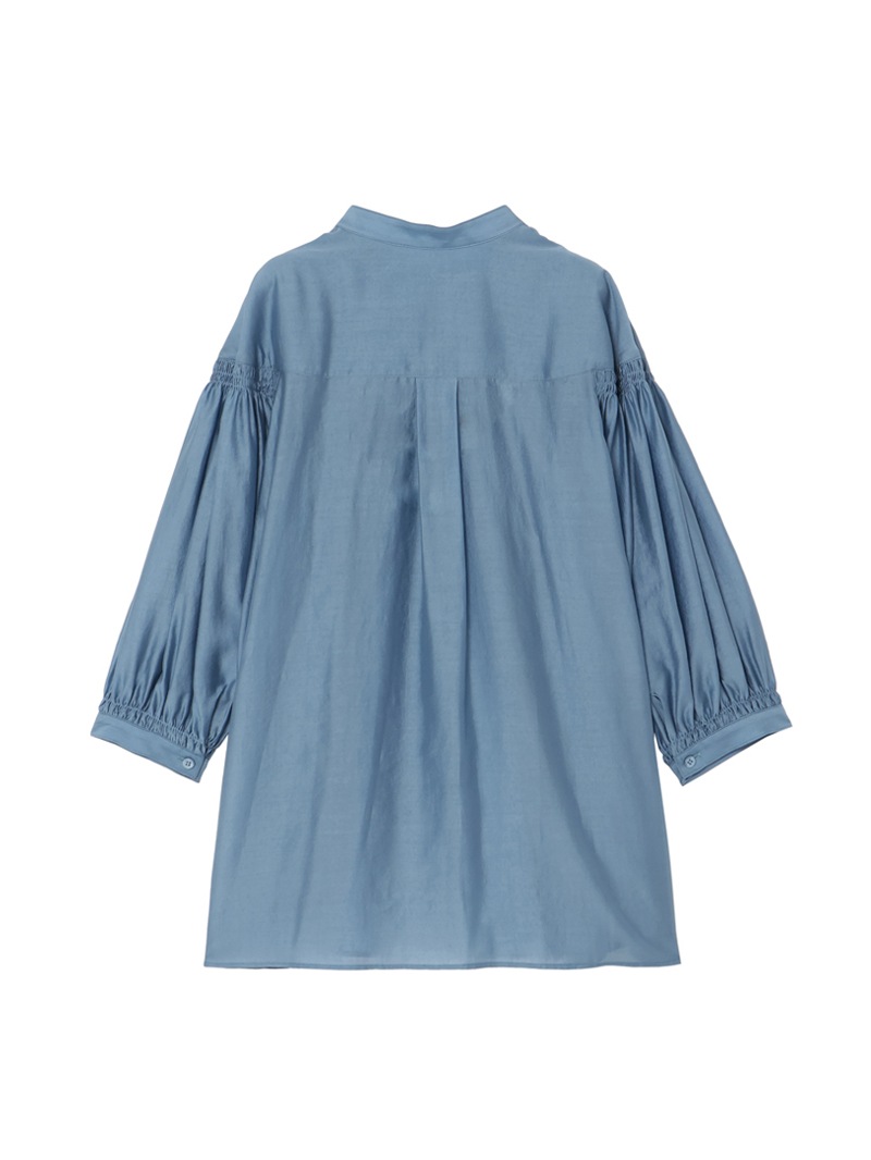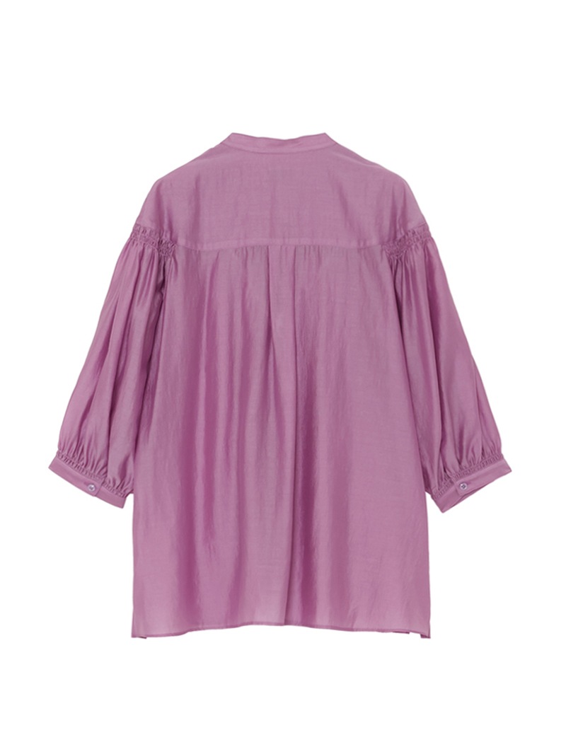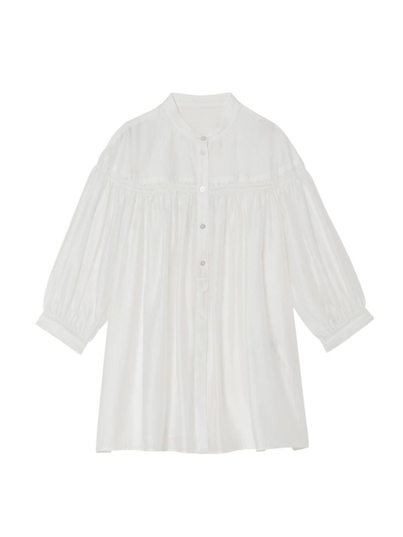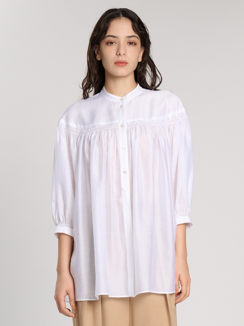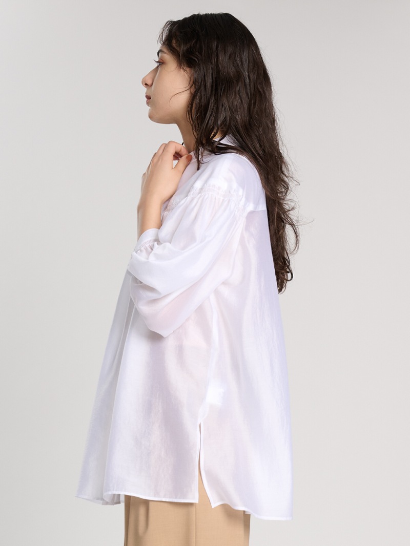透け感のあるシャツウエイト素材にバイオ加工を施し、よりパウダリーでソフトな風合いを引き出したブラウス。フィラメント交繊によって程よいシャイニー感も加わった、トレンドのシアー素材アイテムです。