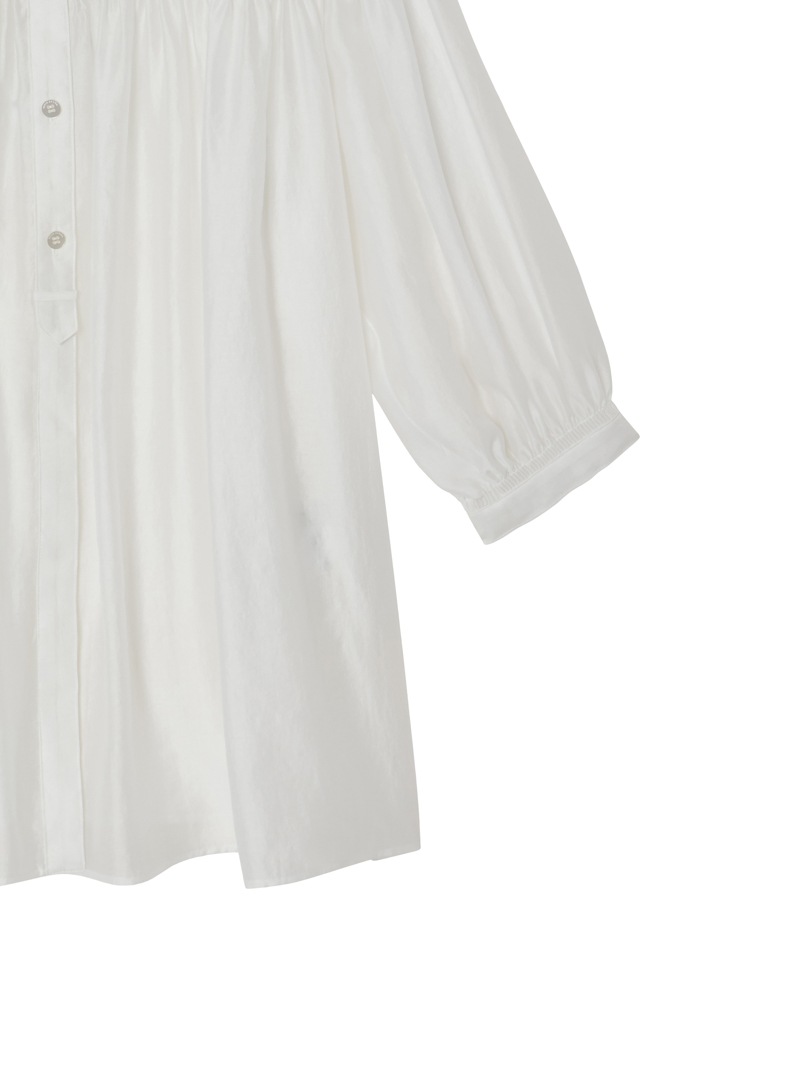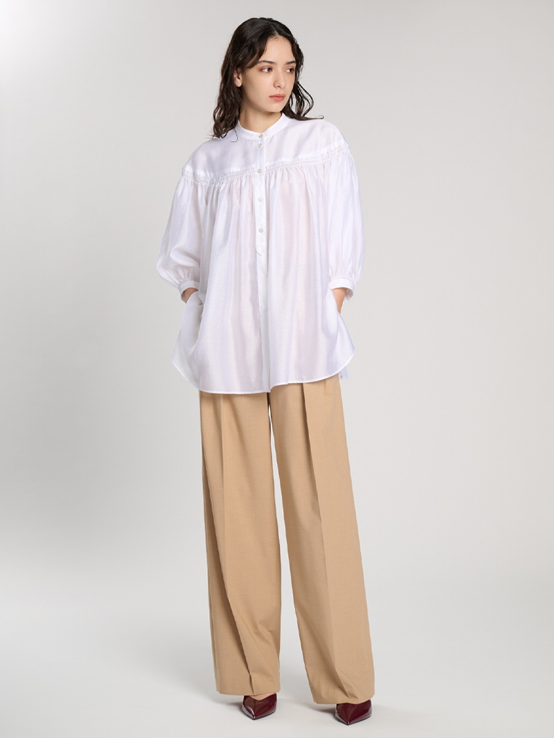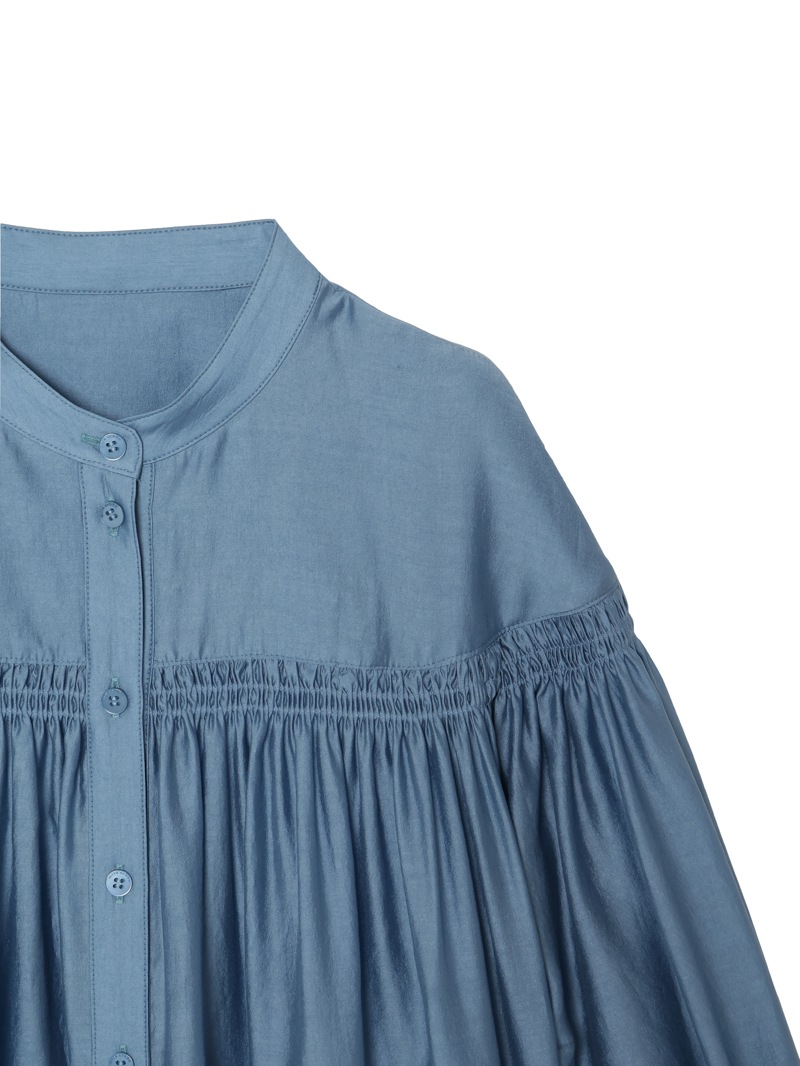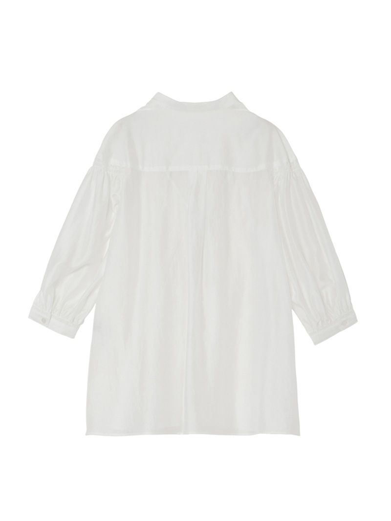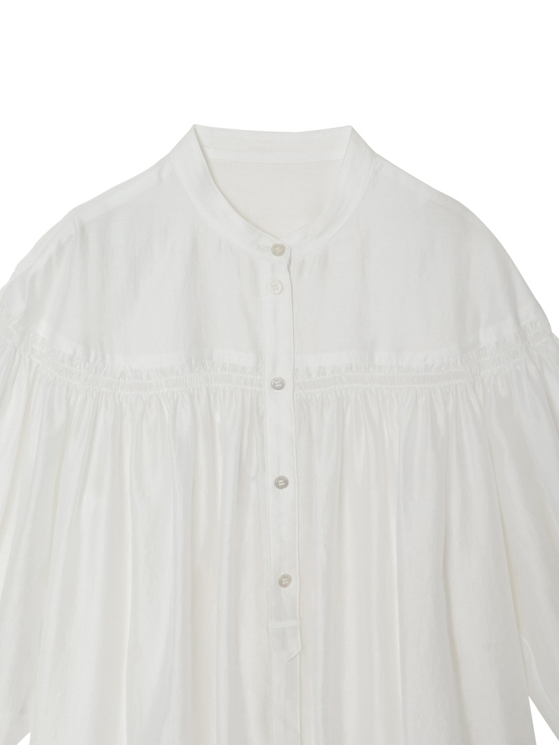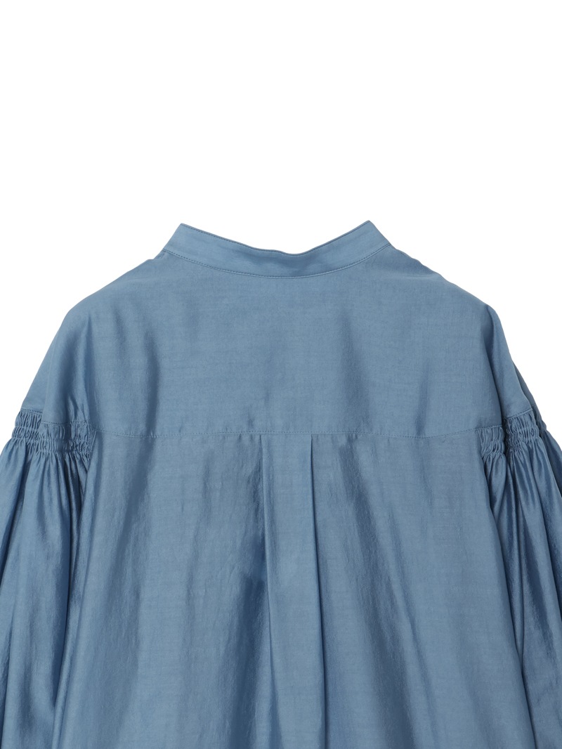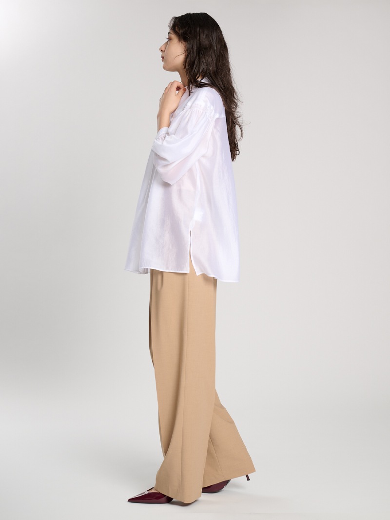 透け感のあるシャツウエイト素材にバイオ加工を施し、よりパウダリーでソフトな風合いを引き出したブラウス。フィラメント交繊によって程よいシャイニー感も加わった、トレンドのシアー素材アイテムです。