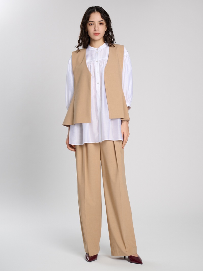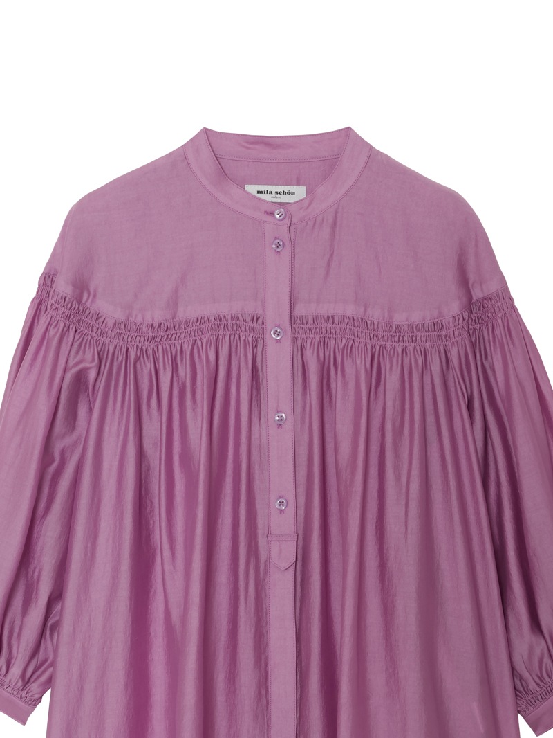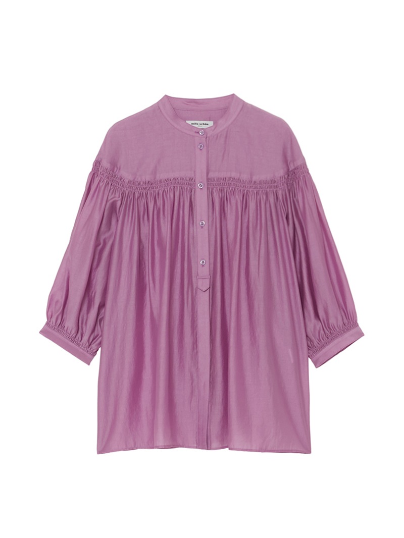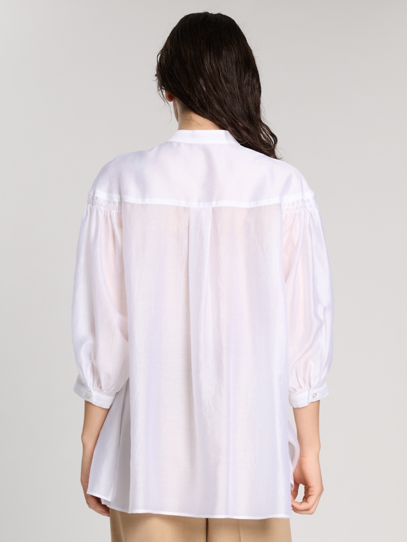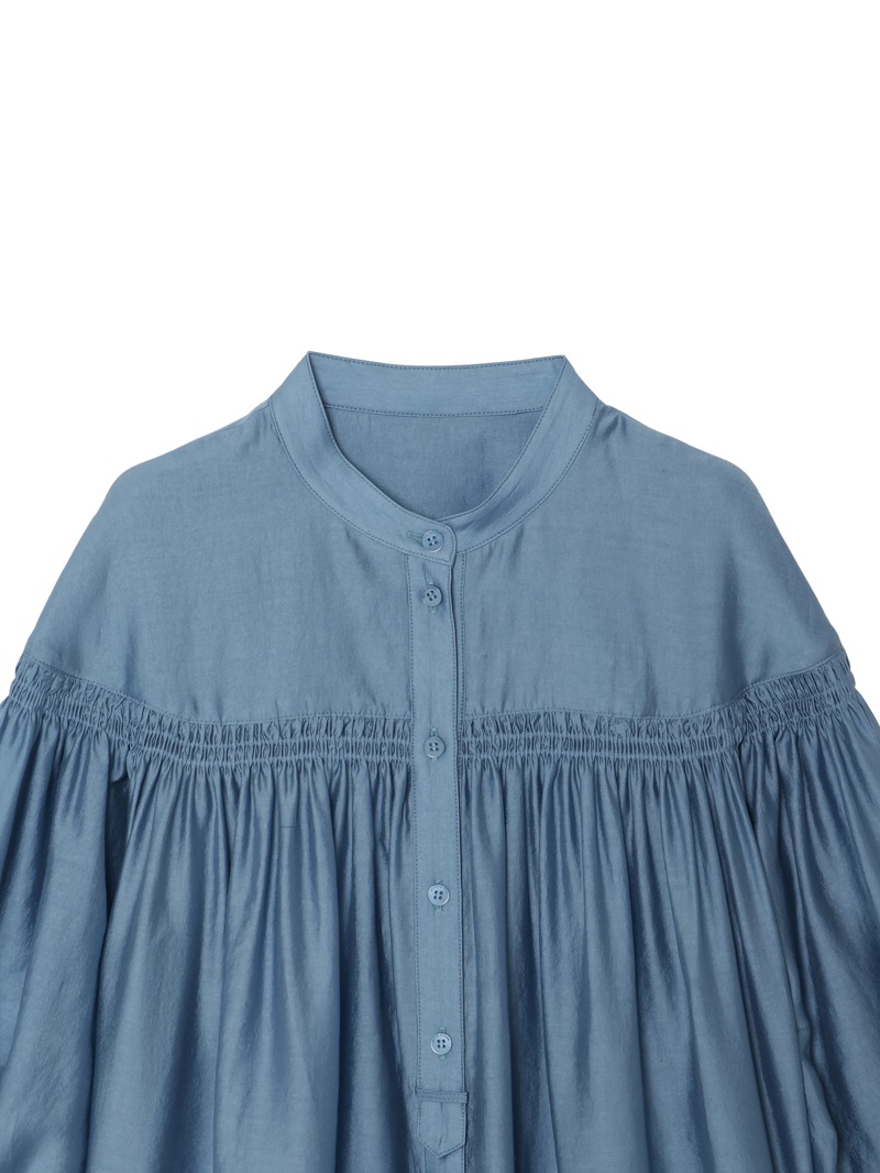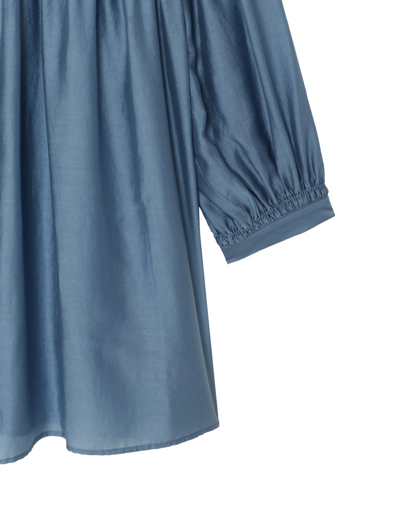 透け感のあるシャツウエイト素材にバイオ加工を施し、よりパウダリーでソフトな風合いを引き出したブラウス。フィラメント交繊によって程よいシャイニー感も加わった、トレンドのシアー素材アイテムです。