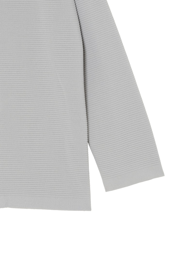 細番手ウールと弱ストレッチポリエステルを交撚した素材で仕立てたニットジャケット。細い糸を使用しハイゲージで編み立てることで、厚みが出やすいミラノリブやタック柄も軽やかに薄く仕上がります。ポリエステルの光沢とウールの保温性を兼ね備えた素材感。シンプルなデザインでコーディネートにも取り入れやすい一着です。