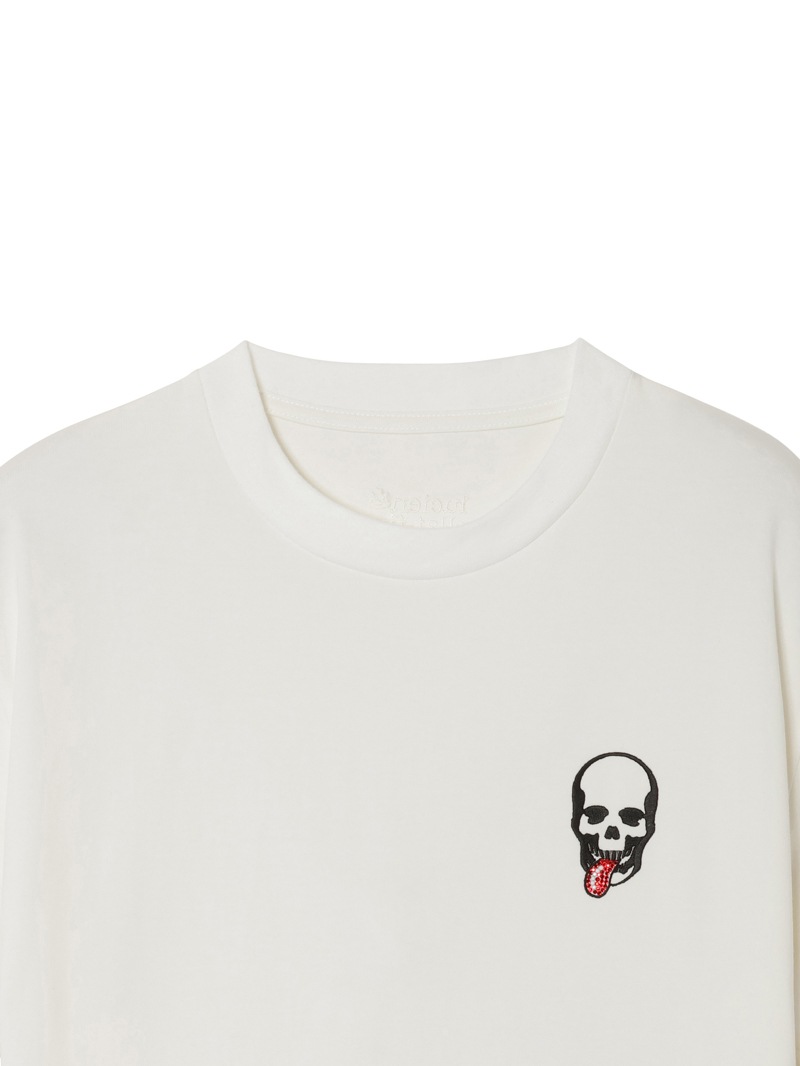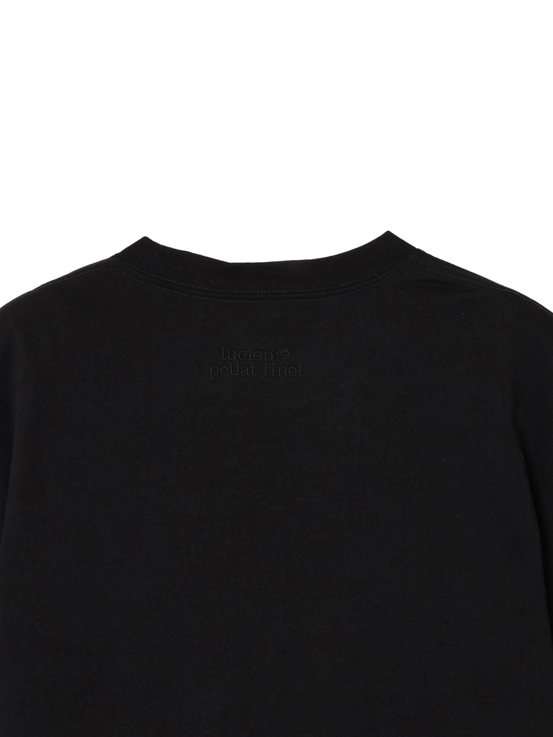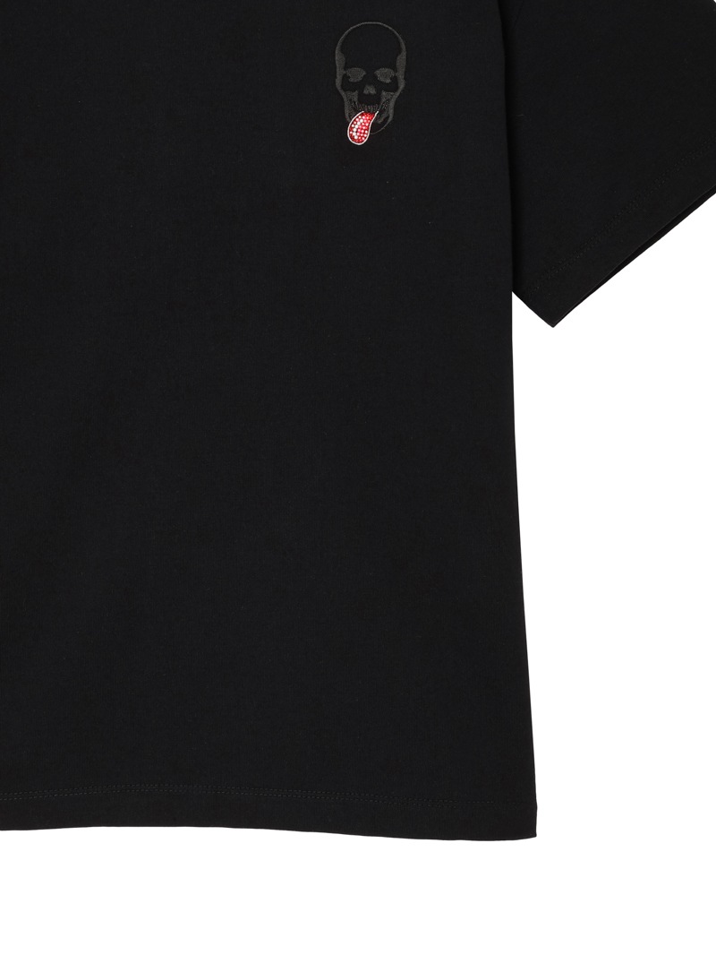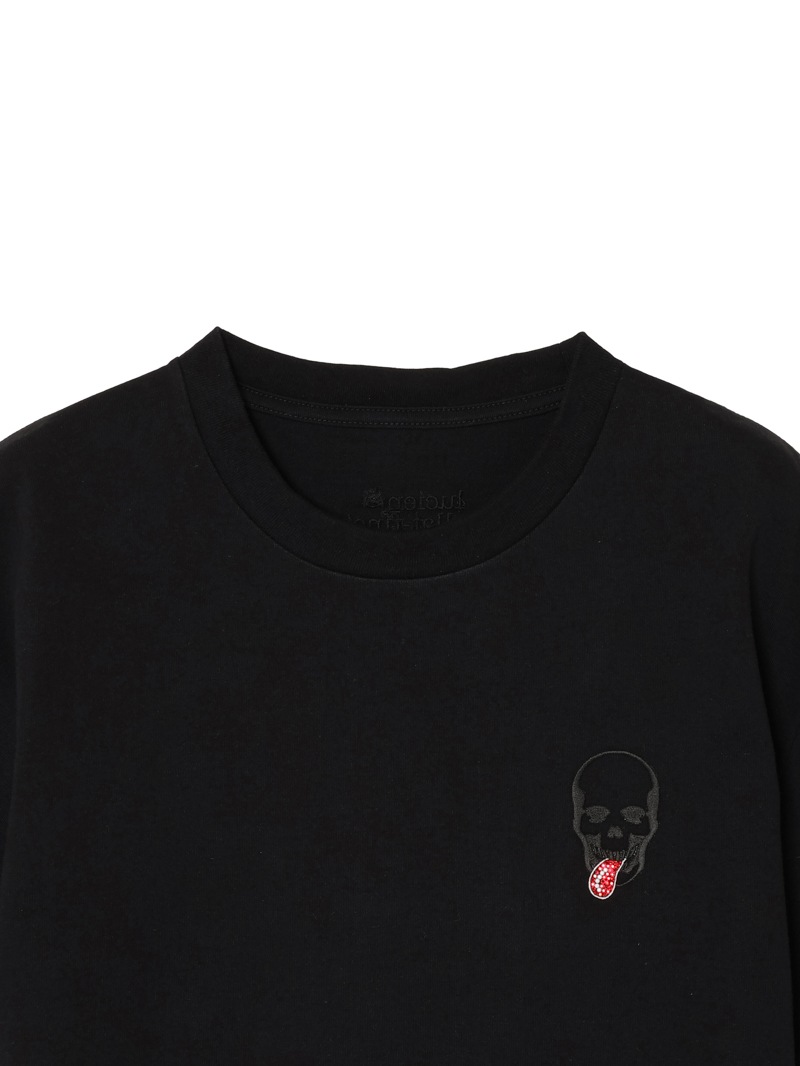 しっかりとした肉厚感のあるTシャツ。左胸にスカル・タンを配置し、タン部分にはクリスタルを使用。首元部分にはlucien pellat-finetロゴを刺繍で表現。目が詰まっており型崩れしにくく、纏わりつきを抑えられていることが特徴的な素材。ハリ感のある生地に仕上げている。