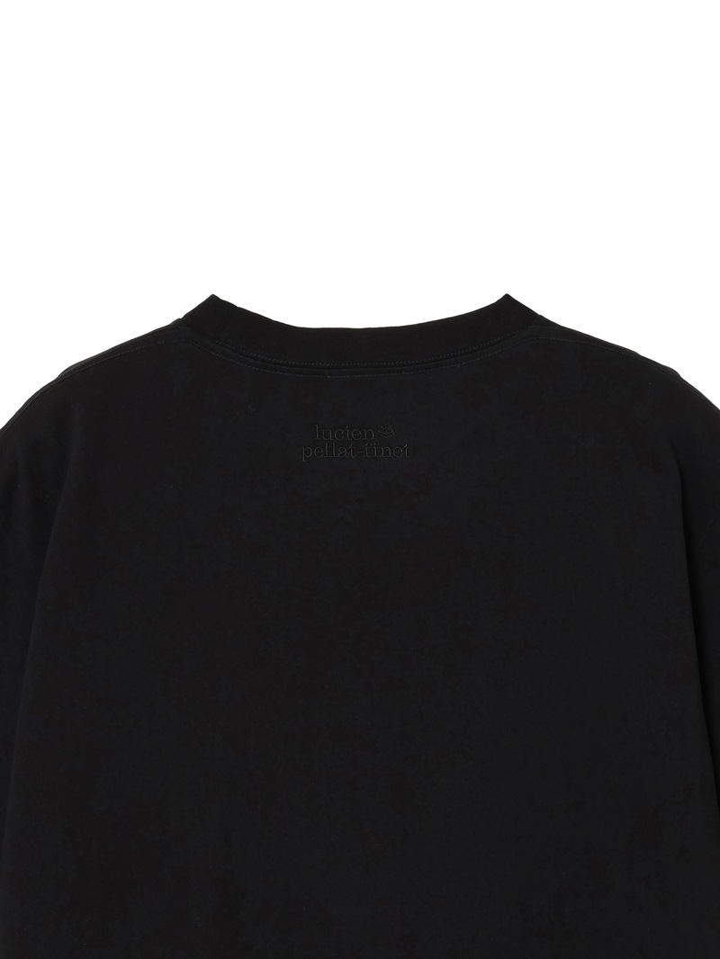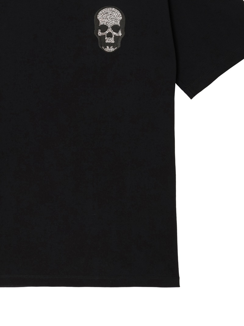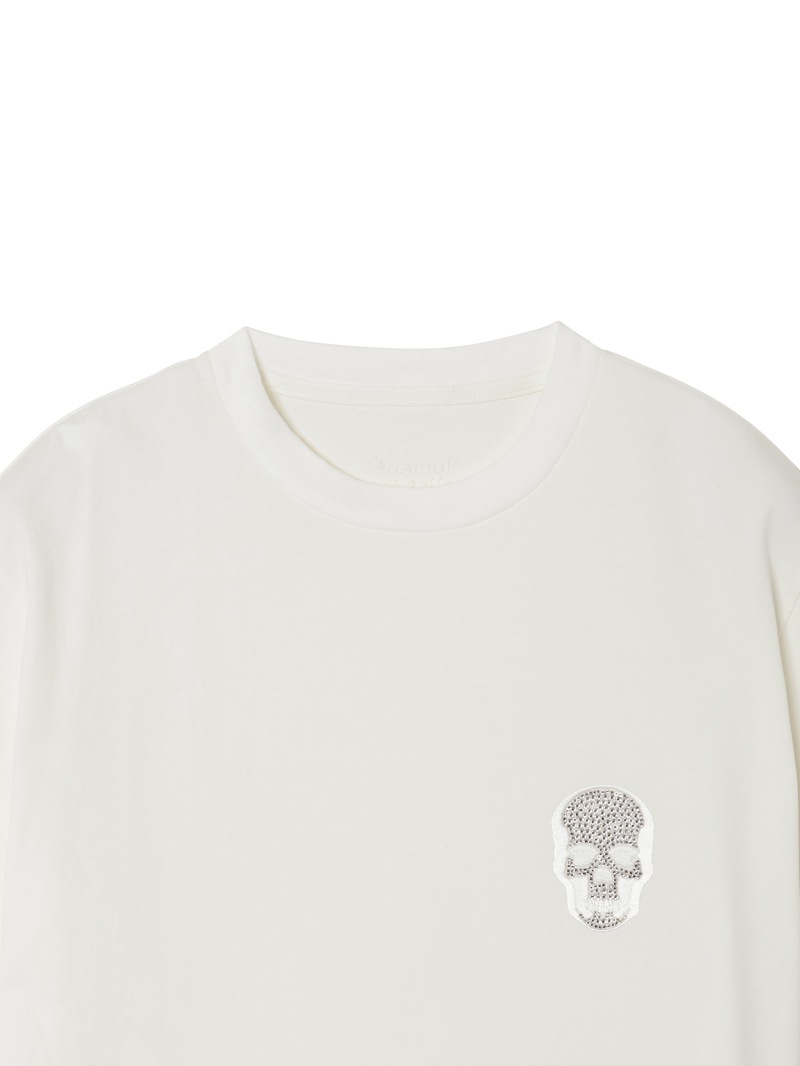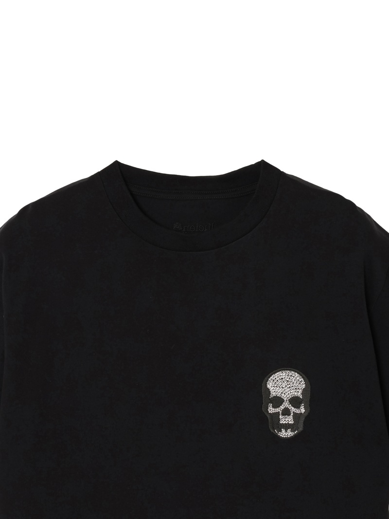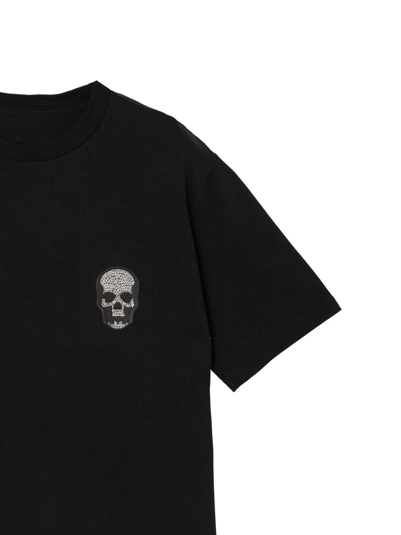 しっかりとした肉厚感のあるTシャツ。左胸にスカルを配置し、スカルの内側にはクリスタルを埋め尽くしたデザイン。首元部分にはlucien pellat-finetロゴを刺繍で表現。目が詰まっており型崩れしにくく、纏わりつきを抑えられていることが特徴的な素材。ハリ感のある生地に仕上げている。