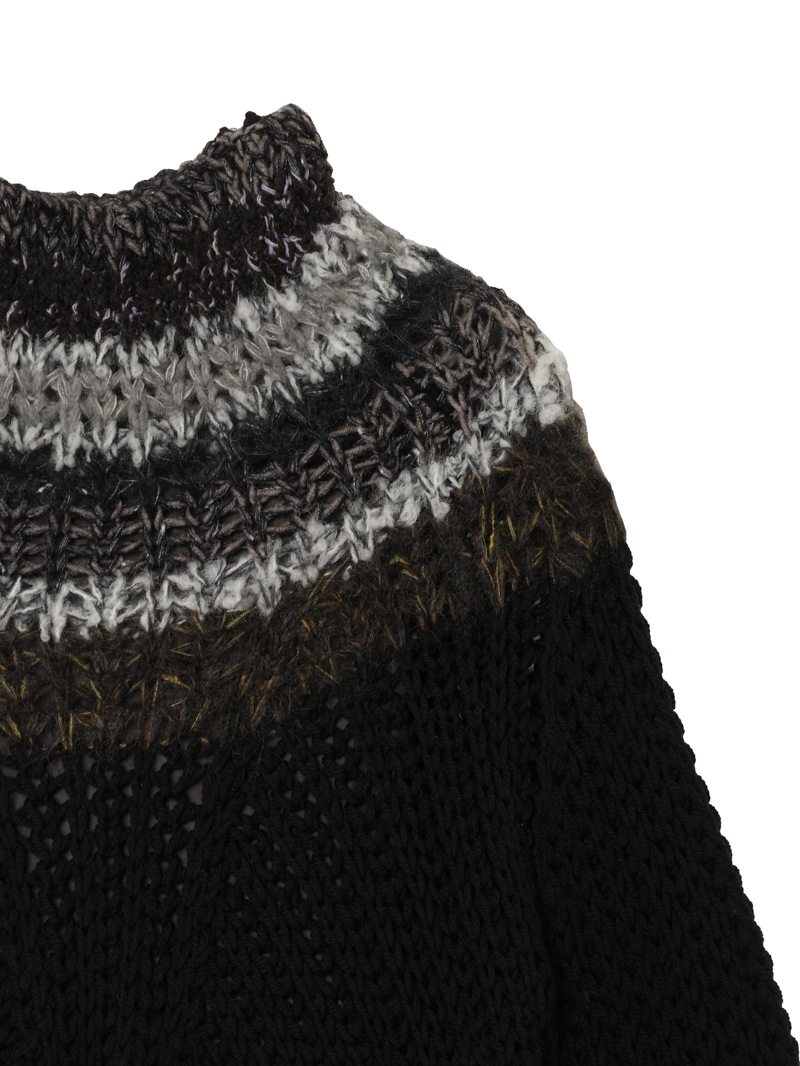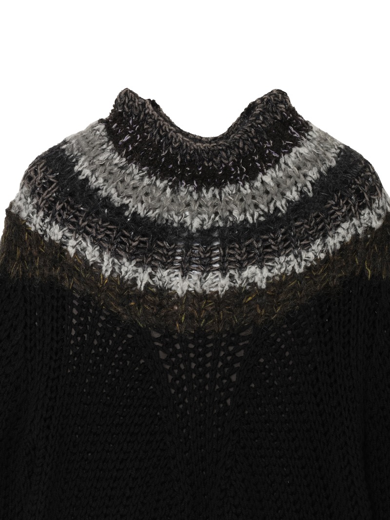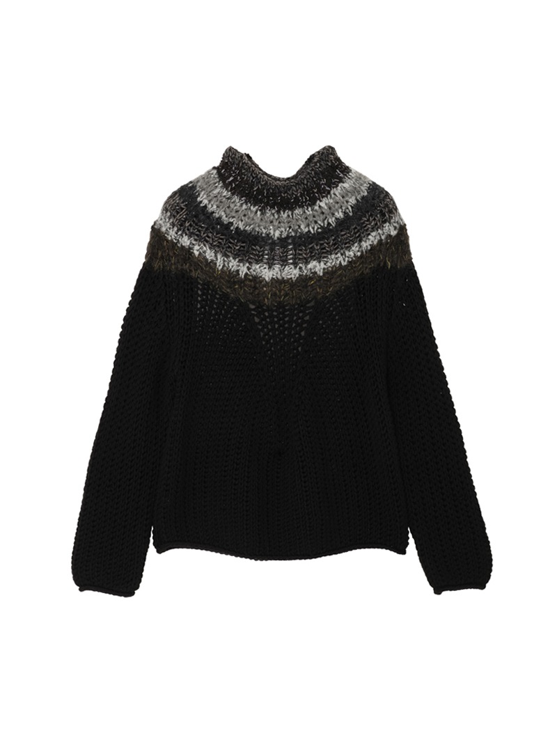 襟元は再生糸をミックスして編み上げたリブ仕立てのトリコットセーター。ユニークな風合いと温かみのある素材感が魅力の一枚です。