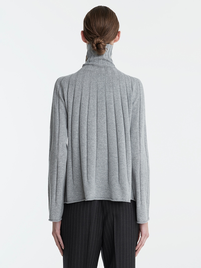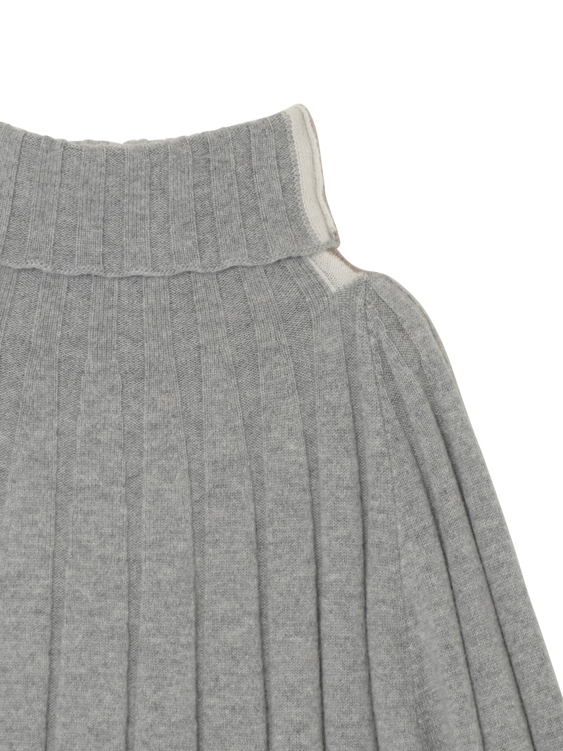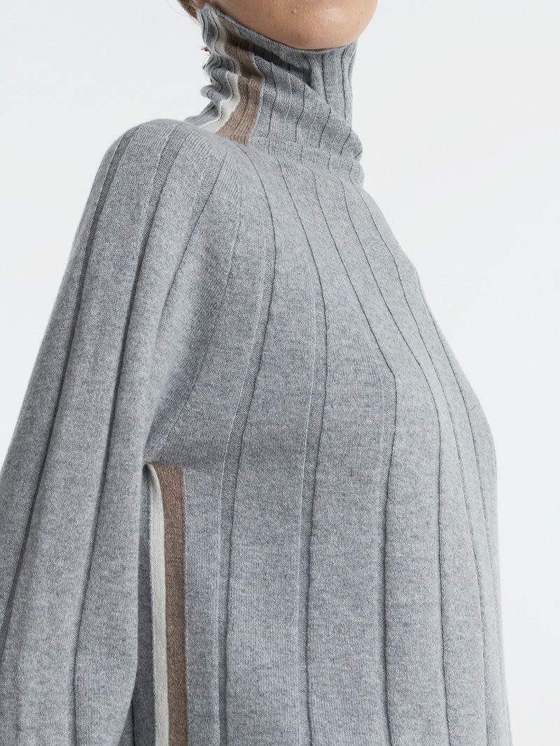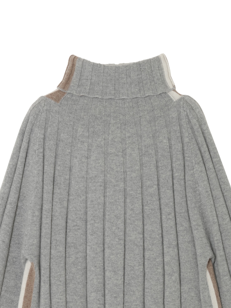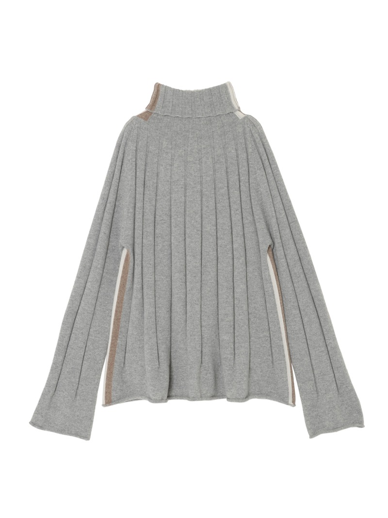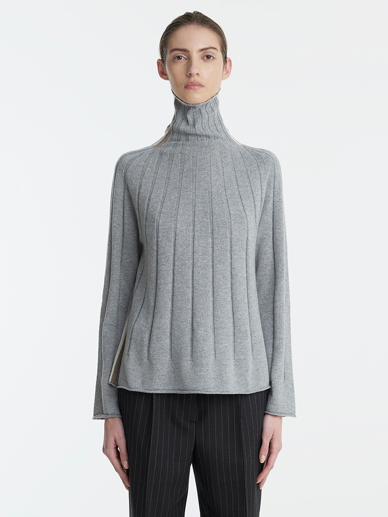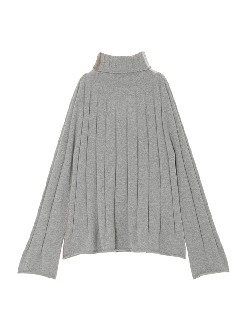 大きなリブ編みが印象的なカシミヤ100%ニットプルオーバー。首元のバイカラーラインがさり気ないアクセントに。袖と裾はゆったりフレアなシルエットで柔らかい印象を与えます。