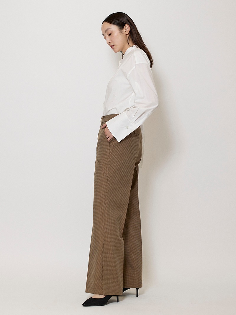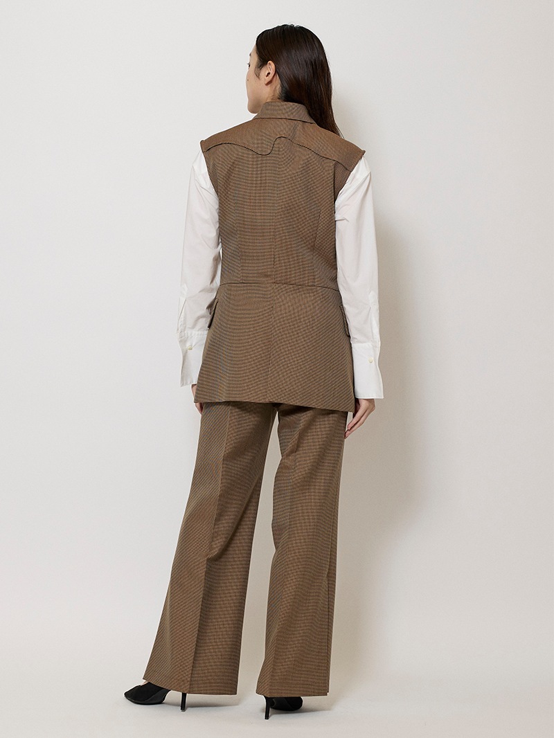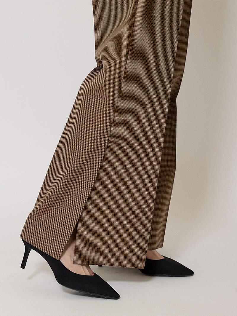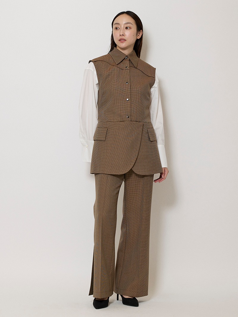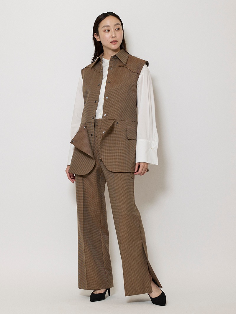 メンズライクなウール混素材を使用した細やかなチェックのストレートパンツ。70年代のアートやカルチャーをイメージさせる美しい曲線の切り替え、深くサイドに入ったスリットがポイント。同素材のノースリーブジャケットと合わせてセットアップとして着用可能です。