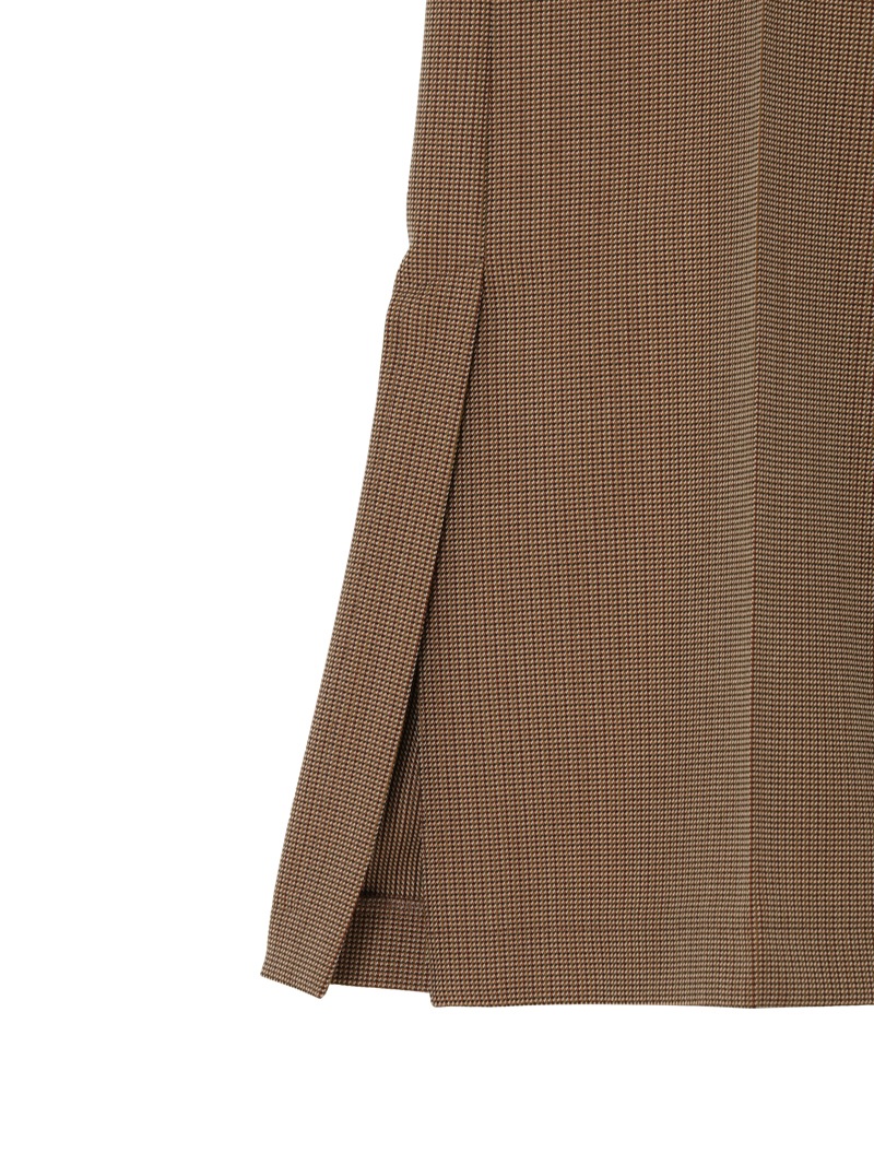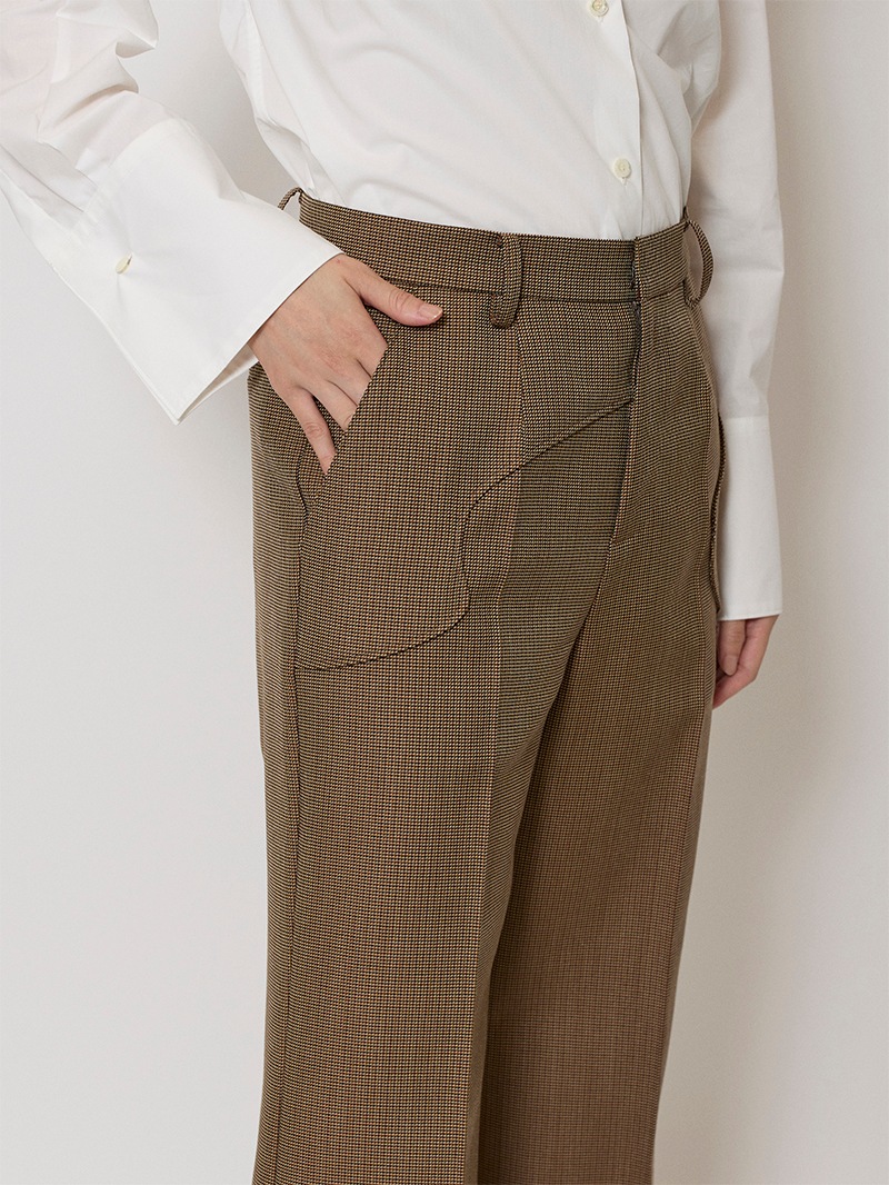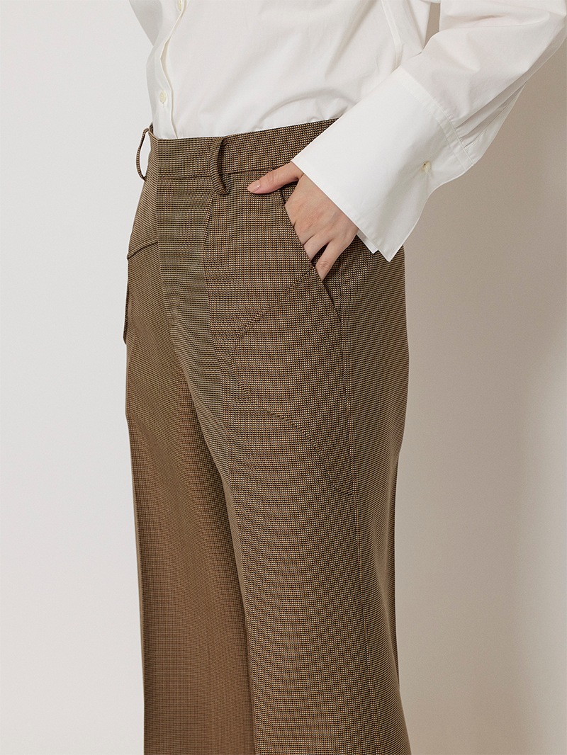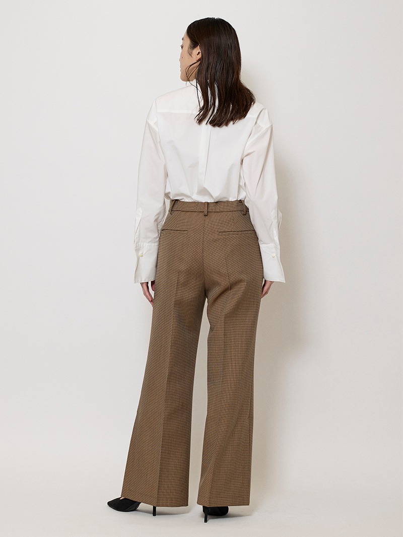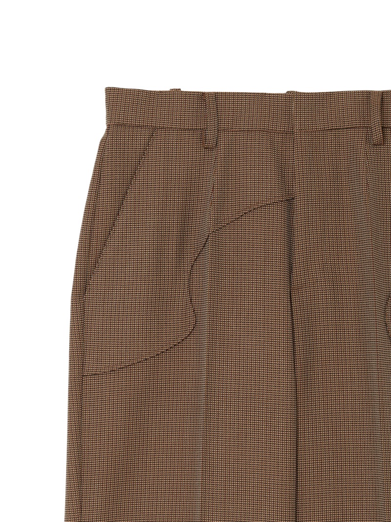 メンズライクなウール混素材を使用した細やかなチェックのストレートパンツ。70年代のアートやカルチャーをイメージさせる美しい曲線の切り替え、深くサイドに入ったスリットがポイント。同素材のノースリーブジャケットと合わせてセットアップとして着用可能です。