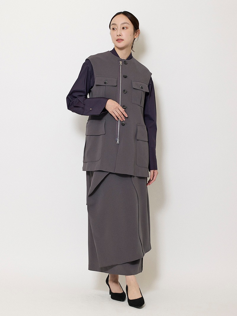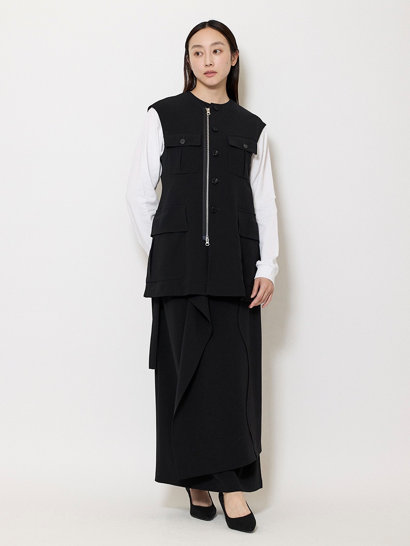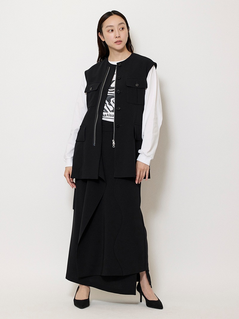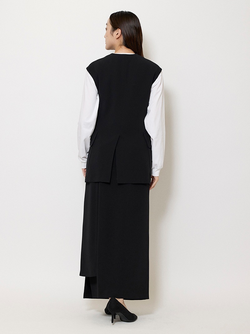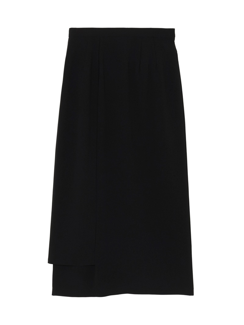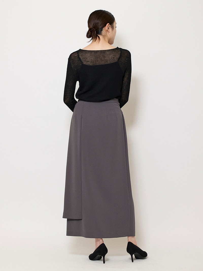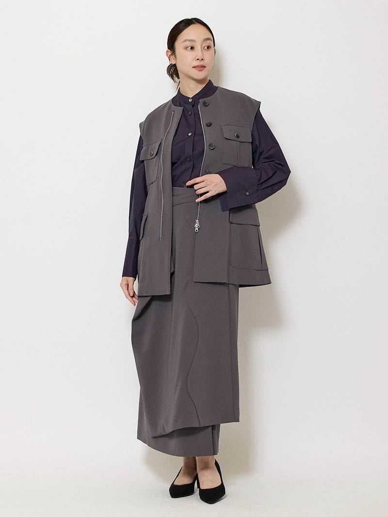 ファーストコレクションから好評のラップスカートを、より穿きやすく上品にアップデート。生地をたっぷり使用した軽いフレアラインのスカートの上にラップ風ディテールを重ねたデザイン。落ち感のあるジョーゼットを贅沢に使いながらもすっきりとしたシルエットに。シンプルなトップスを引き立てる大人な一枚。同素材のベストともセットアップで着用可能。