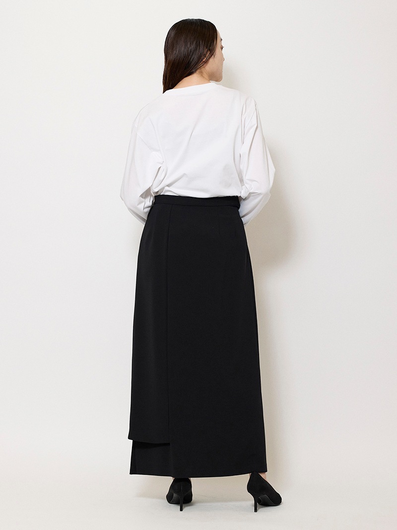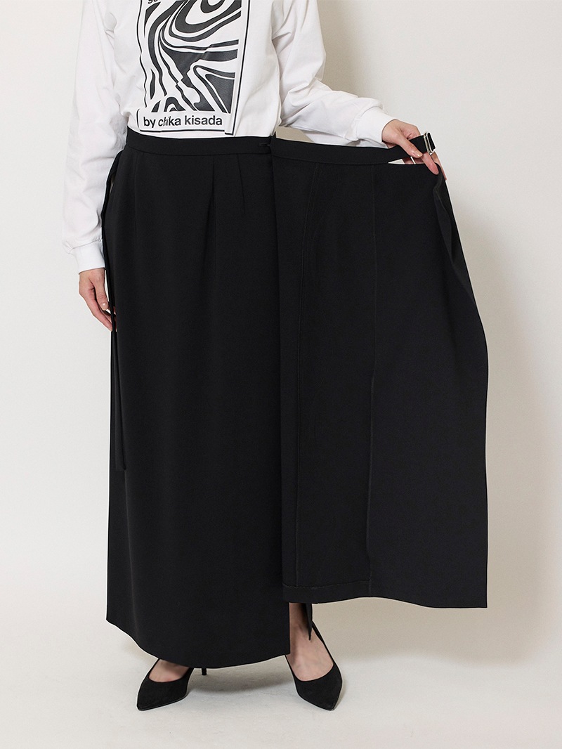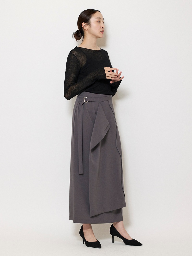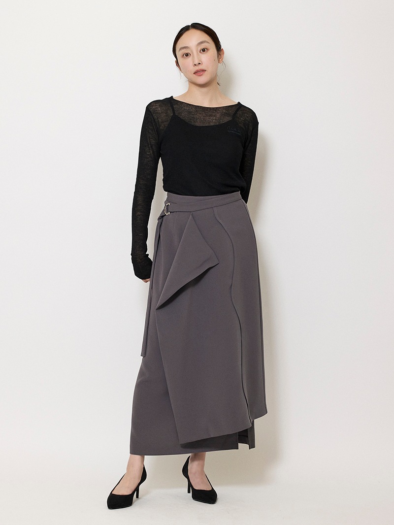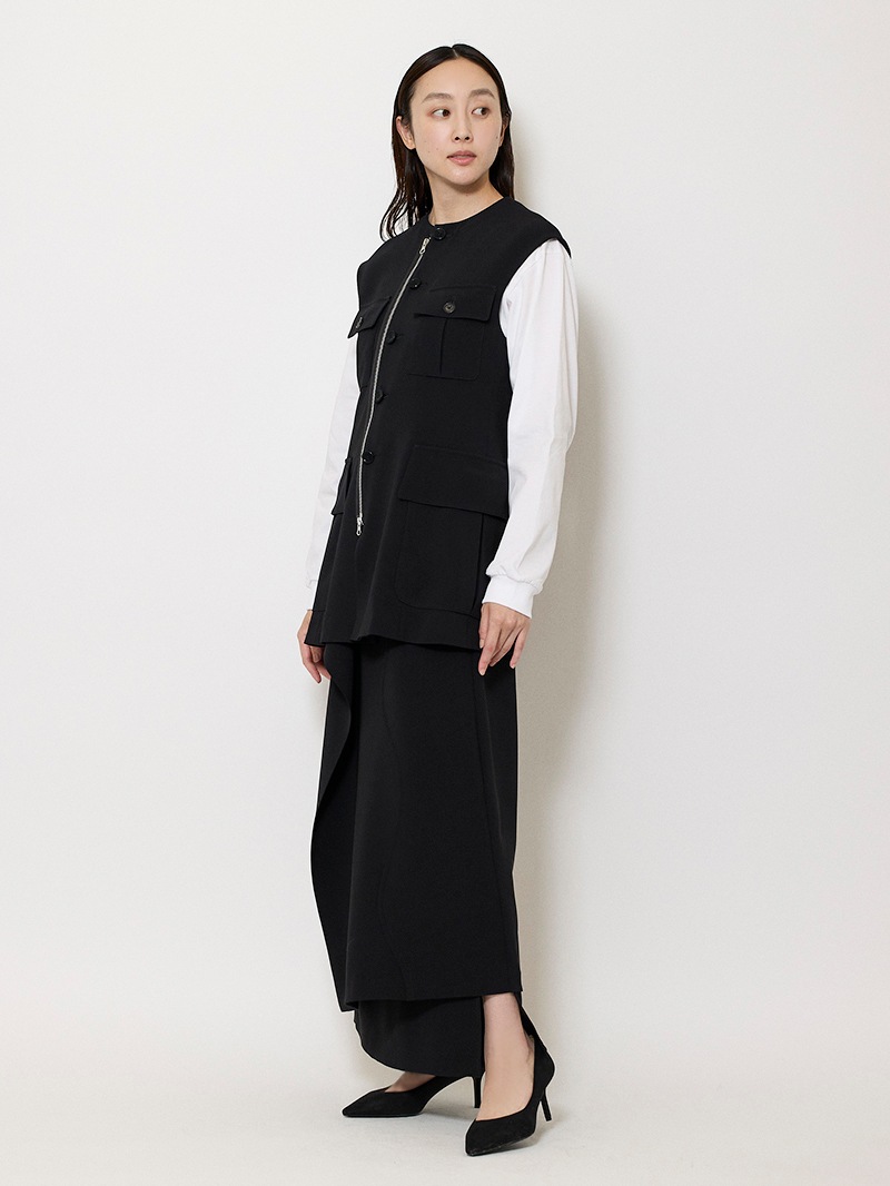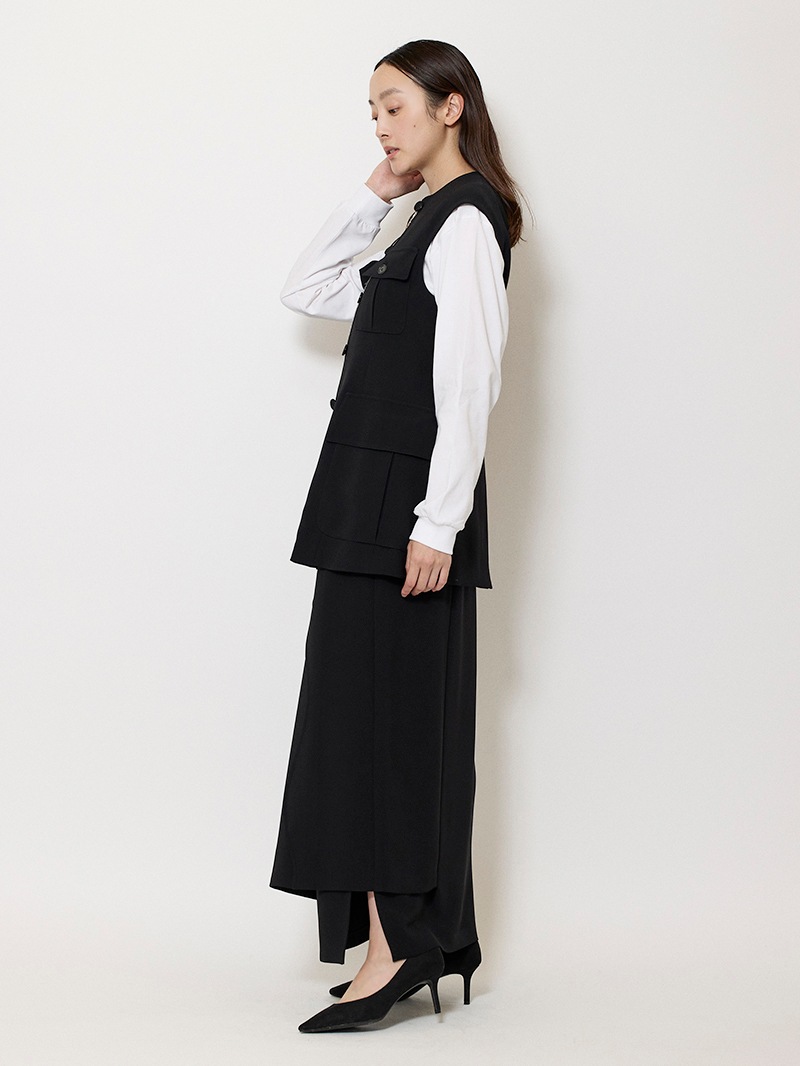 ファーストコレクションから好評のラップスカートを、より穿きやすく上品にアップデート。生地をたっぷり使用した軽いフレアラインのスカートの上にラップ風ディテールを重ねたデザイン。落ち感のあるジョーゼットを贅沢に使いながらもすっきりとしたシルエットに。シンプルなトップスを引き立てる大人な一枚。同素材のベストともセットアップで着用可能。