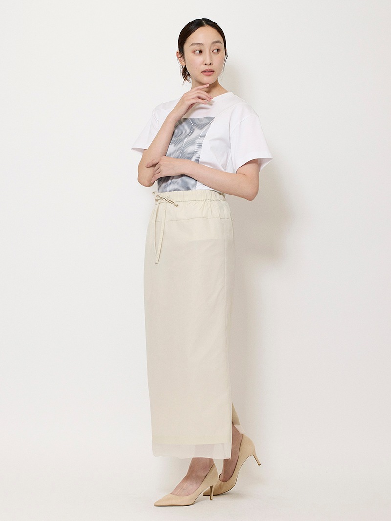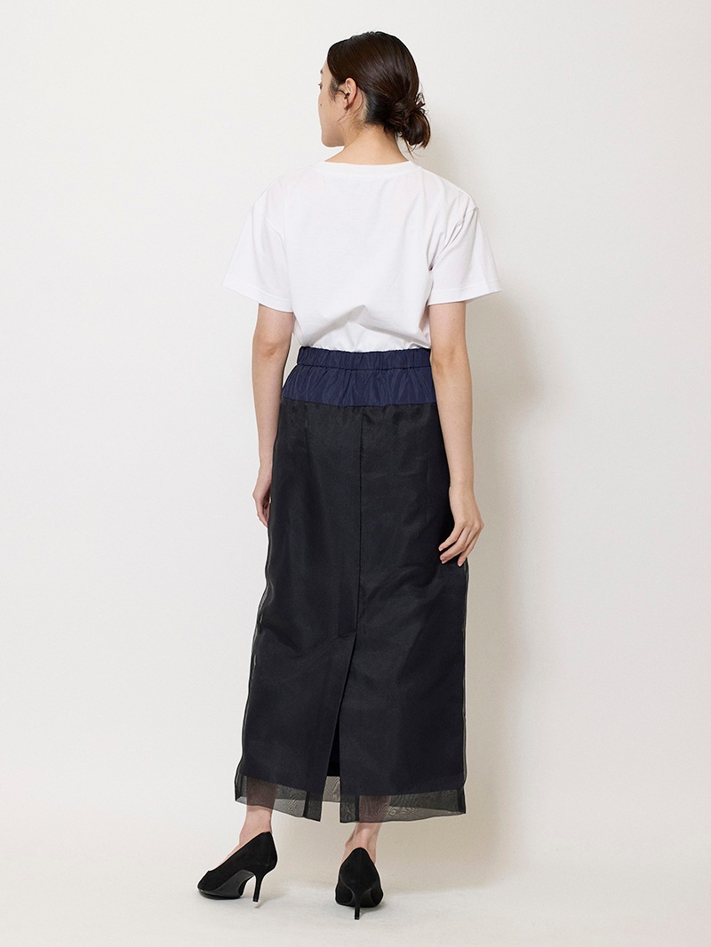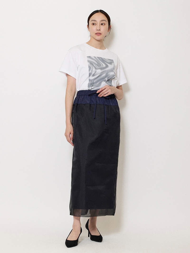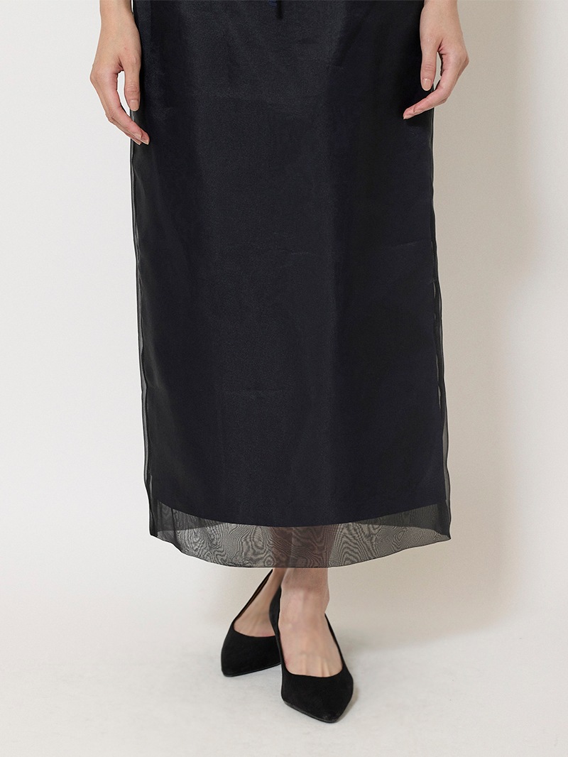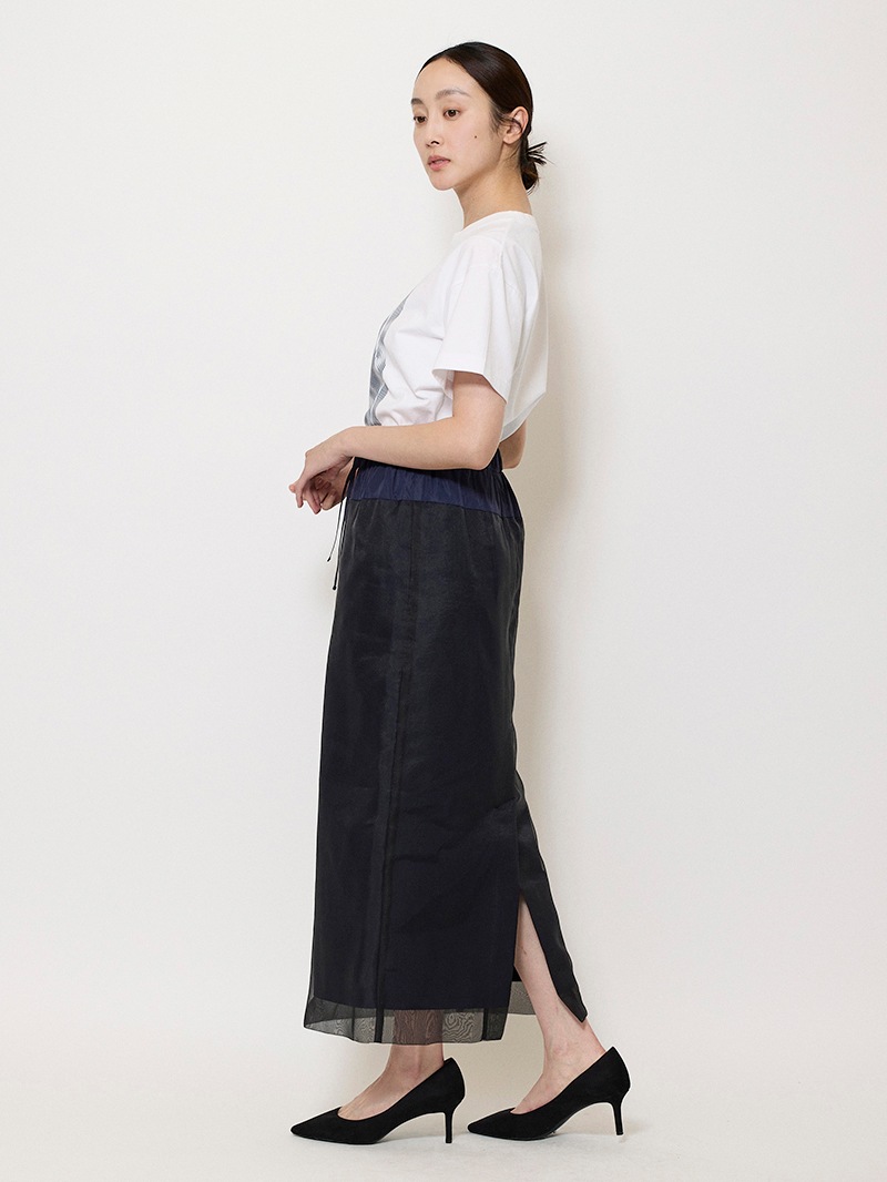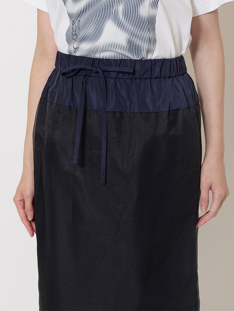 繊細なオーガンジーとマットな光沢のあるタフタ素材を重ねたレイヤードタイトスカート。ウエストの切り替えと、タフタのドローコードがアクセントに。同素材のブラウスと合わせてセットアップとして着用可能。