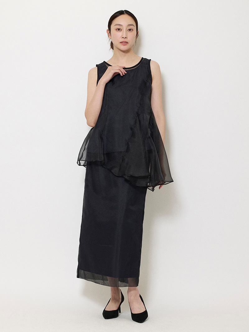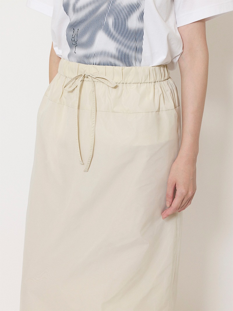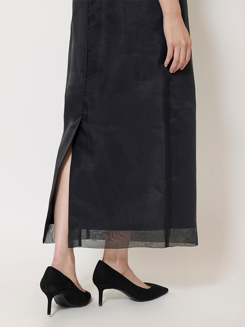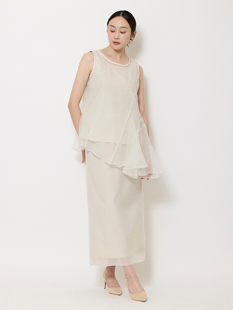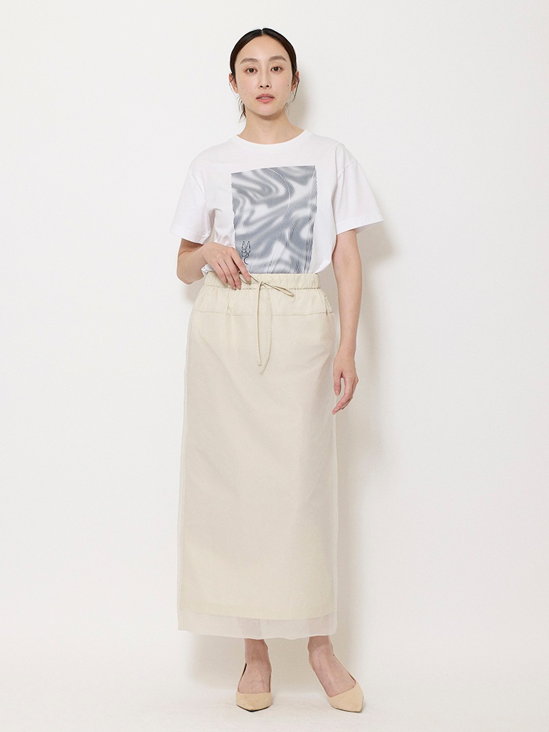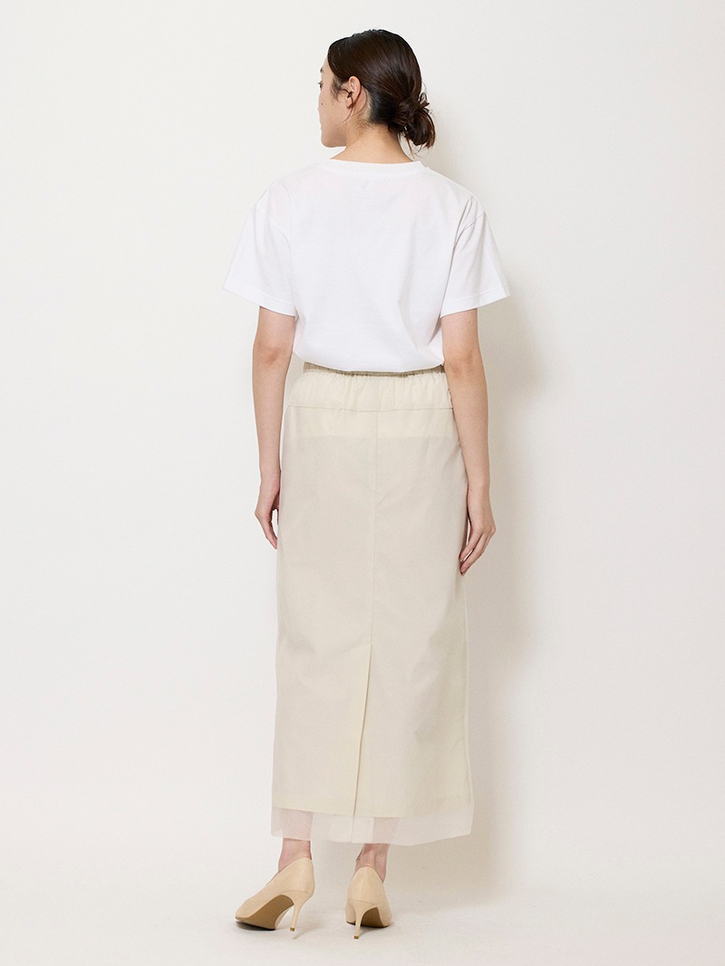 繊細なオーガンジーとマットな光沢のあるタフタ素材を重ねたレイヤードタイトスカート。ウエストの切り替えと、タフタのドローコードがアクセントに。同素材のブラウスと合わせてセットアップとして着用可能。